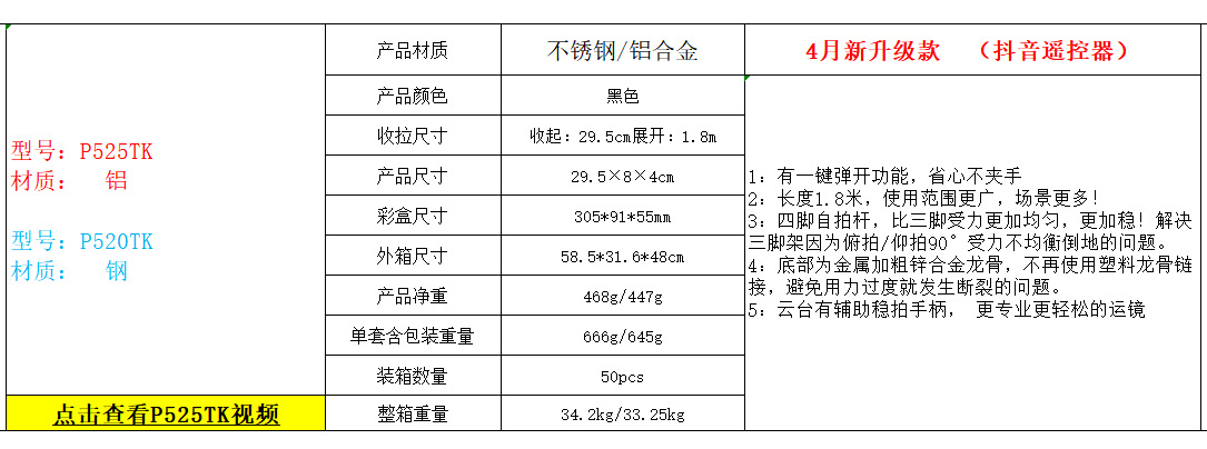 • P520TK【1.8m + 스테인레스 스틸 튜브 + 원클릭 팝업 삼각대 + 충전 Douyin 리모컨 + 보관 가방】
