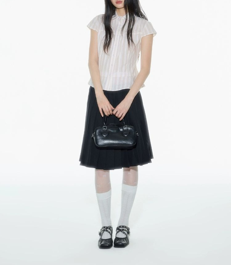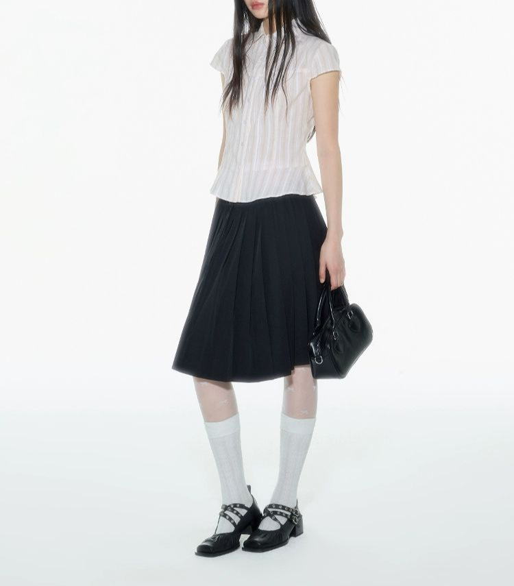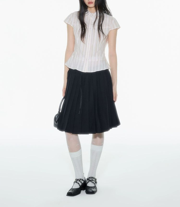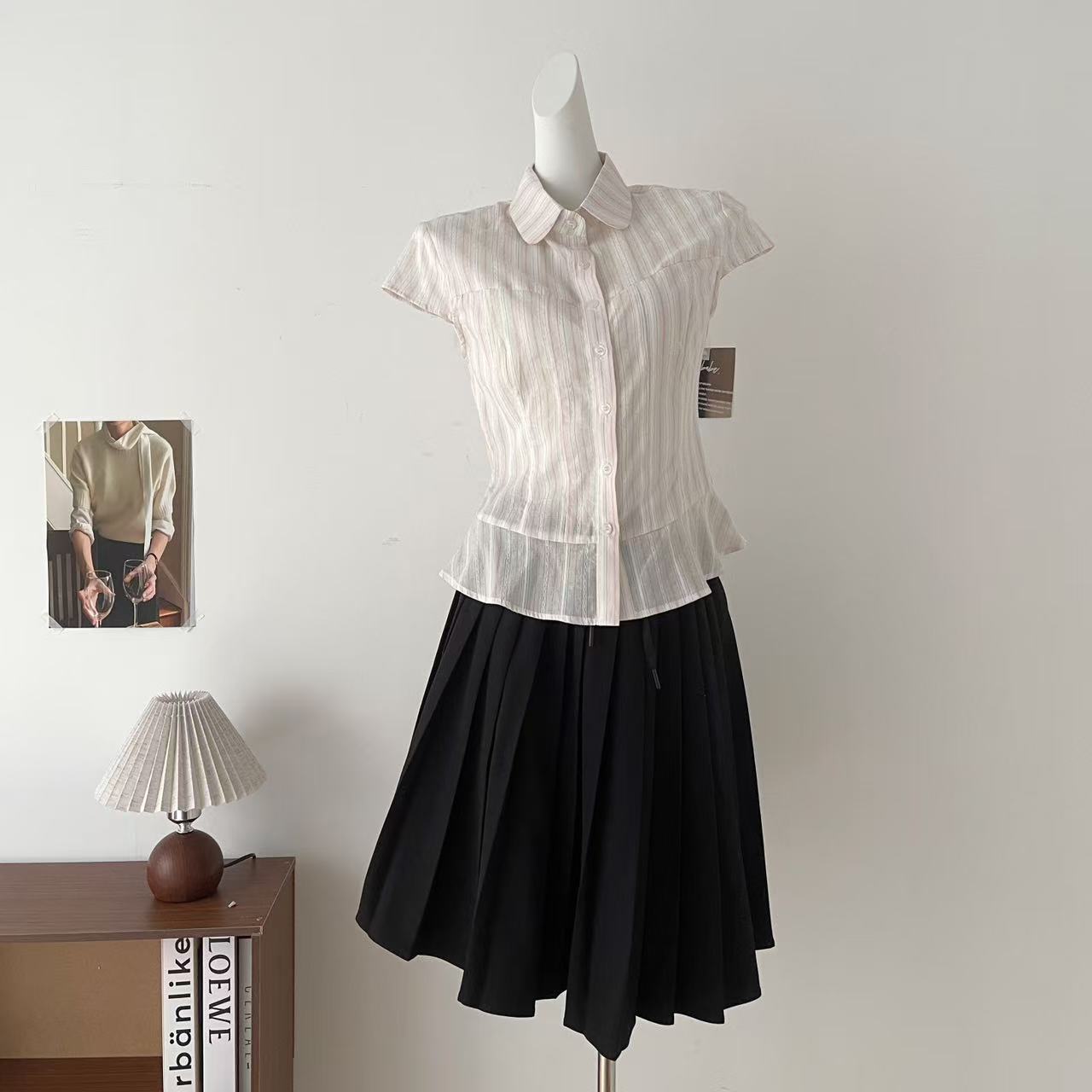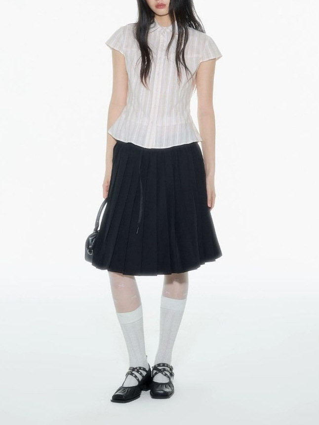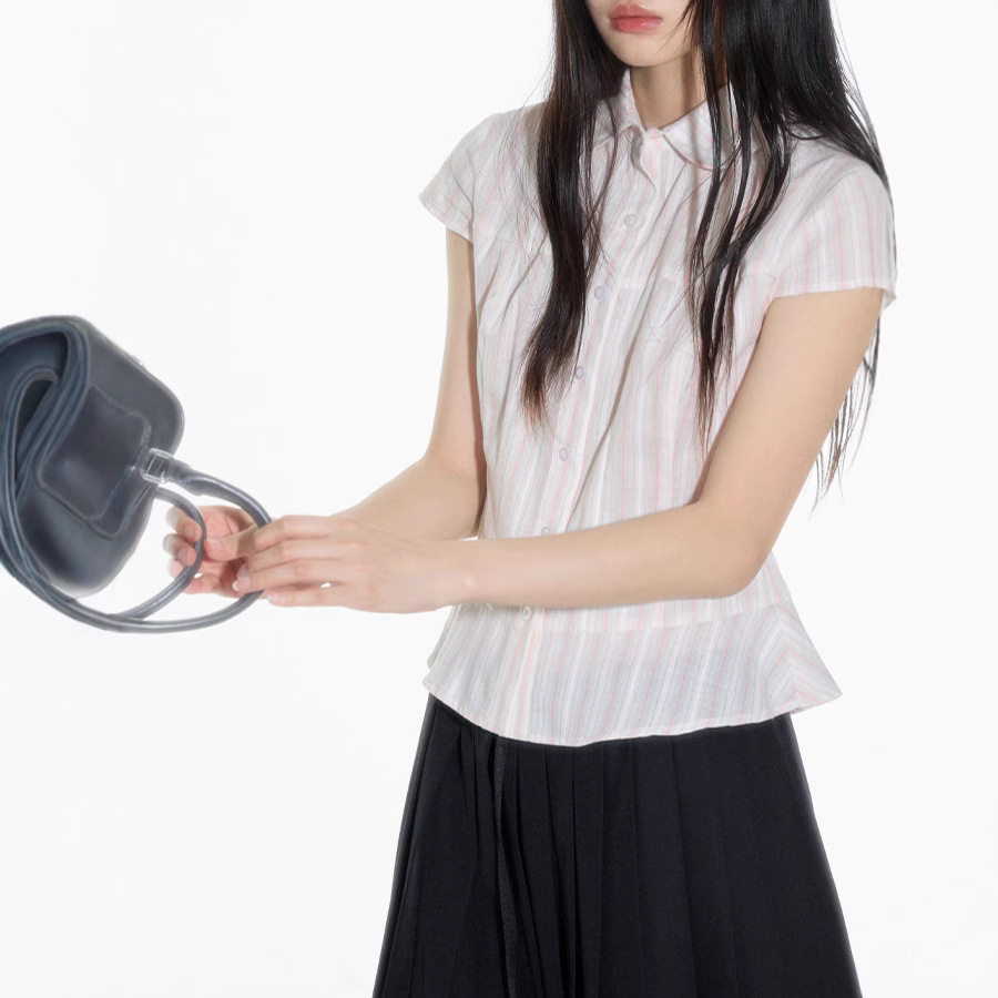 Ontherevers 디자인 달콤한 가리 올 매치 스트라이프 옷깃 허리 라인 반팔 셔츠