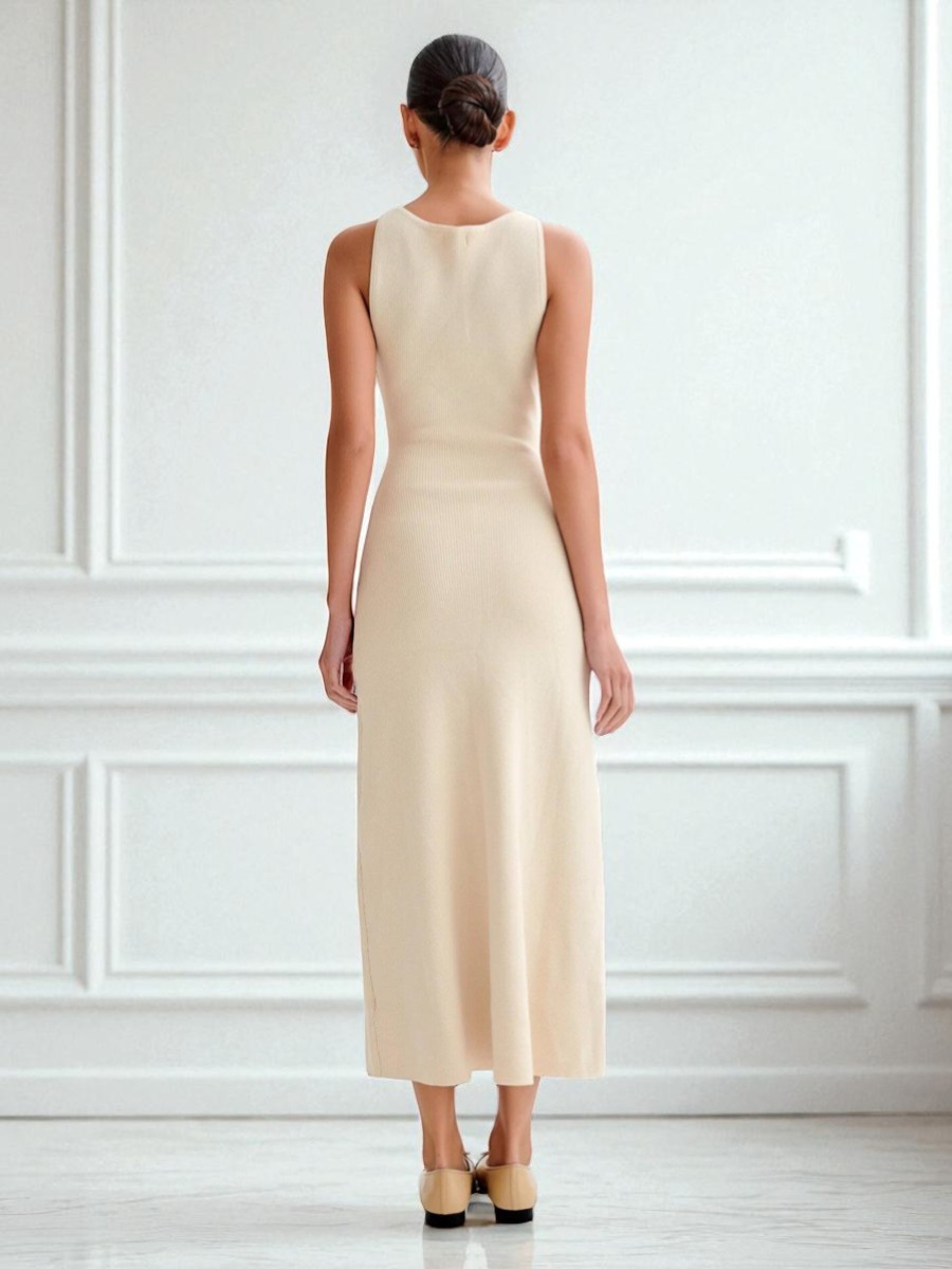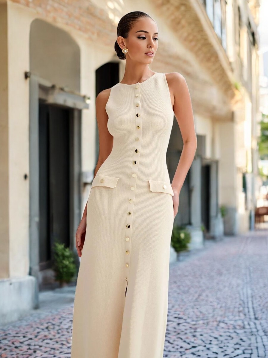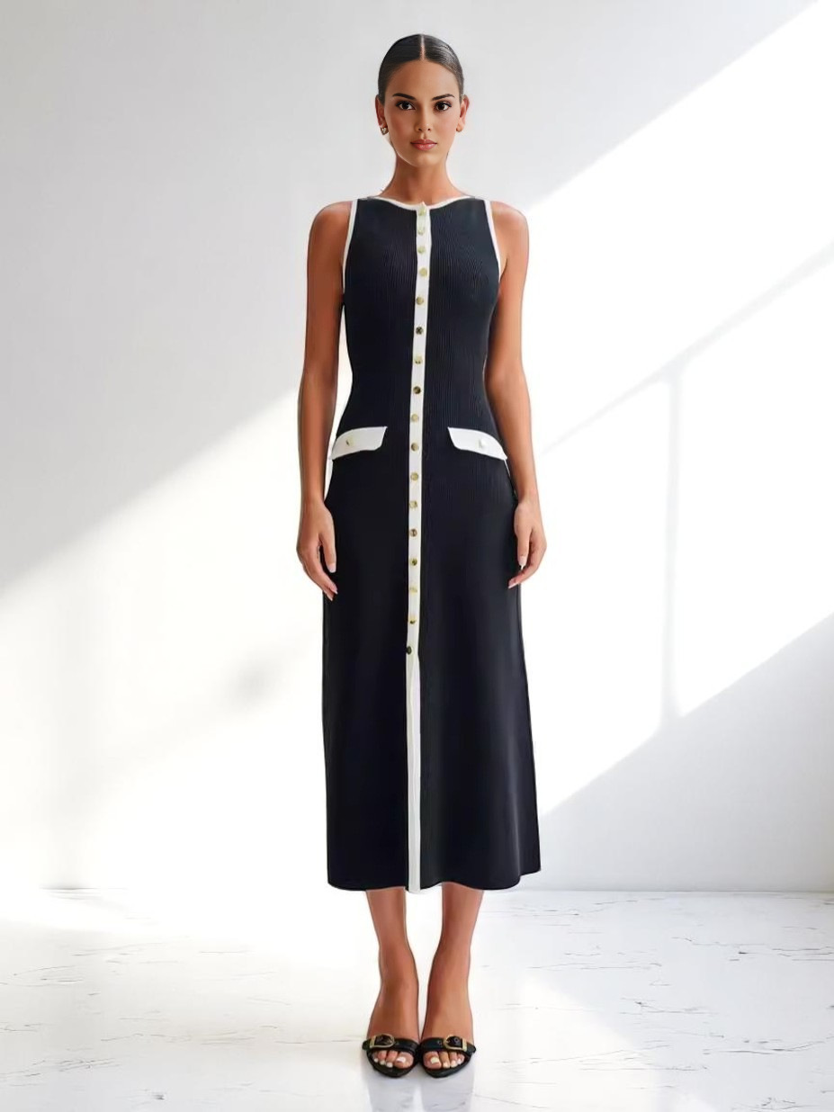 2025 New Arrivals French Style Slim Fit Knit Dres Elegant Sleeveless Knit Midi Dress for Women with Button Detail and Pocket Accents