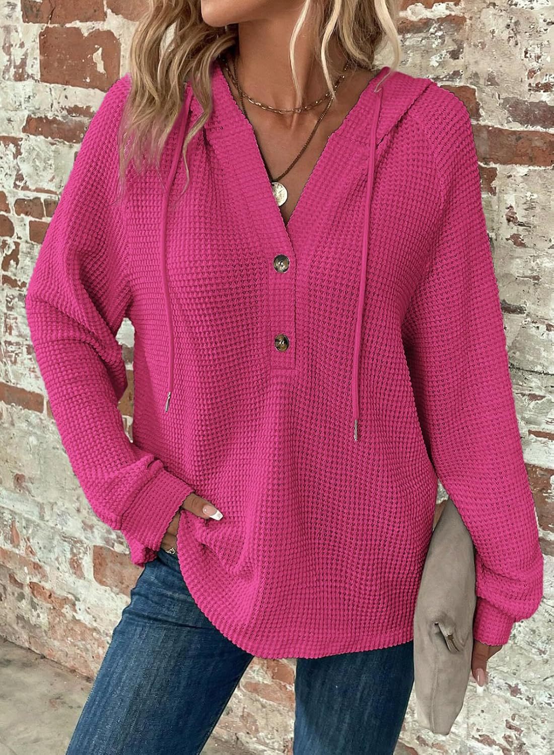 국경 간 새로운 여성 후드 와플 니트 드로스트링 버튼 v 넥 긴 소매 풀오버 캐주얼 스포츠 스웨트 셔츠