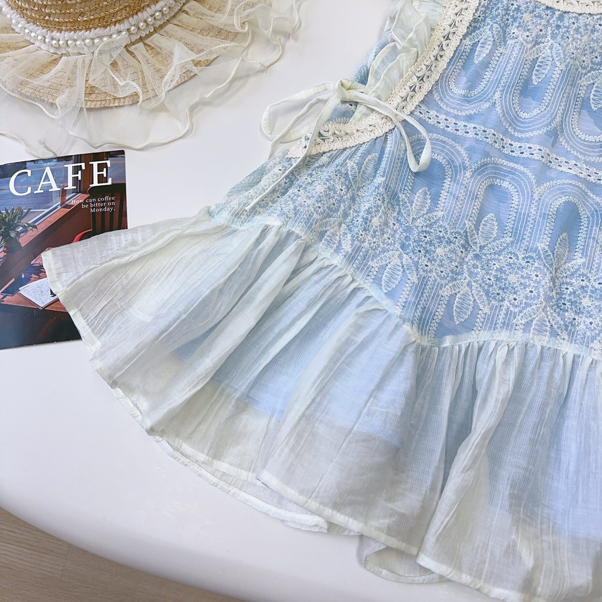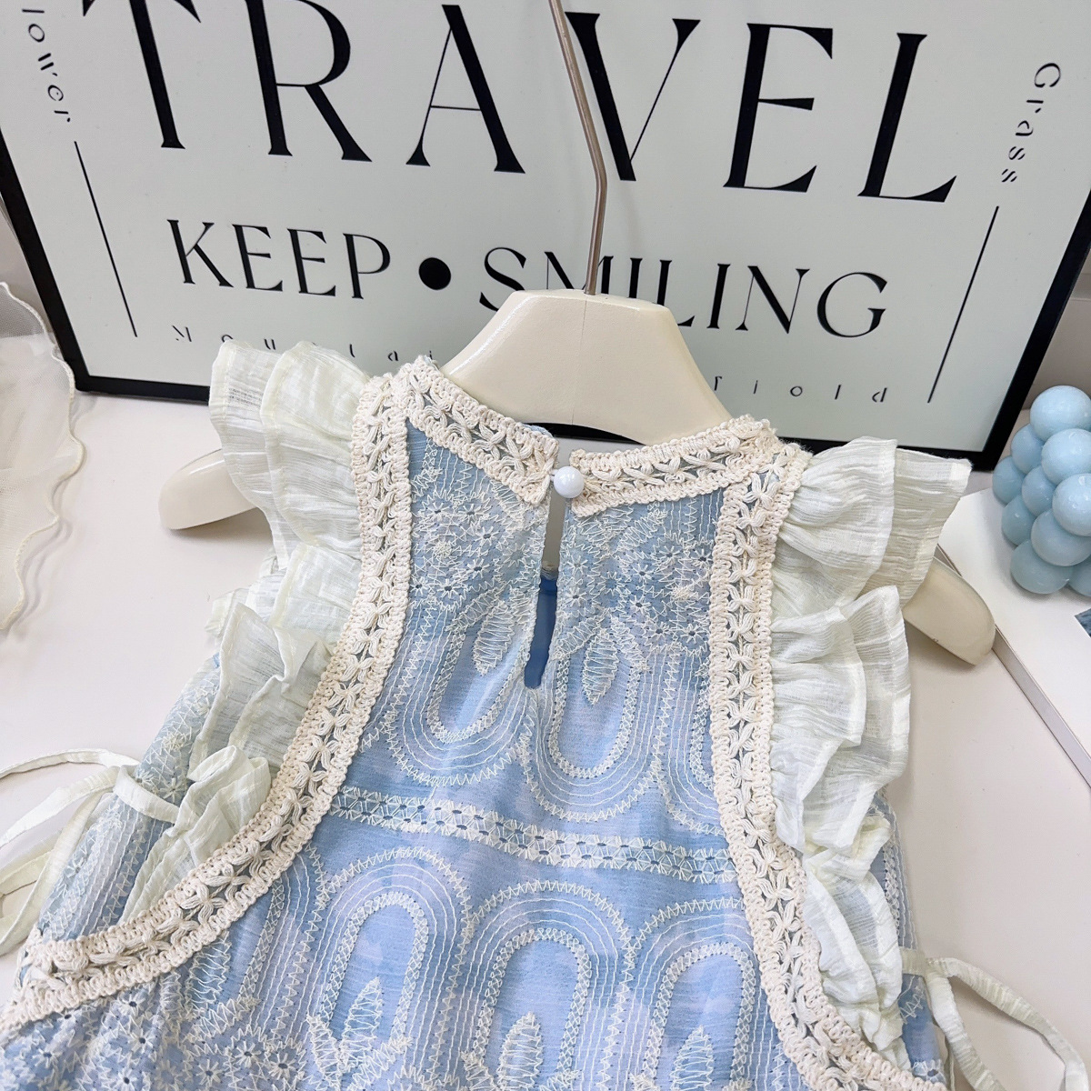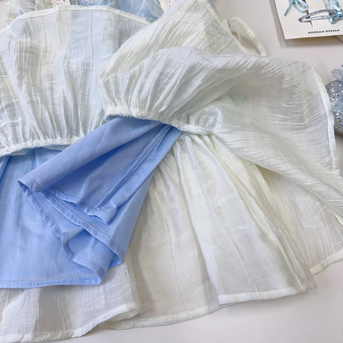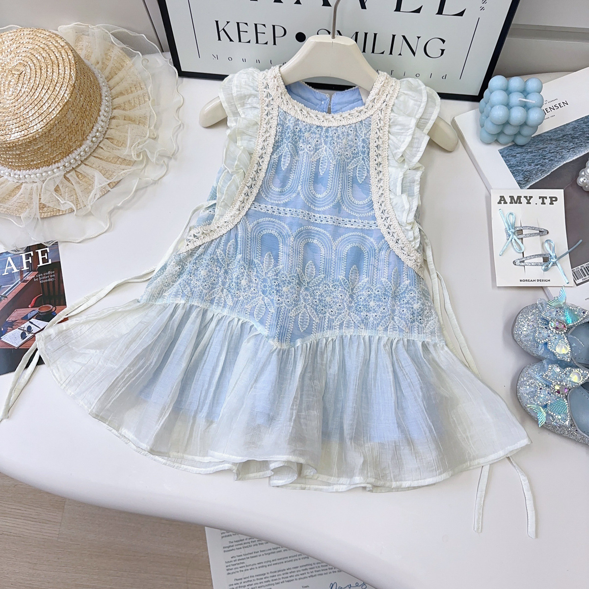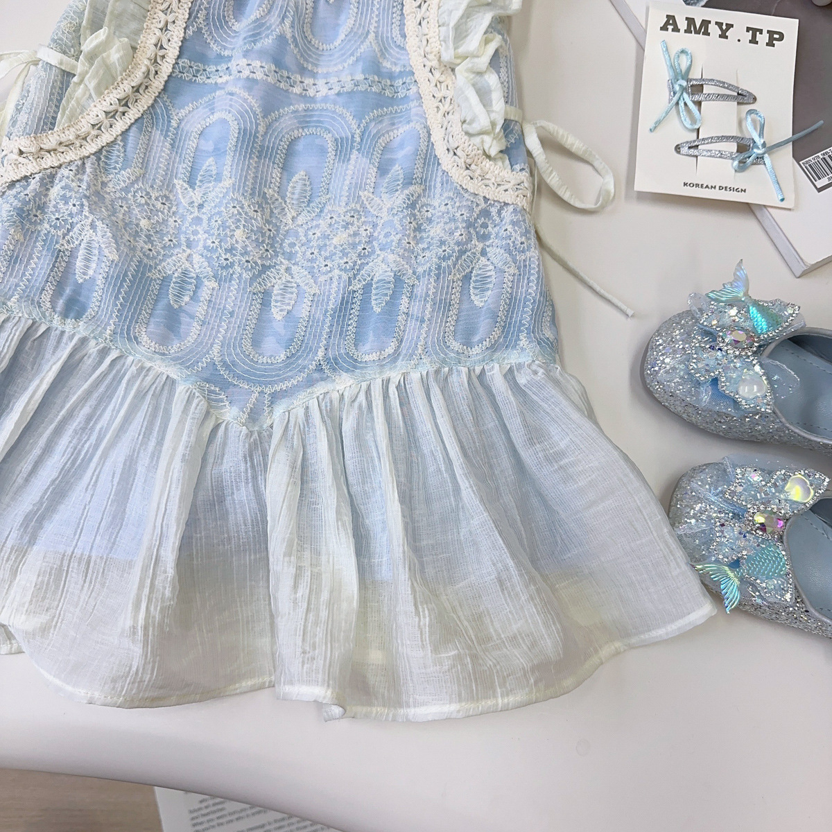 2025 새로운 여름 소녀의 세련된 휴가 스타일 한국 스타일 어린 소녀의 신선한 메쉬 스커트 플라잉 슬리브 드레스
