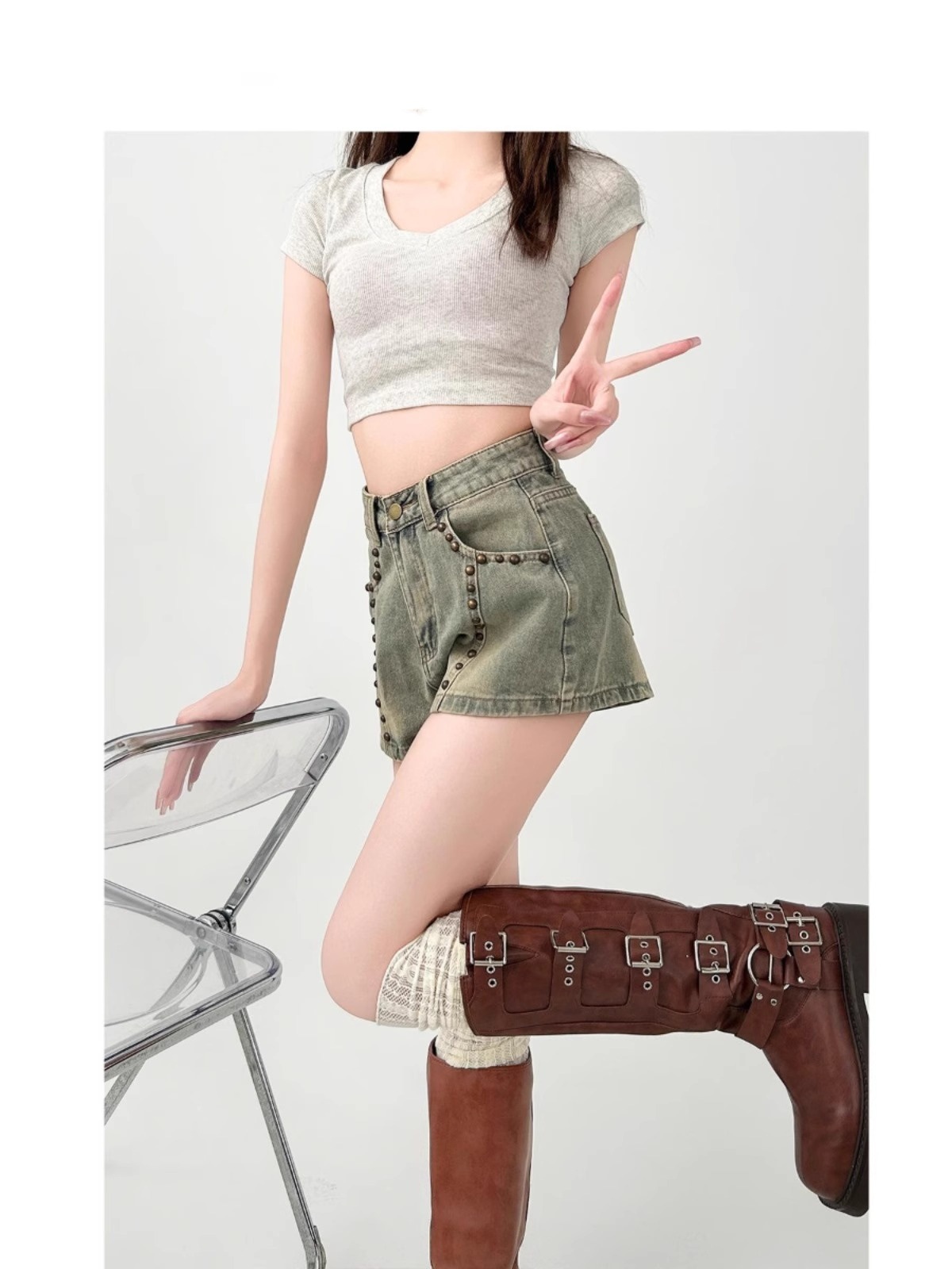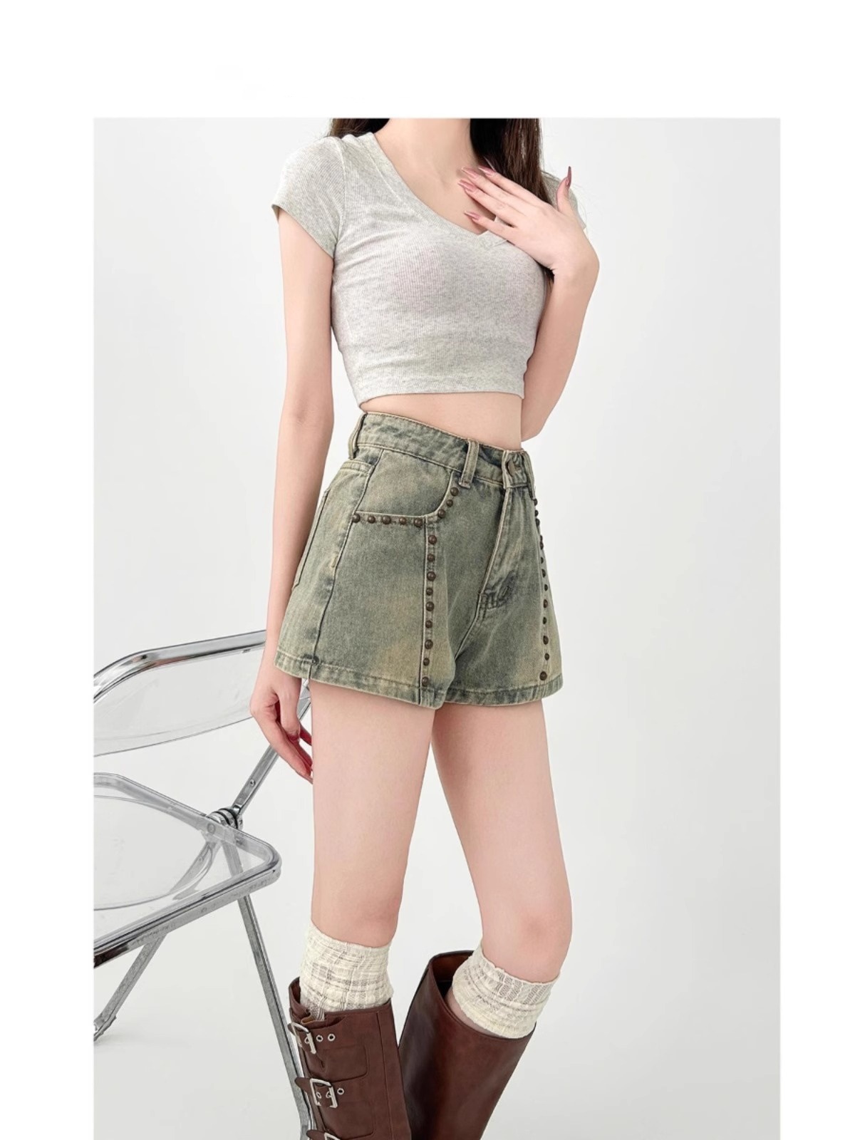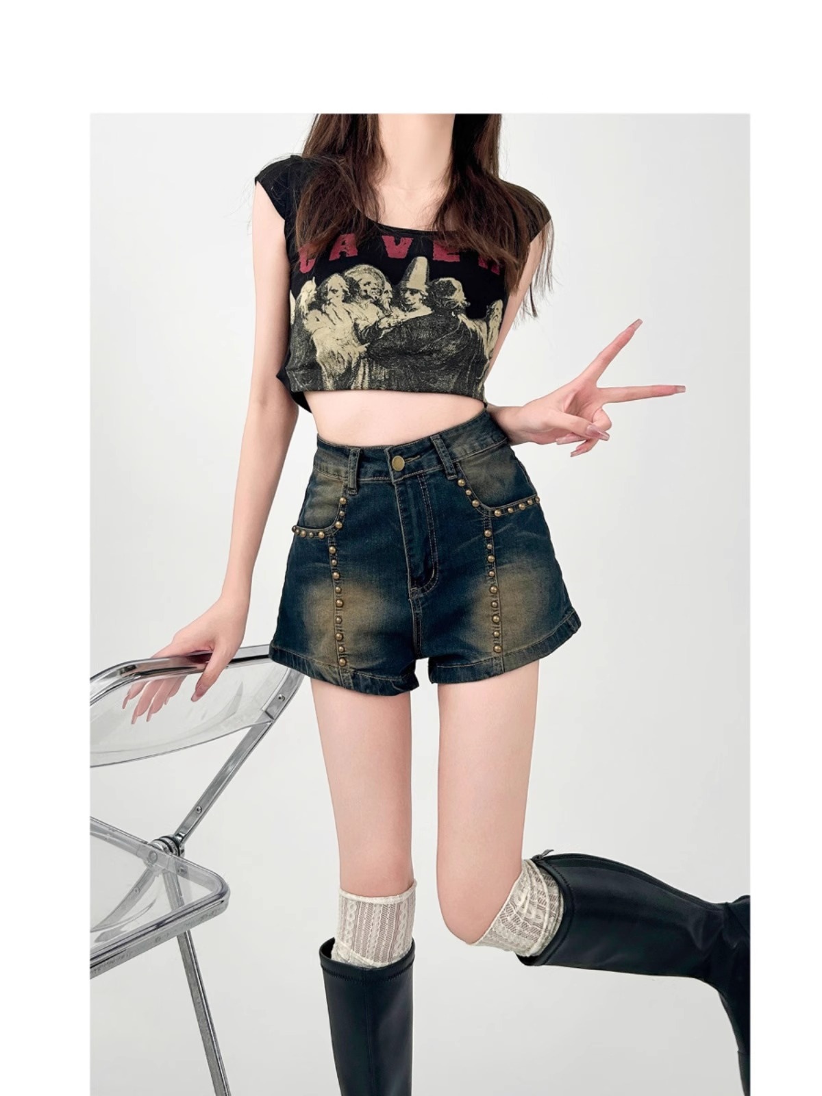 여성용 플러스 사이즈 뚱뚱한 mm 리벳 데님 반바지 2025 여름 디자인 슬리밍 살짝 뚱뚱한 바지 핫 소녀 핫 팬츠 하이 웨이스트