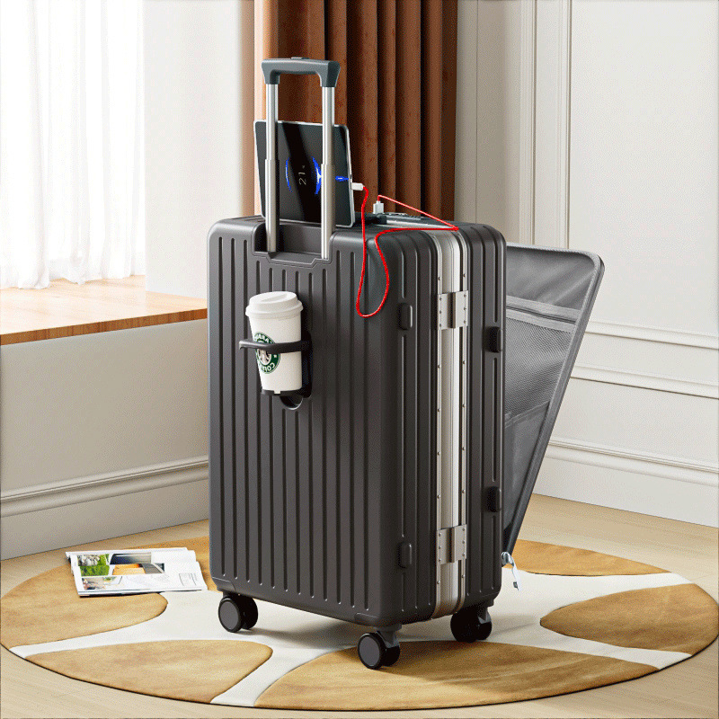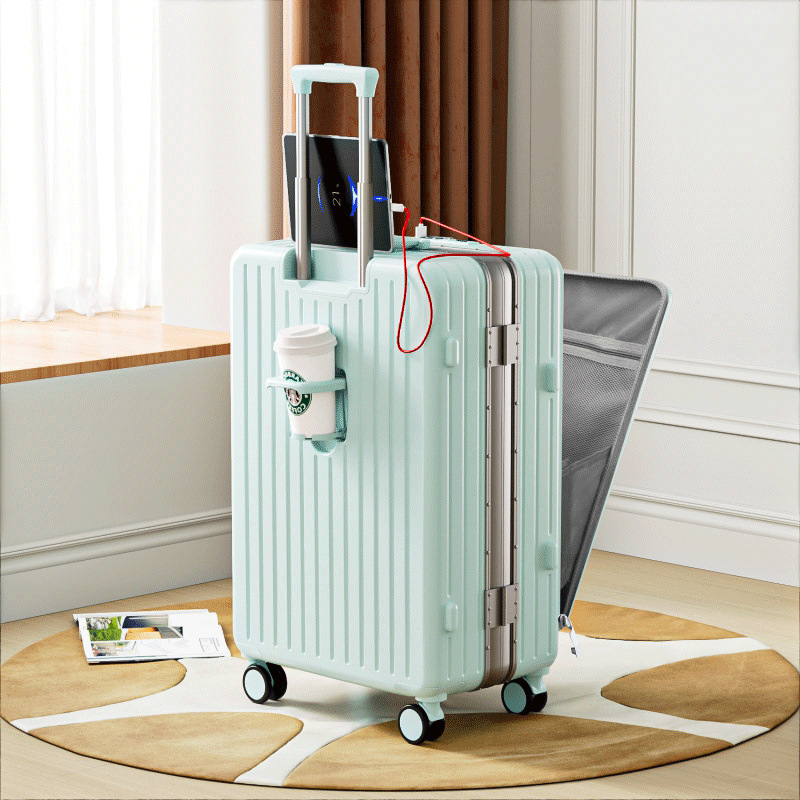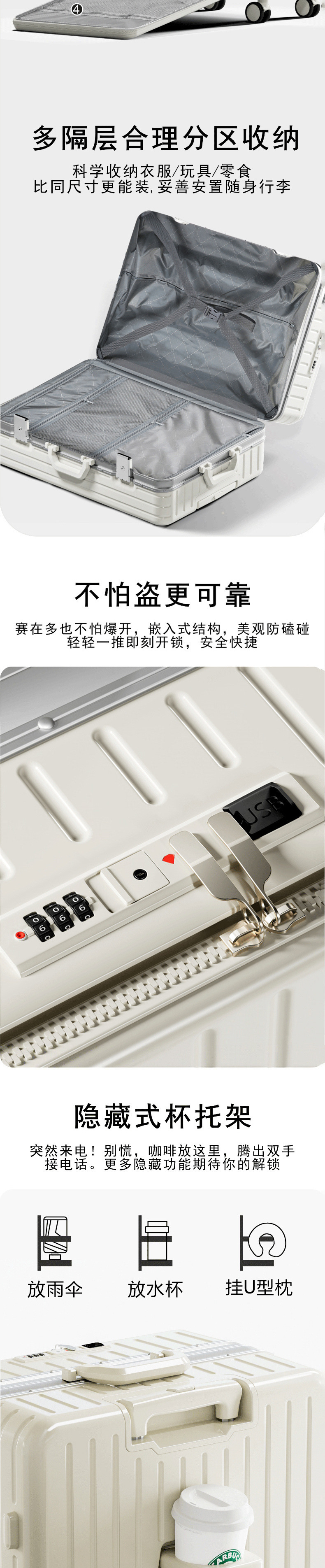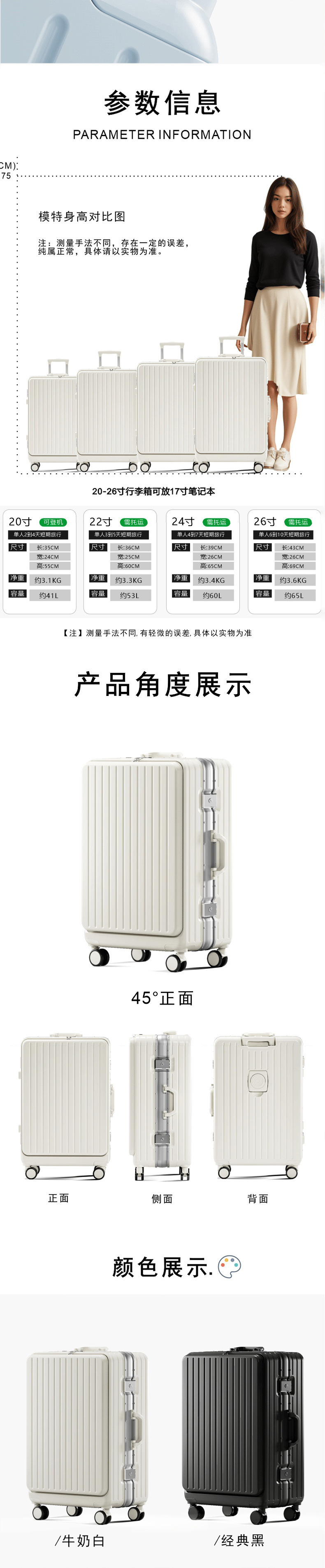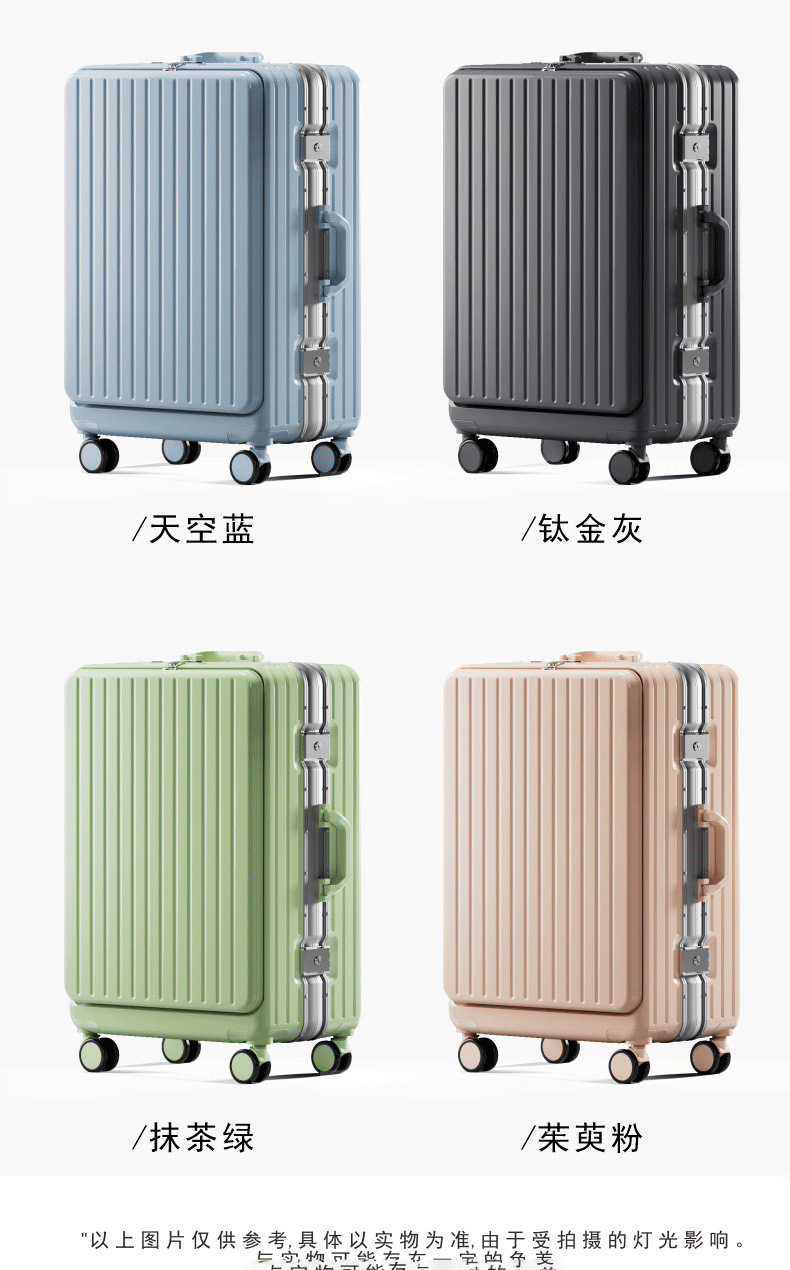 2023 새로운 전면 오픈 커버 가방 알루미늄 프레임 강력하고 내구성이 뛰어난 트롤리 케이스 여성용 다기능 20inch 탑승 코드 박스