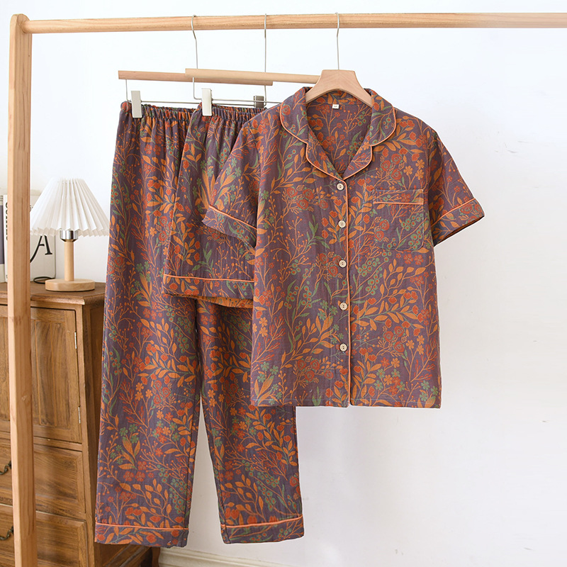 봄 여름 순면 원사 염색 자카드 여성 라펠 3피스 잠옷 반팔 반바지 플러스 바지 중년 및 노인 가정복스토어 가기