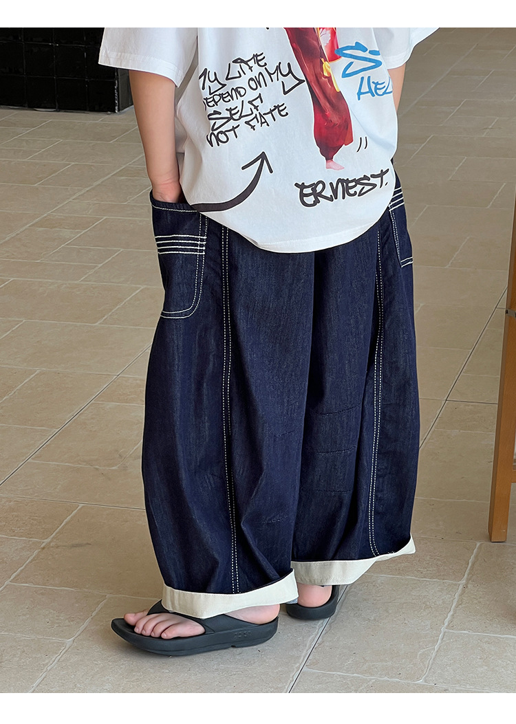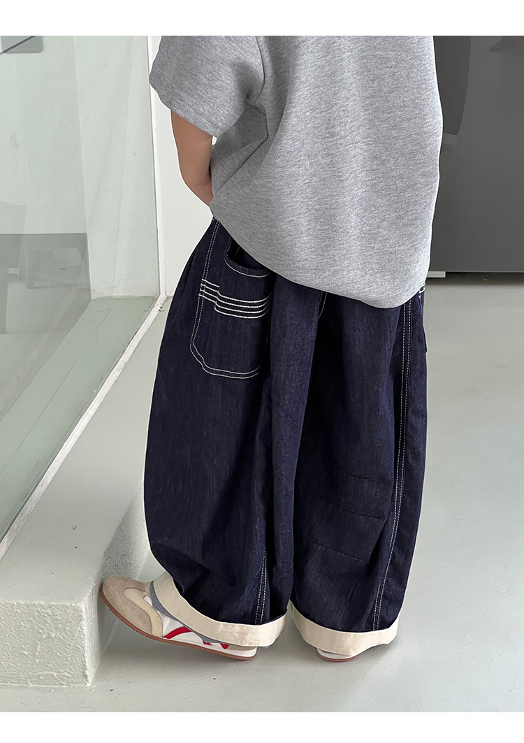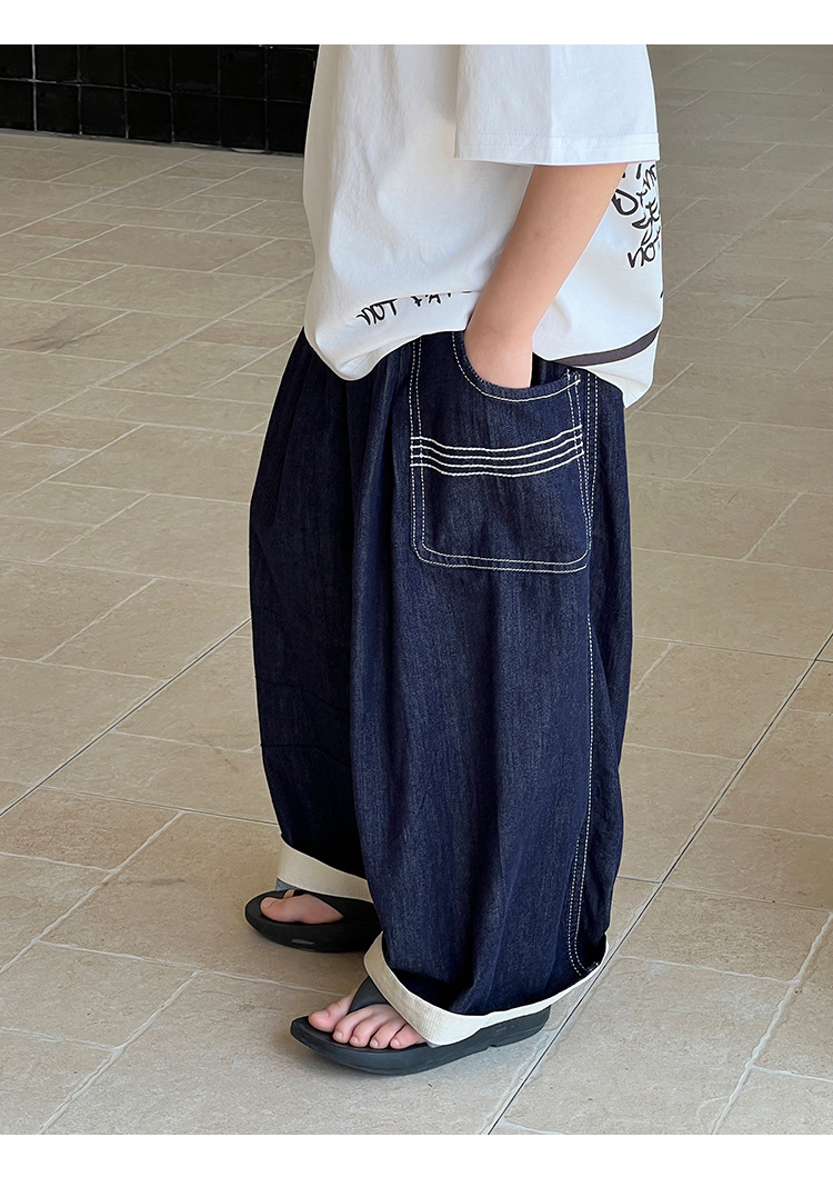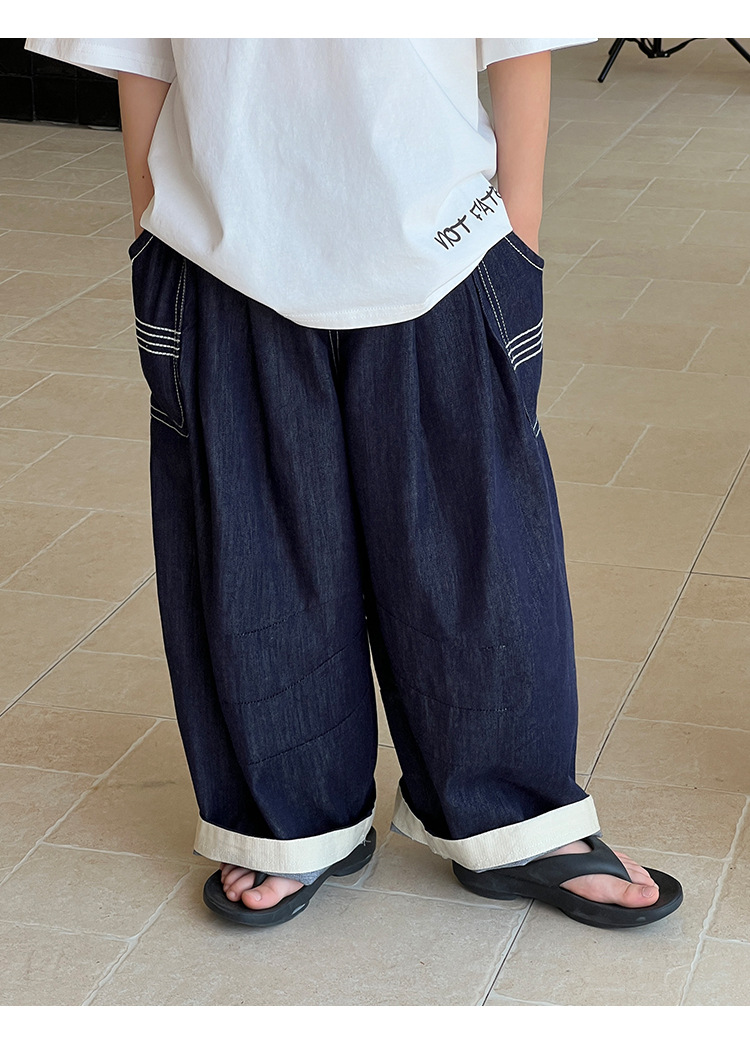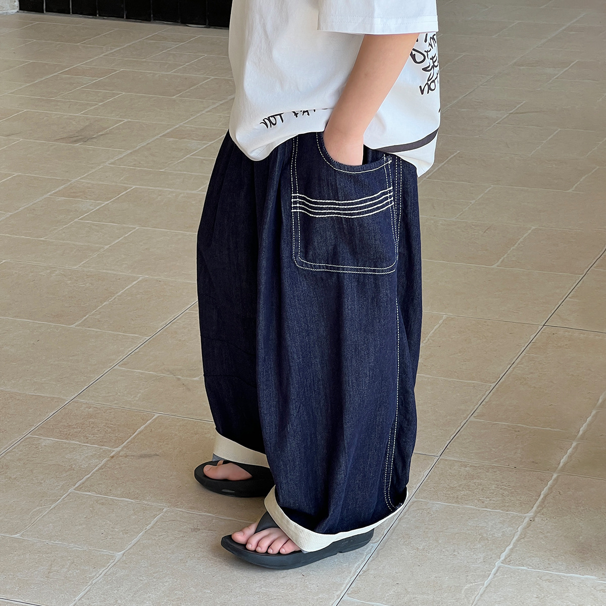 2025 여름 아동 한국 패션 캐주얼 심플 스타일 대비 컬러 탑스티치 다용도 데일리 청바지