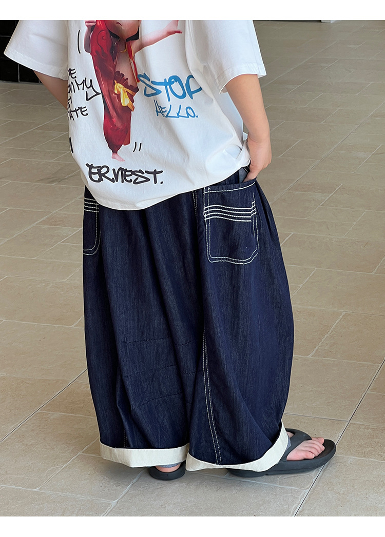 2025 여름 아동 한국 패션 캐주얼 심플 스타일 대비 컬러 탑스티치 다용도 데일리 청바지스토어 가기