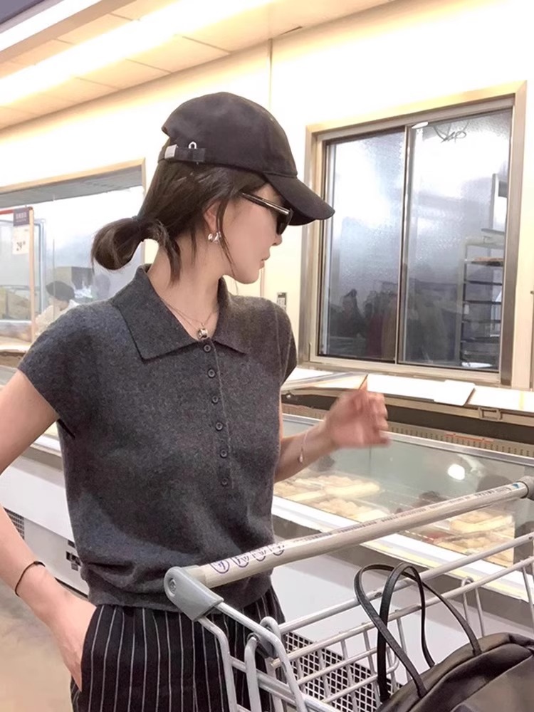 여름용 여성용 그레이 라펠 니트 반팔 티셔츠 아이스 실크 얇은 슬림핏 오른쪽 어깨 폴로 셔츠 기질 짧은 탑