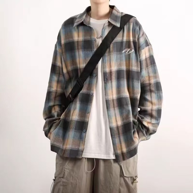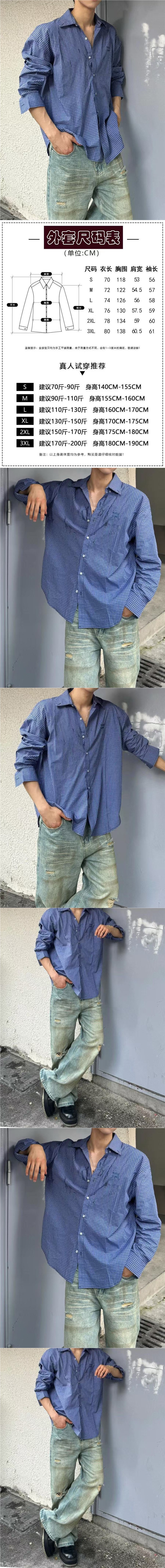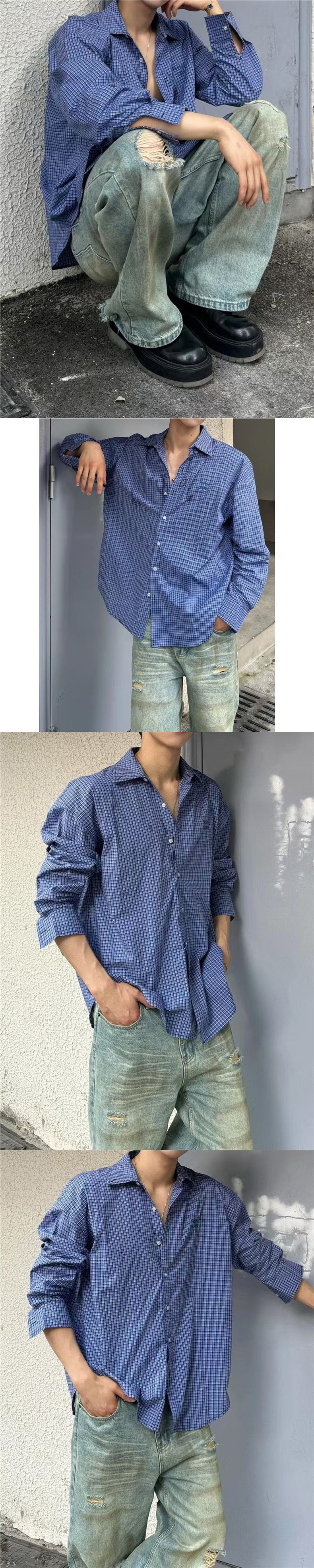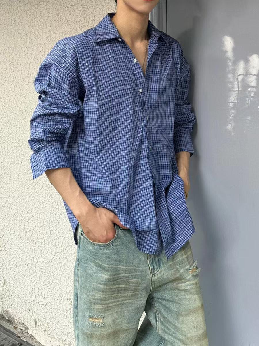 남성용 블루 긴팔 체크 무늬 셔츠, 클린핏, 레이지 스타일 재킷, 보이시 스타일, 도매스토어 가기
