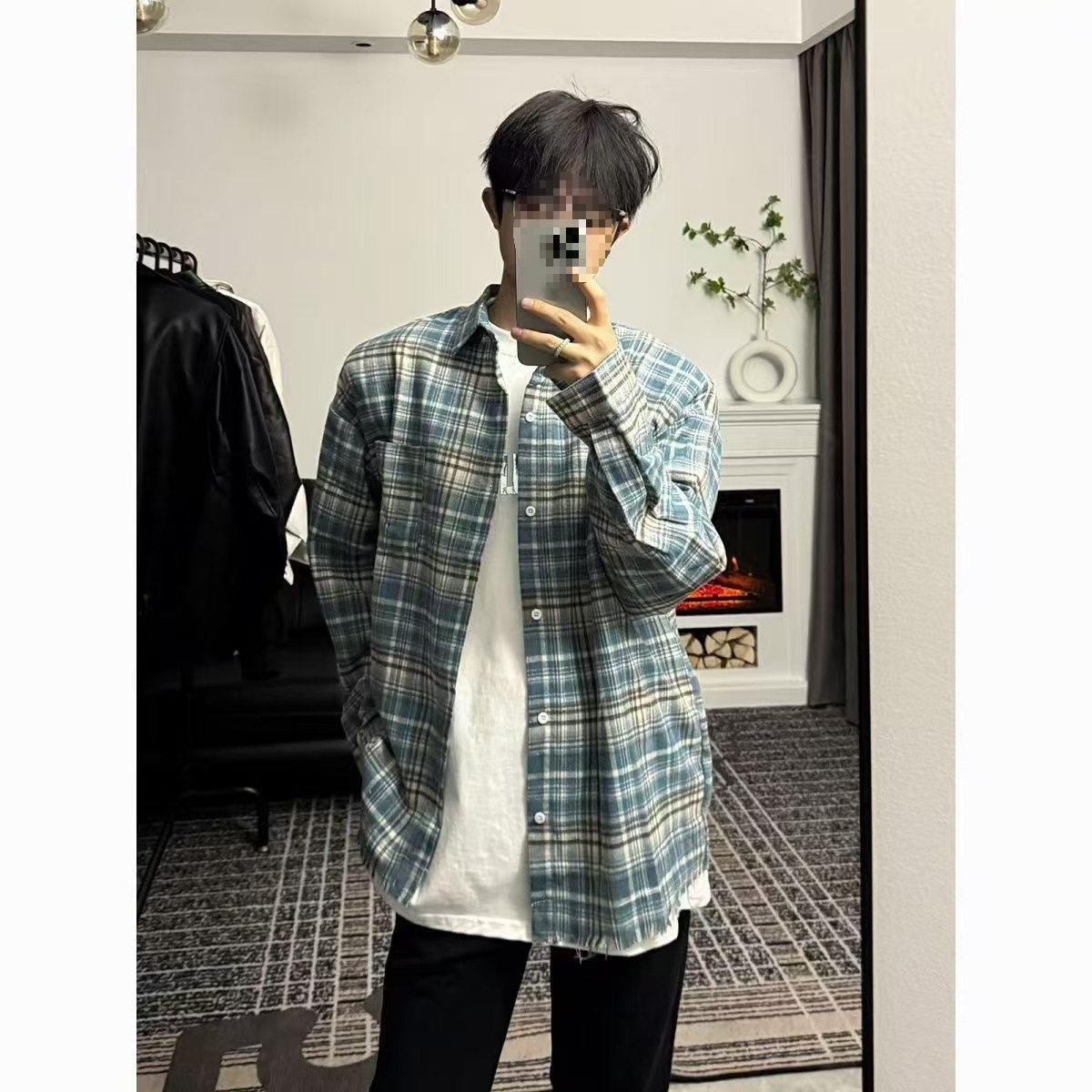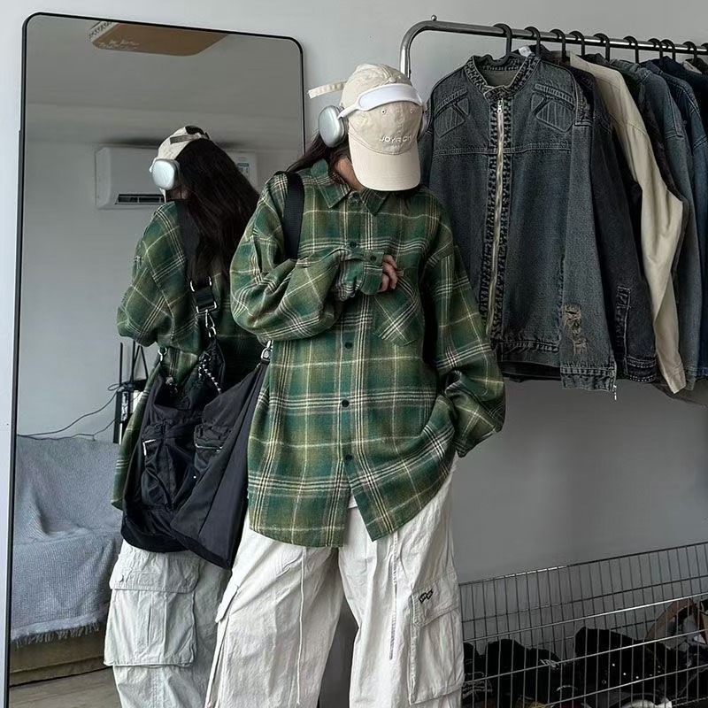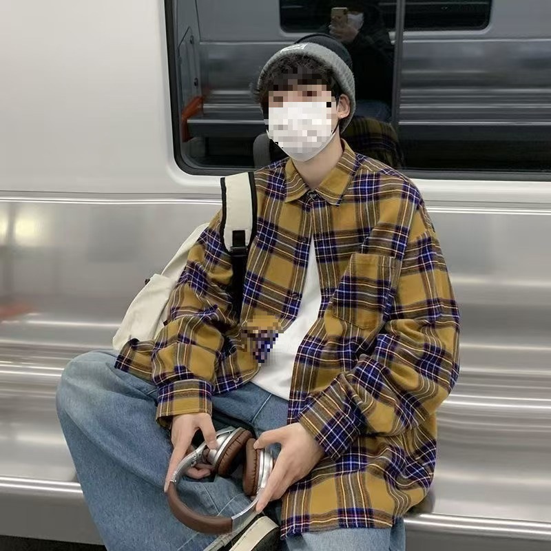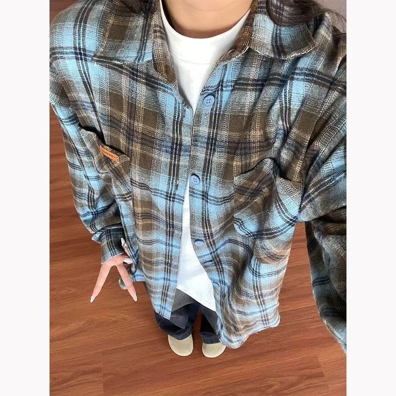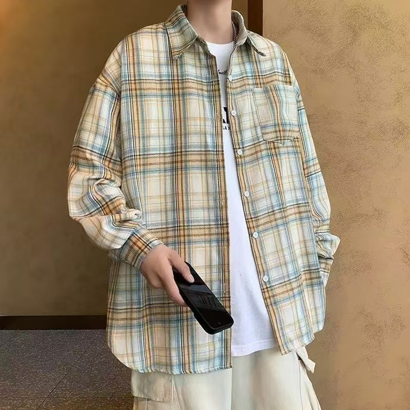 남성용 블루 긴팔 체크 무늬 셔츠, 클린핏, 레이지 스타일 재킷, 보이시 스타일, 도매스토어 가기
