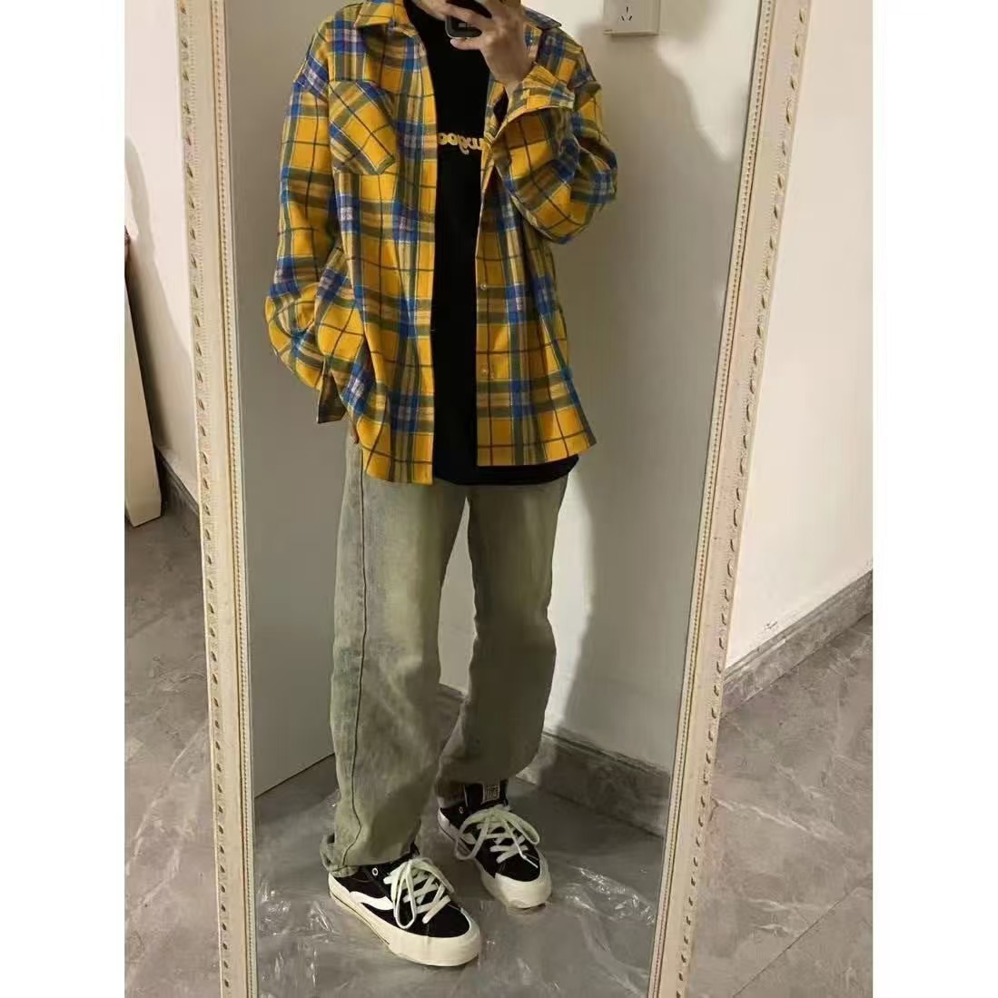 • YC38 노란색 그리드 # 면 셔츠