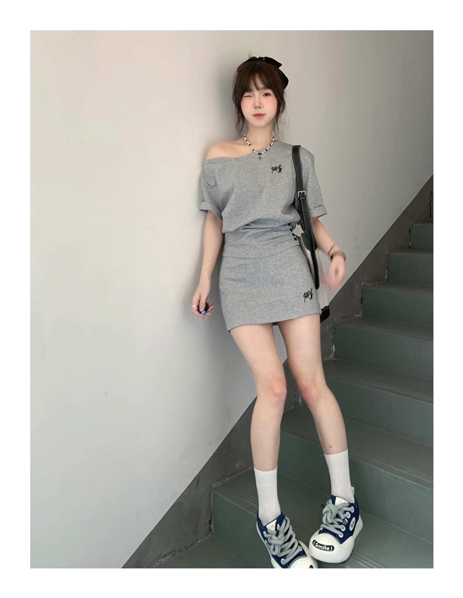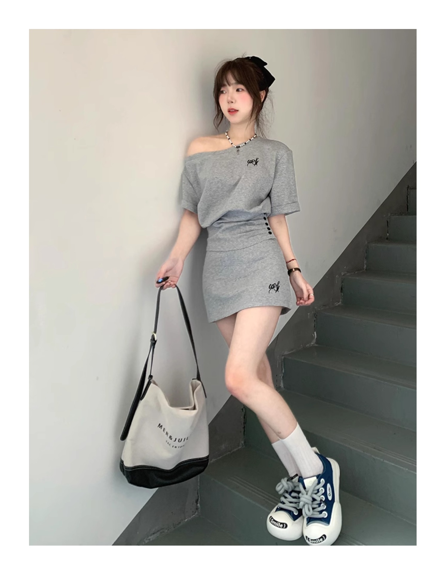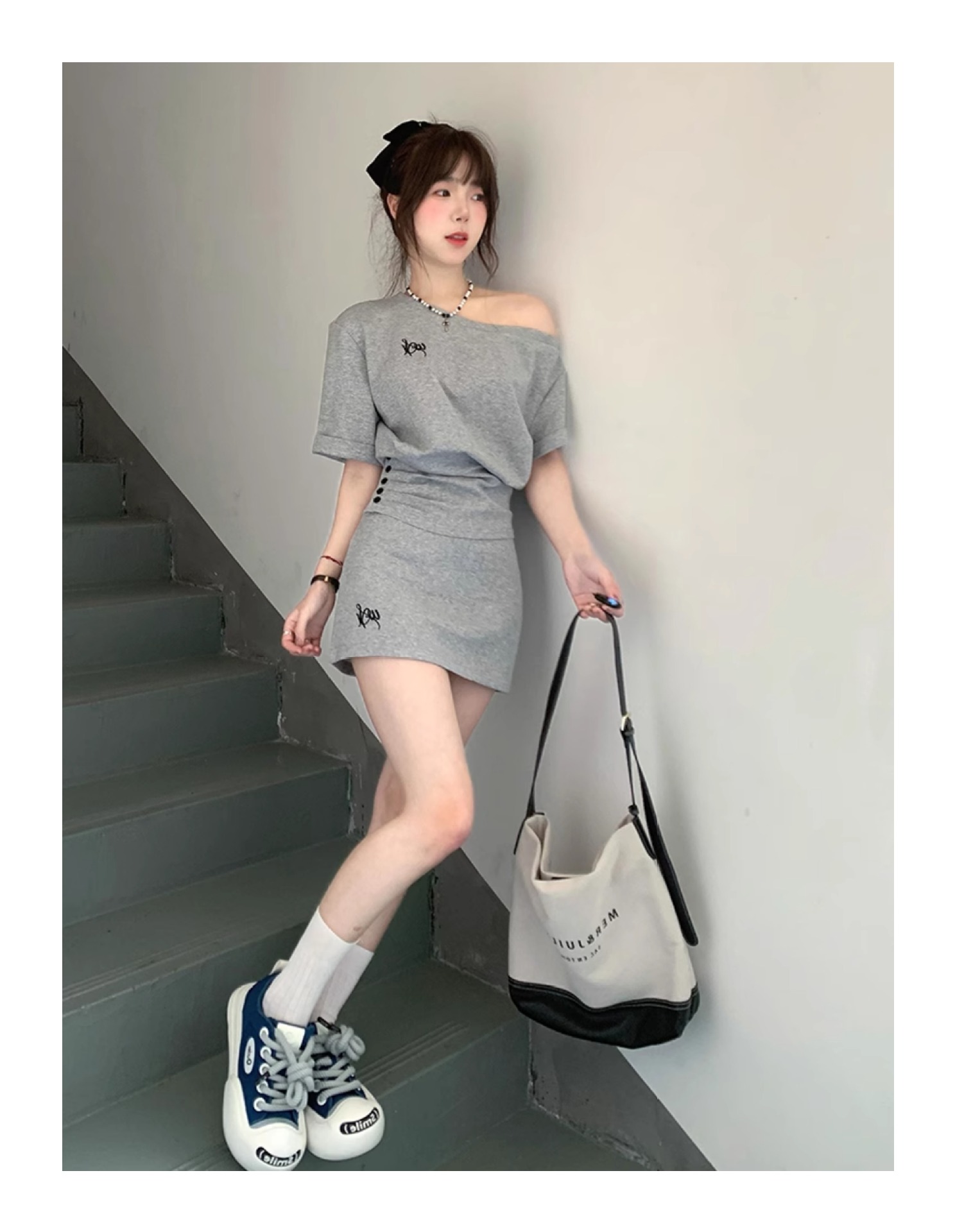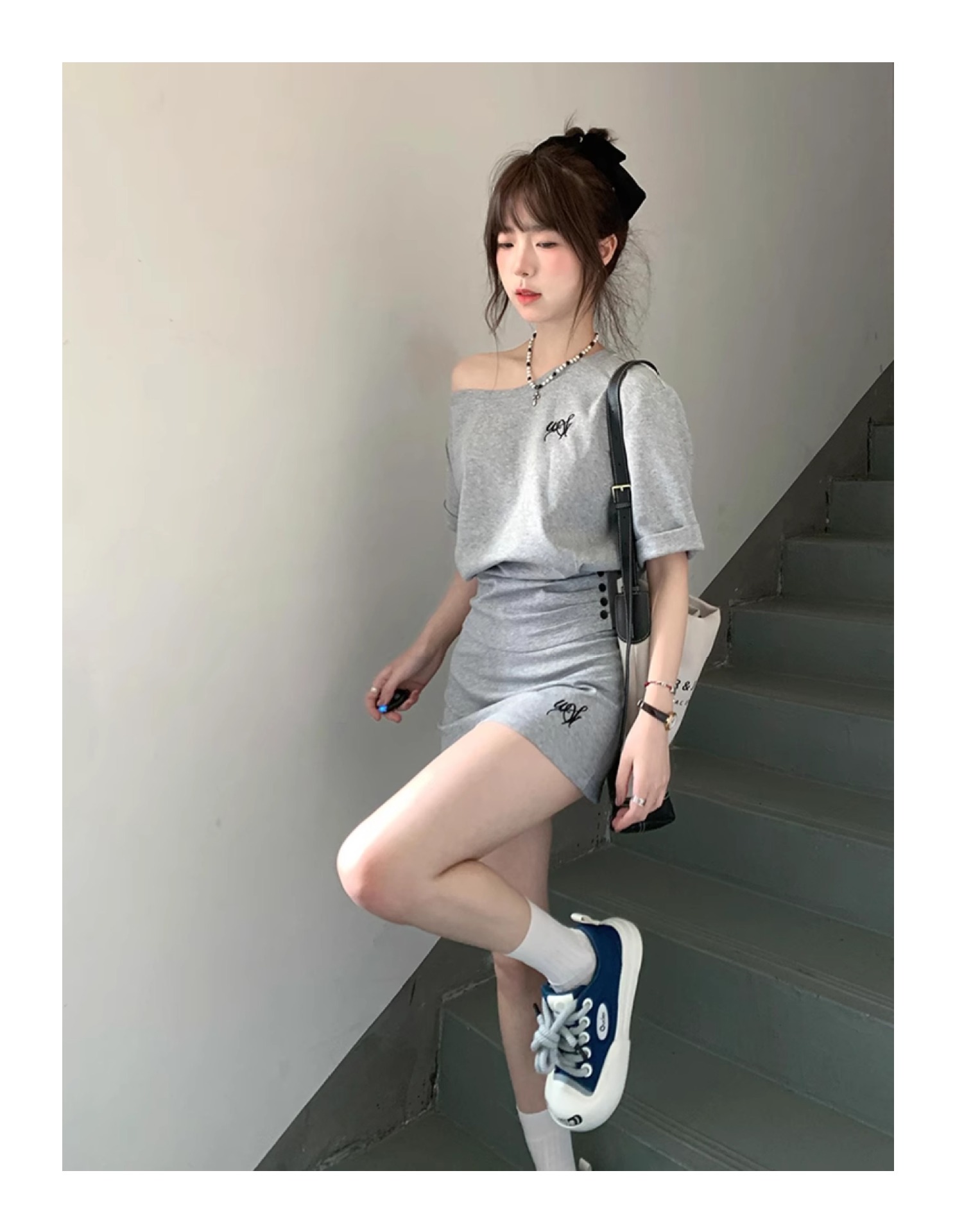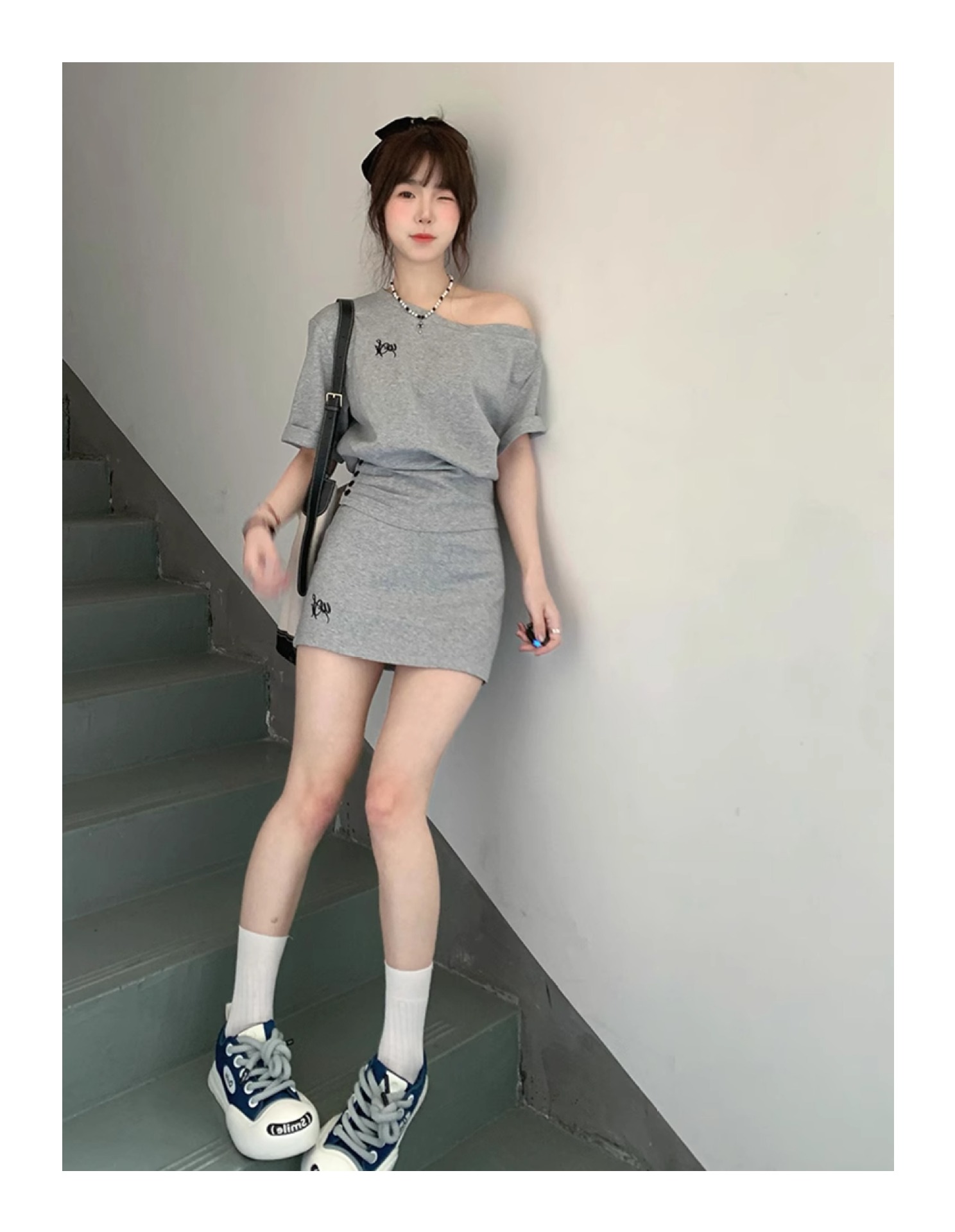 한국 스타일 캐주얼 스타일 타이트 허리 스포츠 세트 여성 여름 유행 짧은 사향 어깨 짧은 소매 작은 투피스 세트스토어 가기