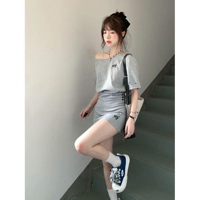 한국 스타일 캐주얼 스타일 타이트 허리 스포츠 세트 여성 여름 유행 짧은 사향 어깨 짧은 소매 작은 투피스 세트