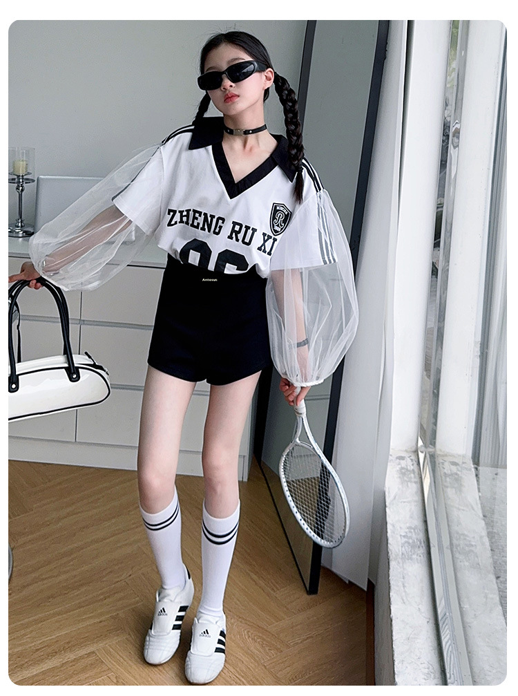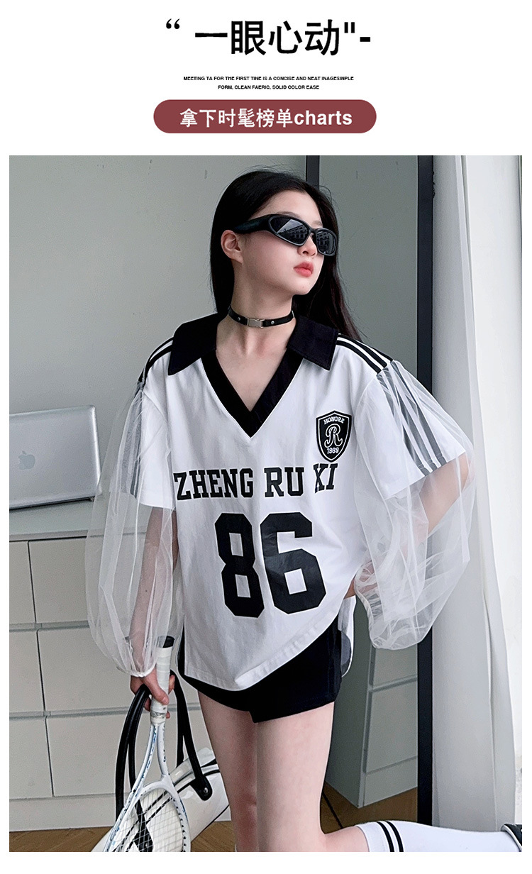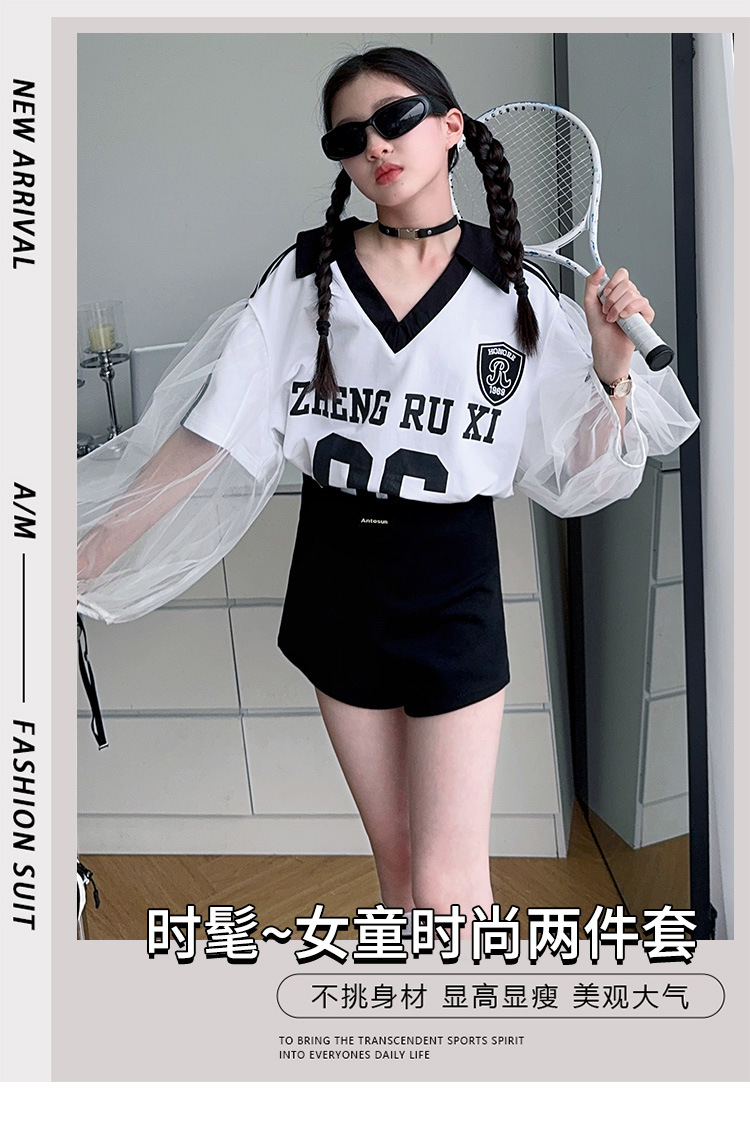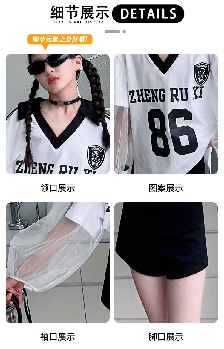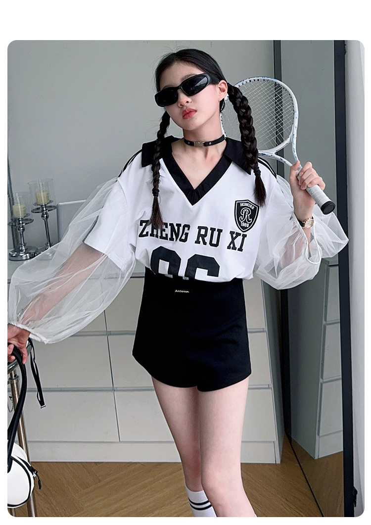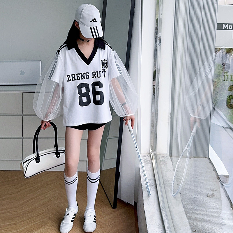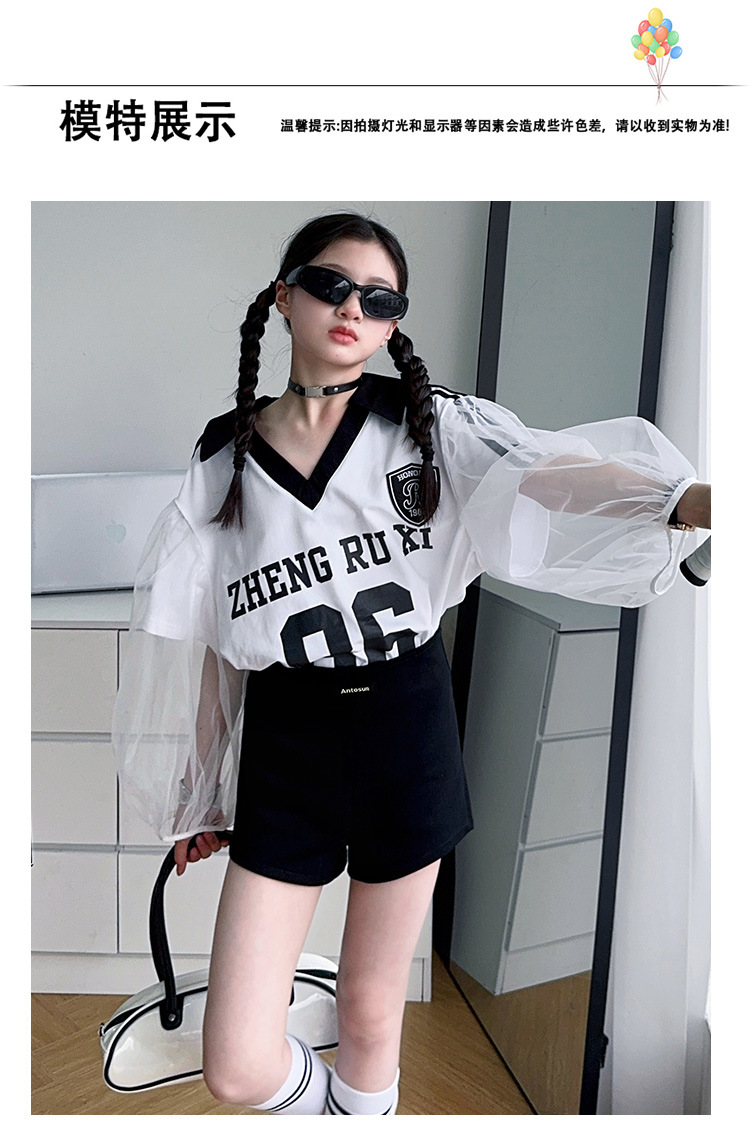 소녀 2025 여름 바느질 원사 슬리브 저지 티셔츠 빅 키즈 틈새 디자인 미국식 색상 대비 V 넥 루즈 탑