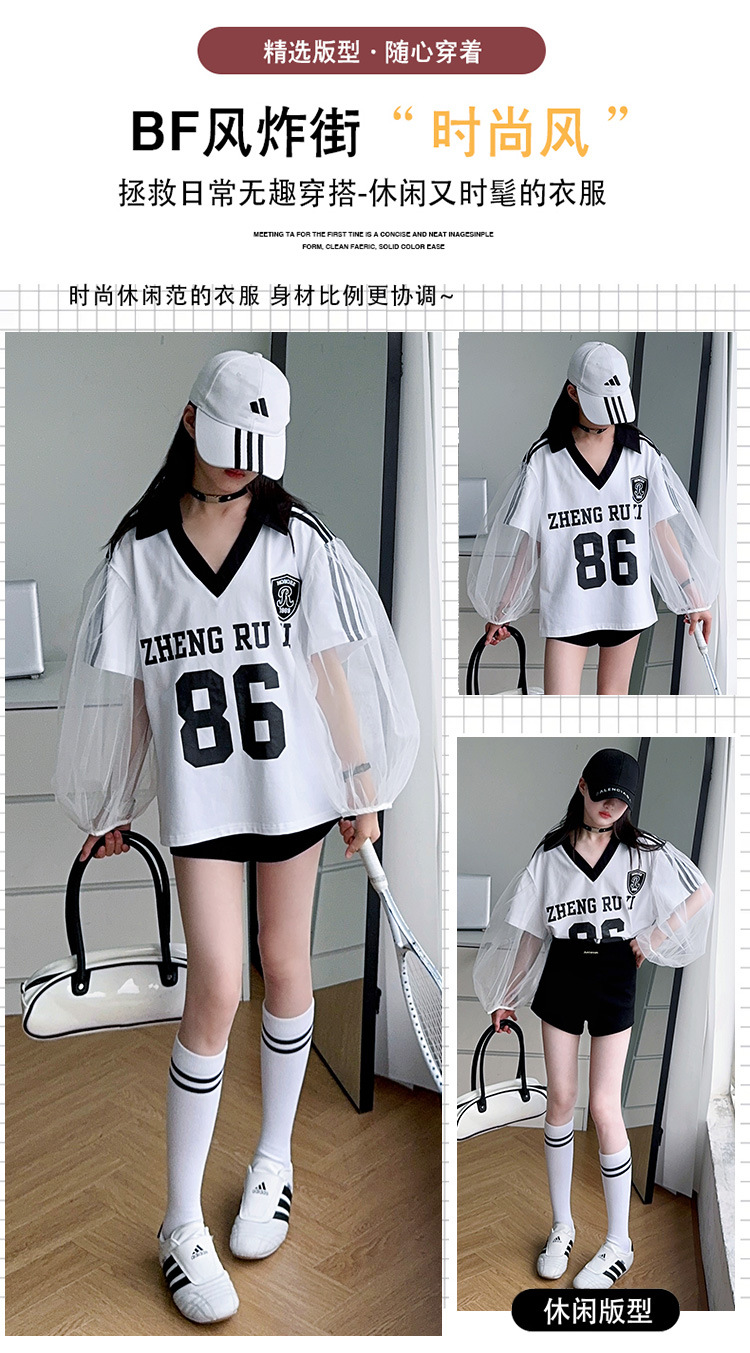 소녀 2025 여름 바느질 원사 슬리브 저지 티셔츠 빅 키즈 틈새 디자인 미국식 색상 대비 V 넥 루즈 탑스토어 가기
