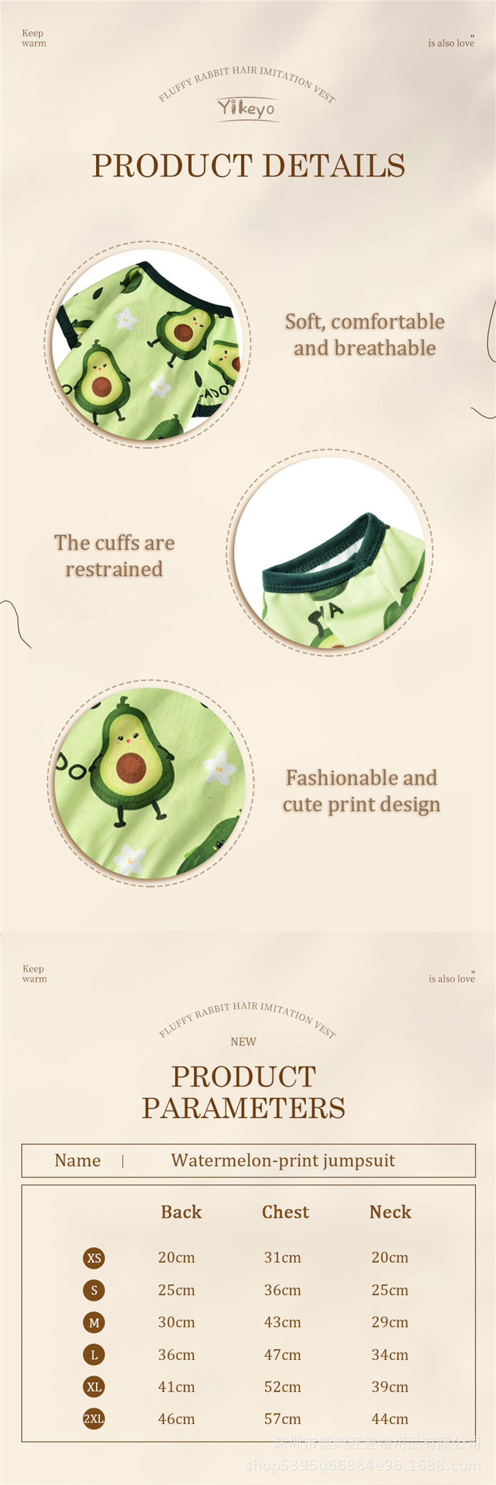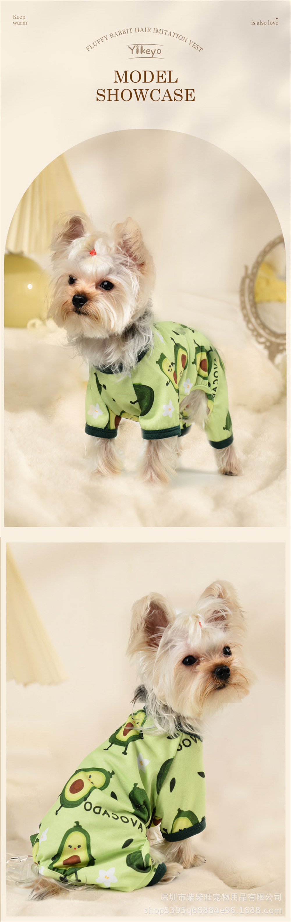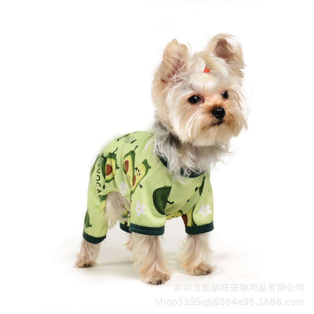 여름 애완 동물 옷 도매 귀엽고 편안한 아보카도 프린트 점프 슈트 사계절 유행 야외 애완견스토어 가기