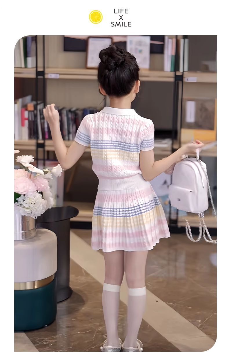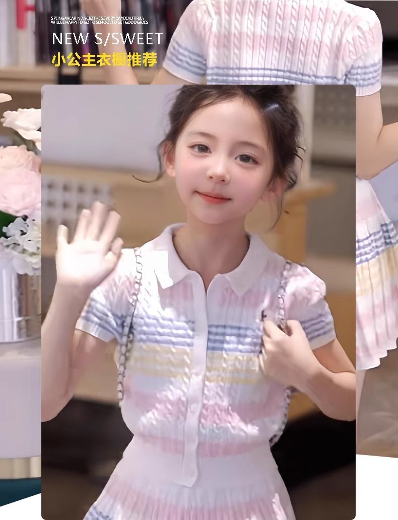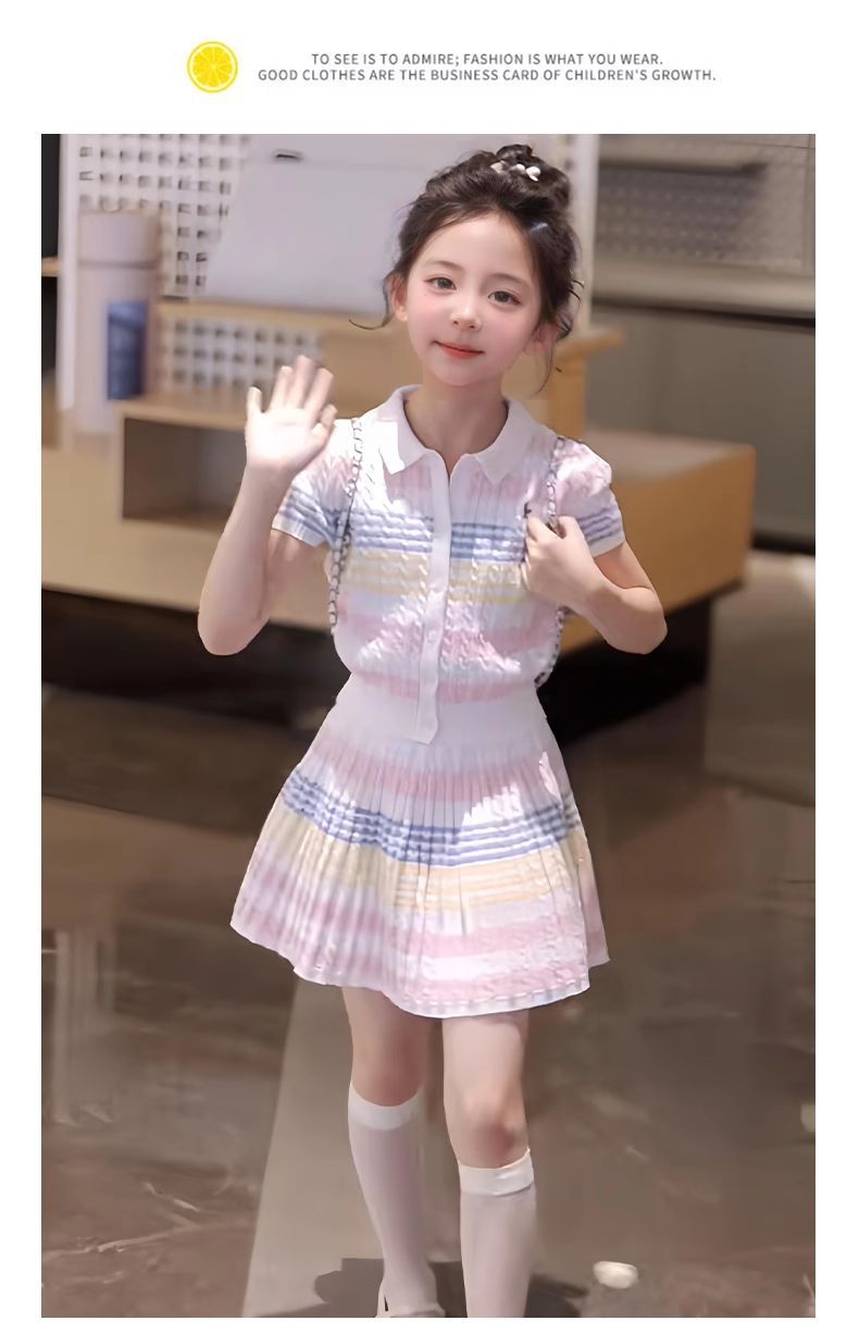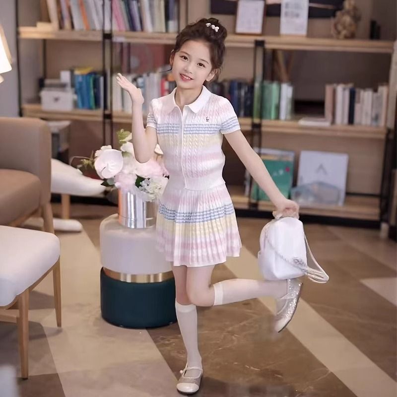 여자 여름 줄무늬 양복 새로운 어린이 얇은 반팔 스웨터 여름 여자 스커트 투피스 유행 세트