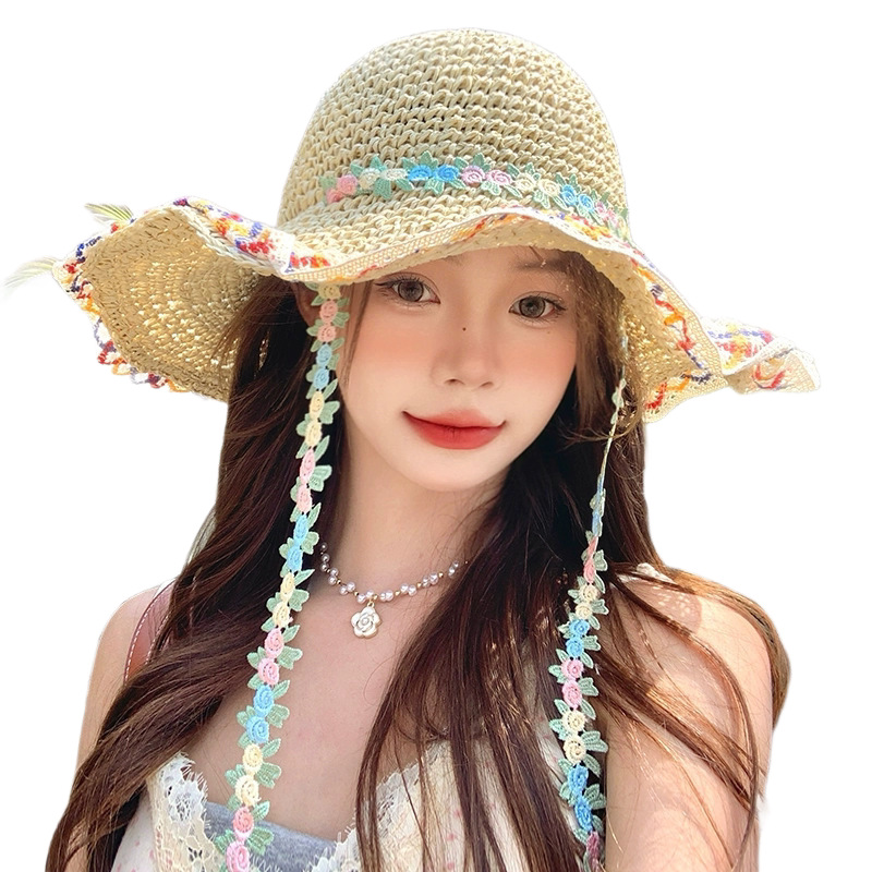 밀짚 모자 여성의 새로운 일본식 작은 신선한 레이스 밀짚 모자 여름 여행 태양 보호 모자 큰 챙 해변 태양 모자