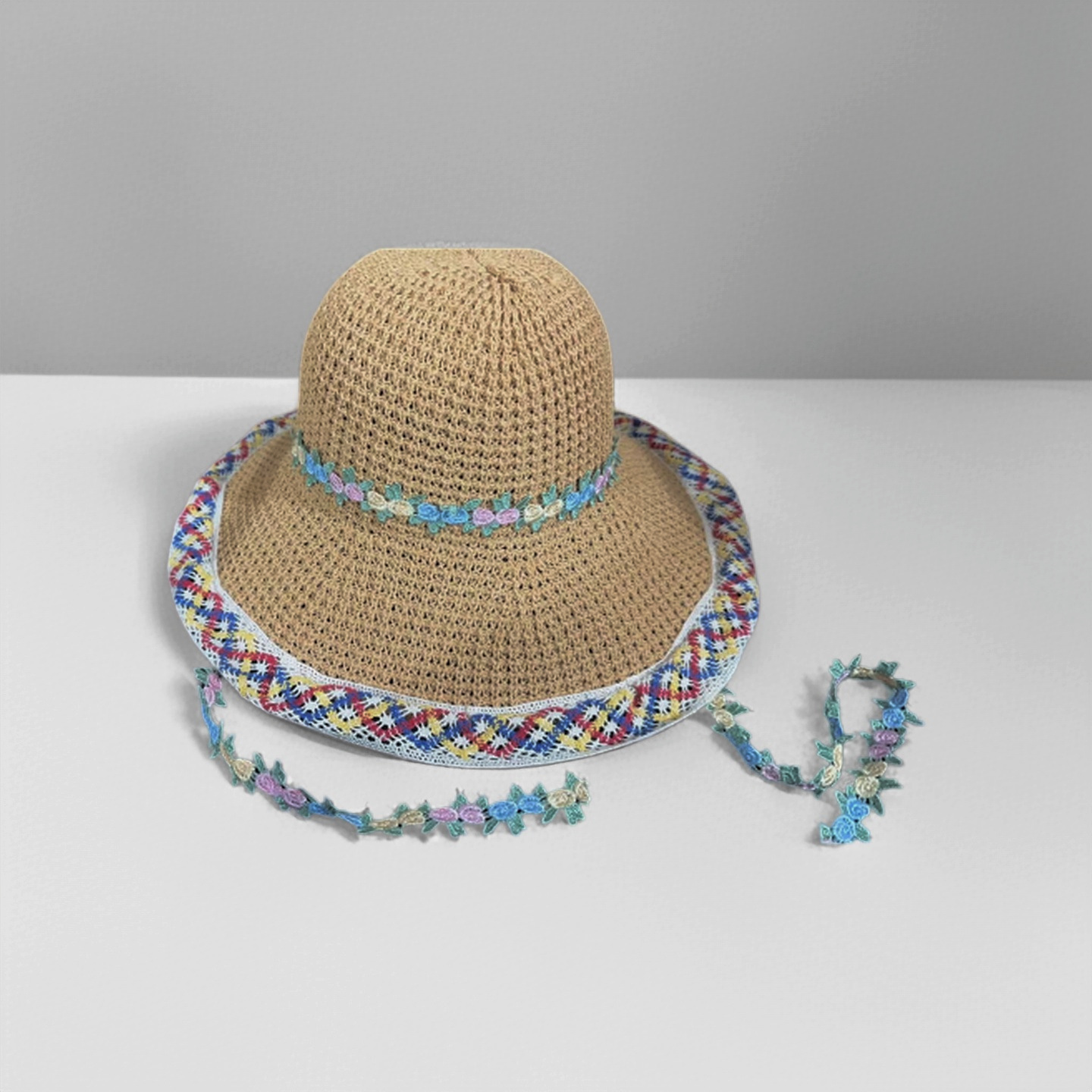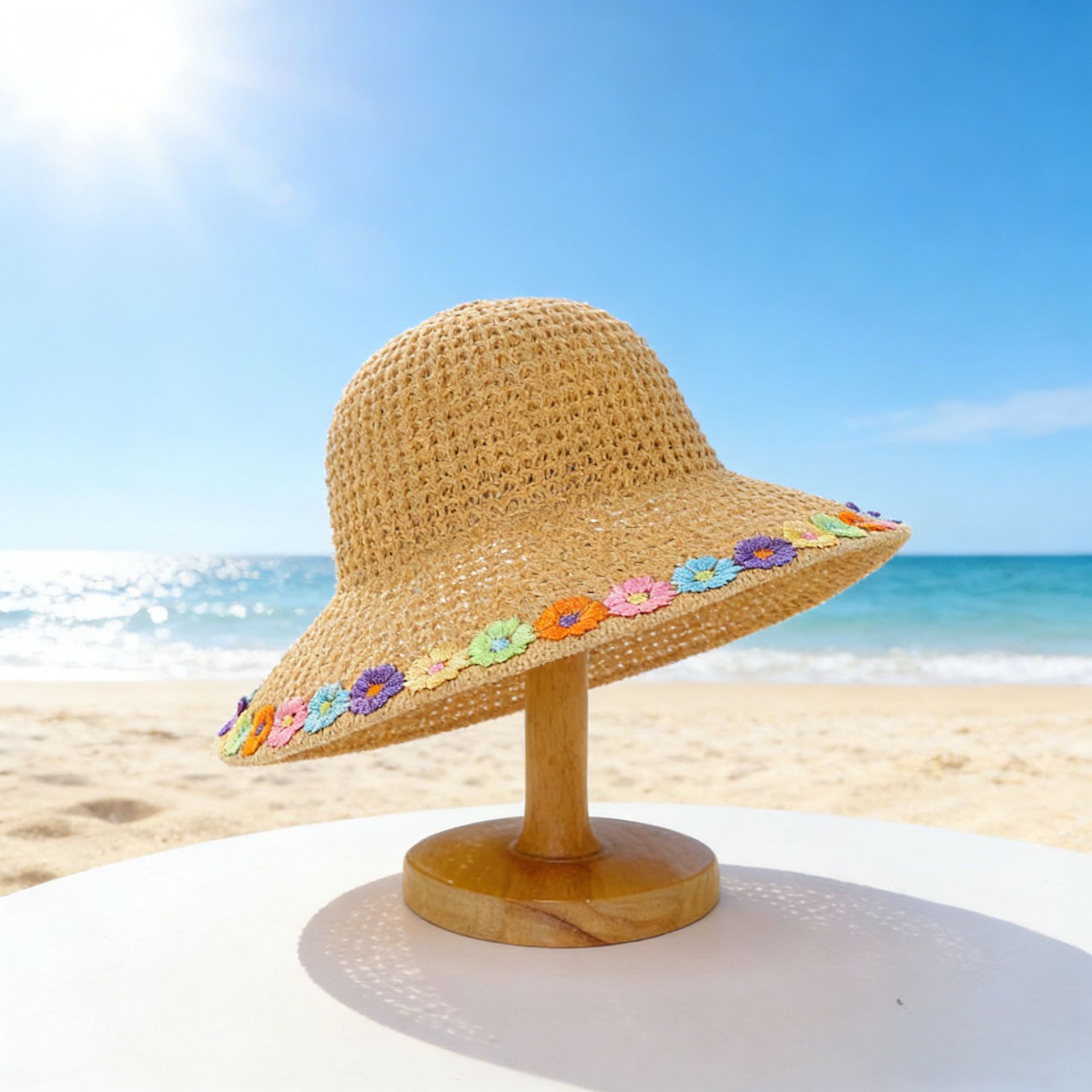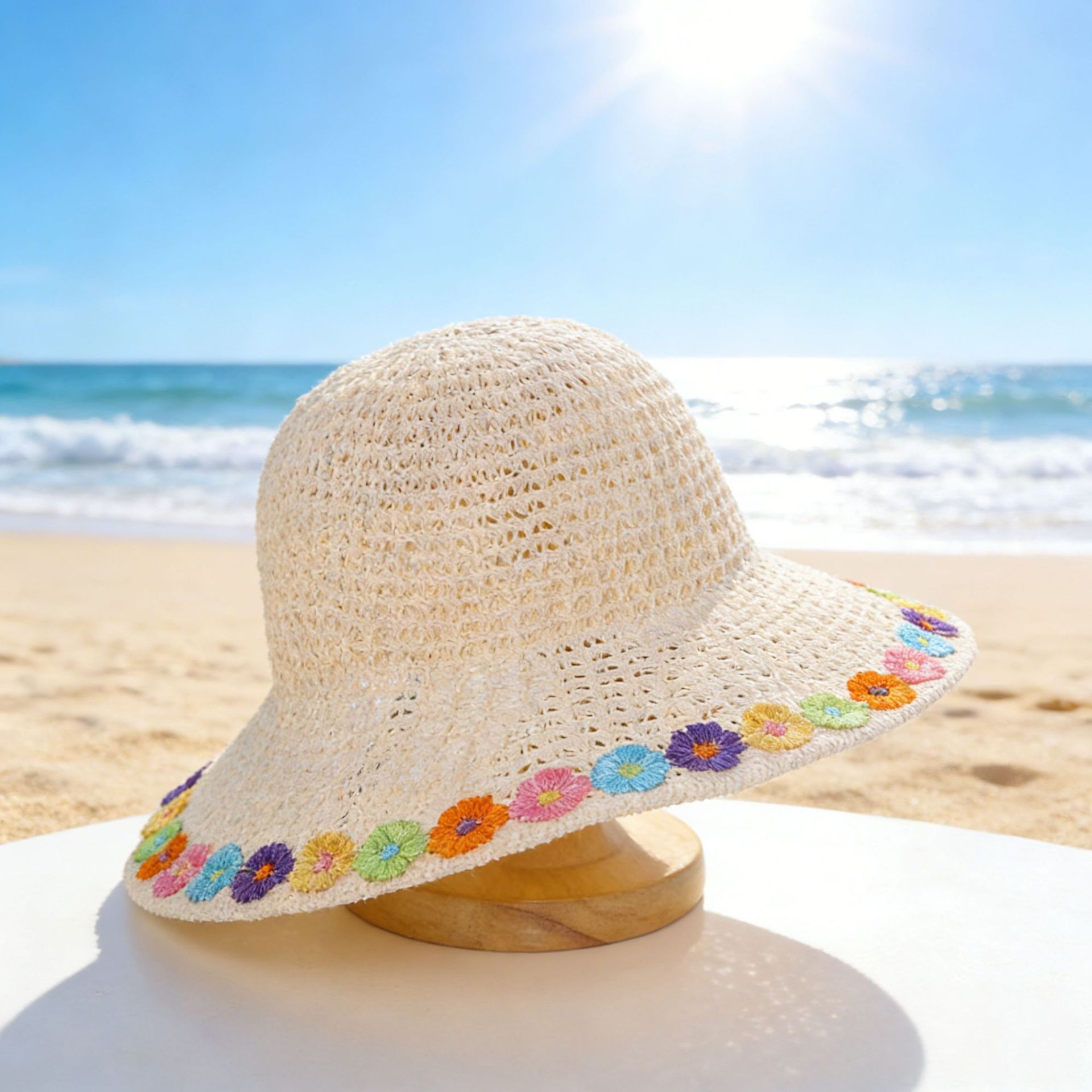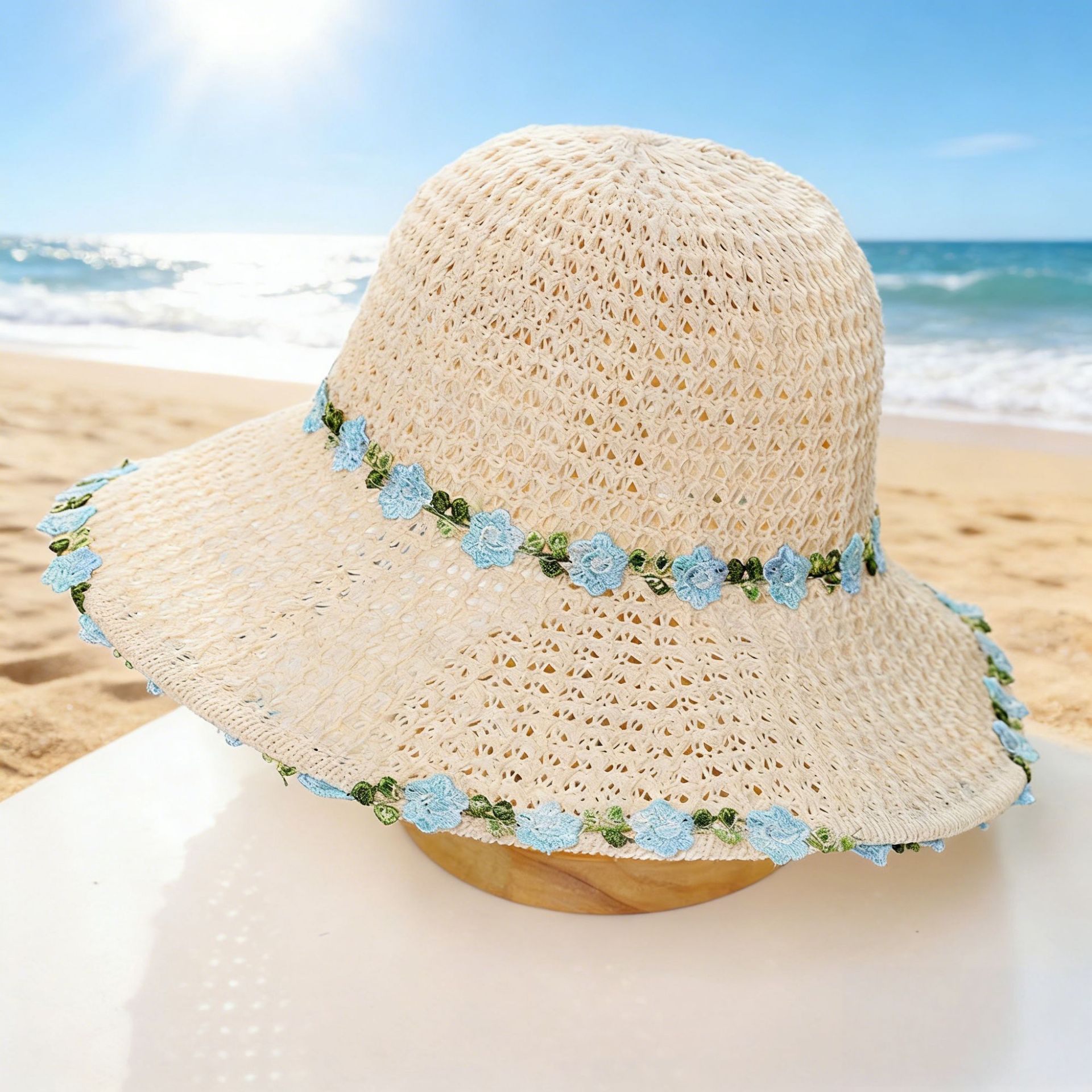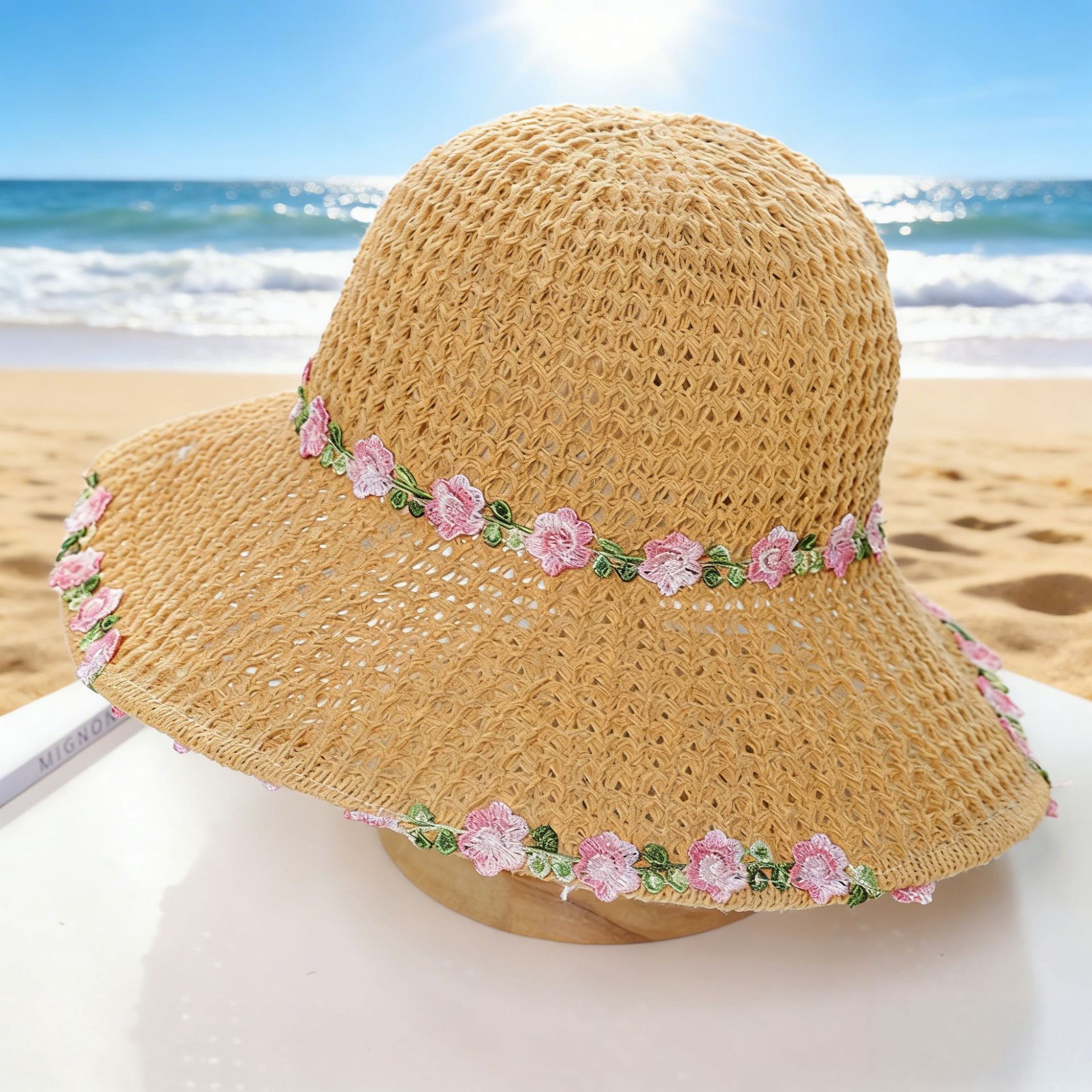 • 단색 꽃무늬 밀짚모자 - 미색
