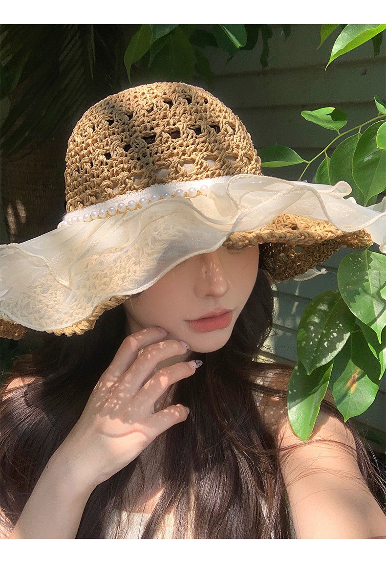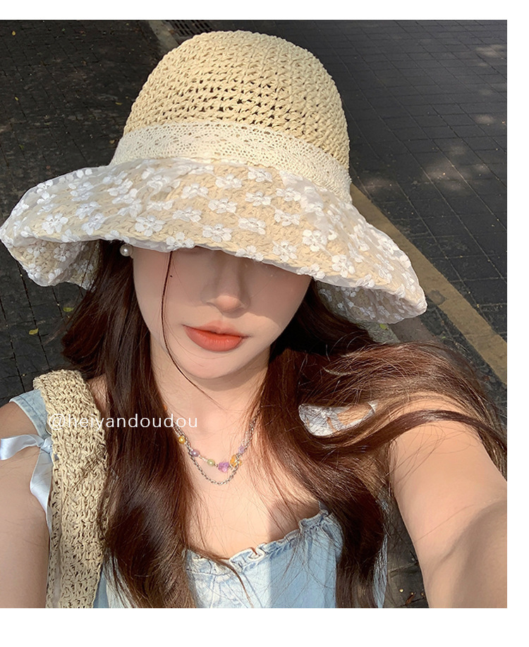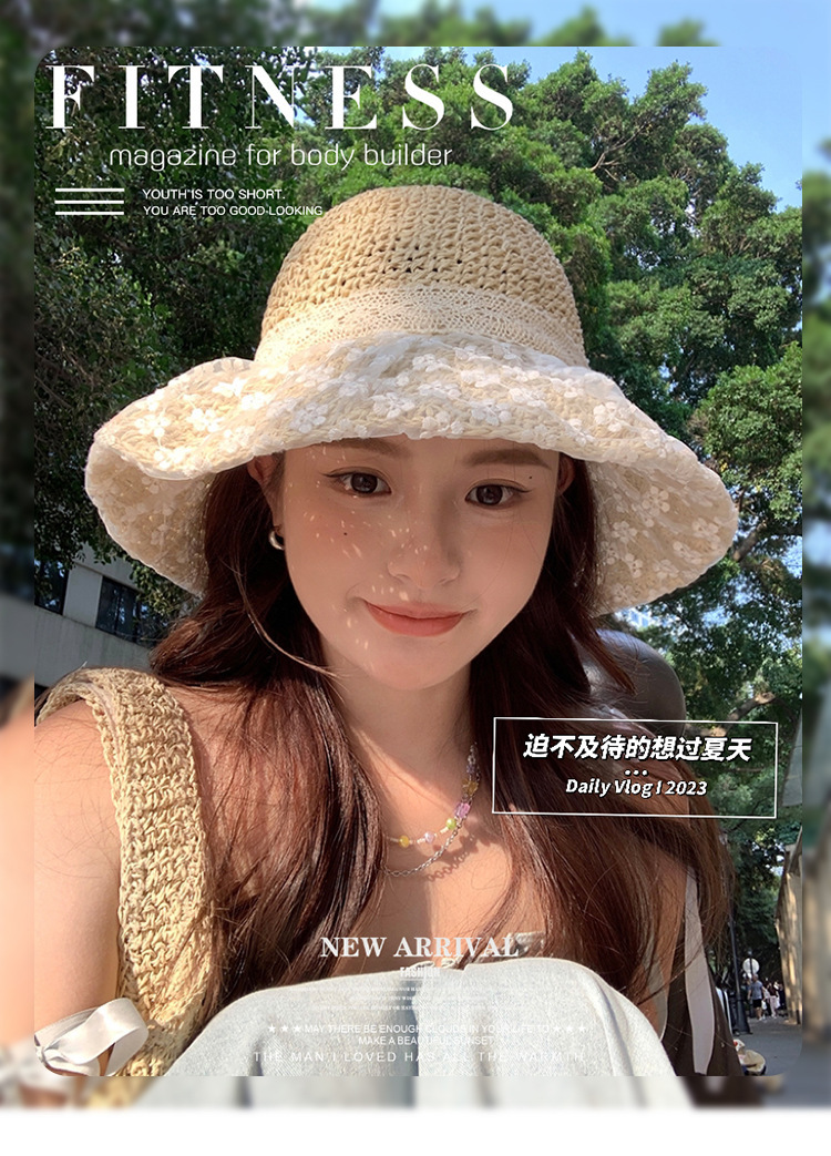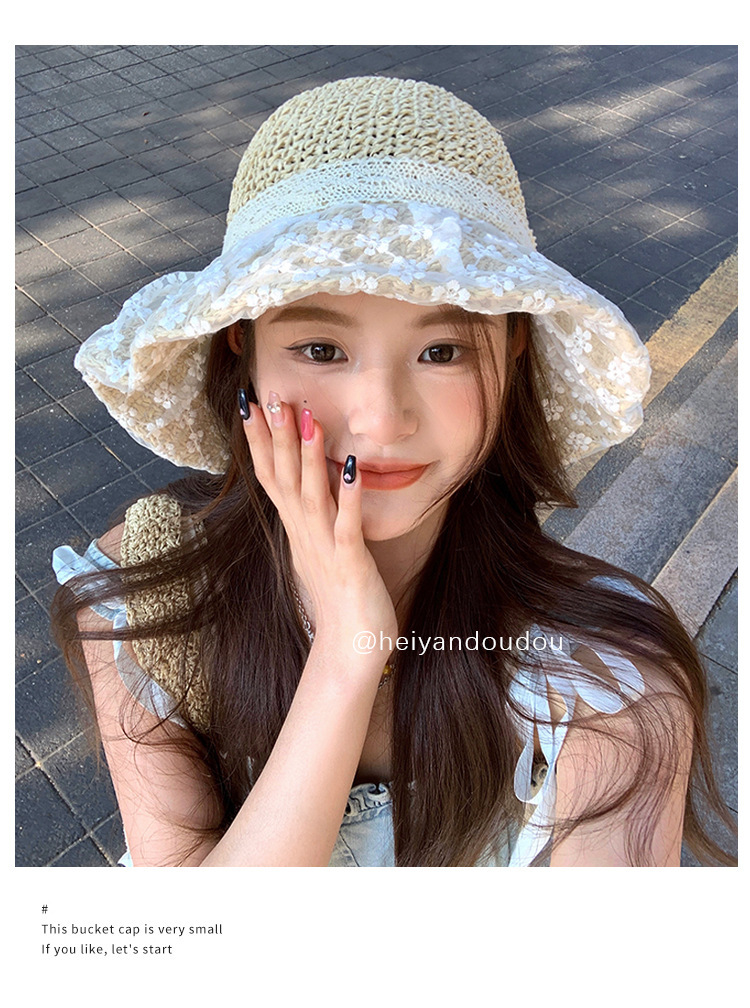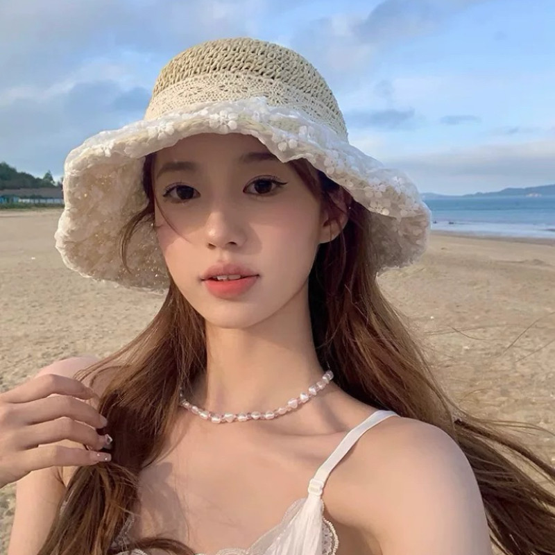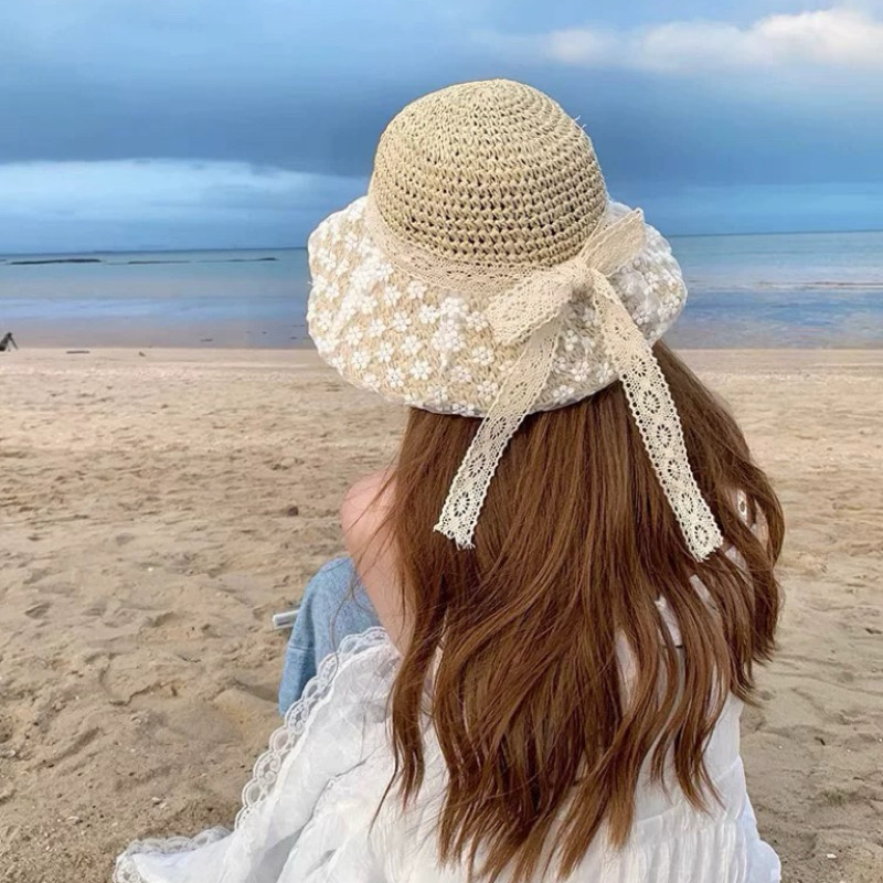 밀짚 모자 여성의 새로운 일본식 작은 신선한 레이스 밀짚 모자 여름 여행 태양 보호 모자 큰 챙 해변 태양 모자스토어 가기