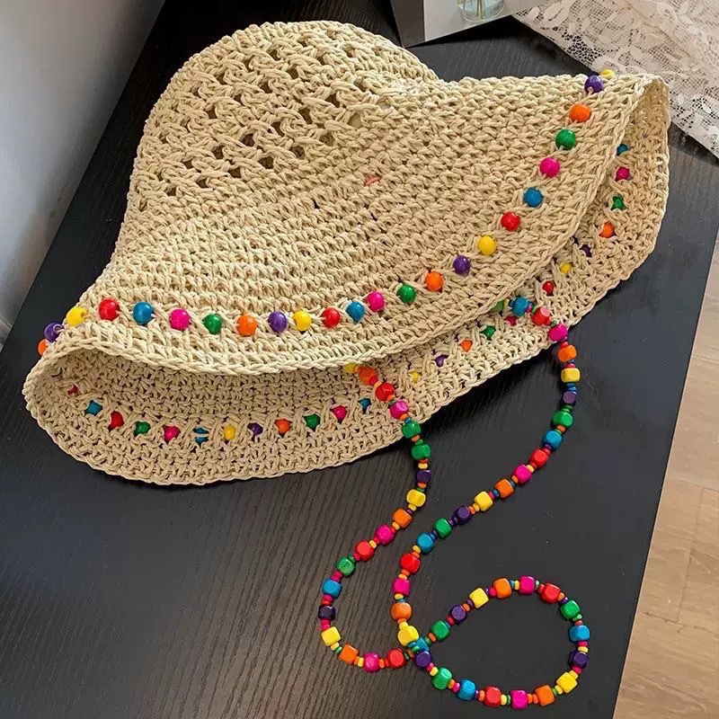 • 컬러 비즈 목걸이 밀짚모자 – 미색