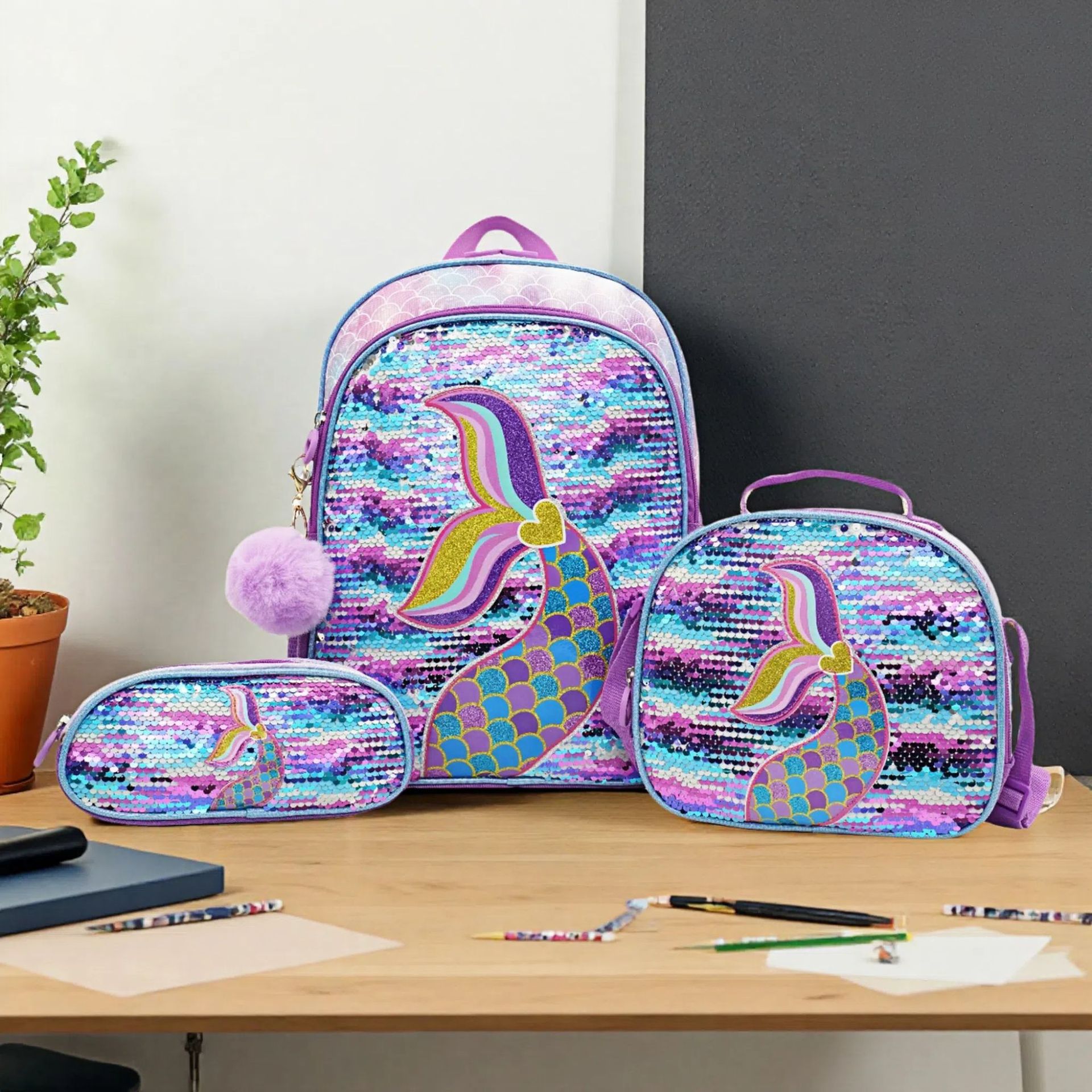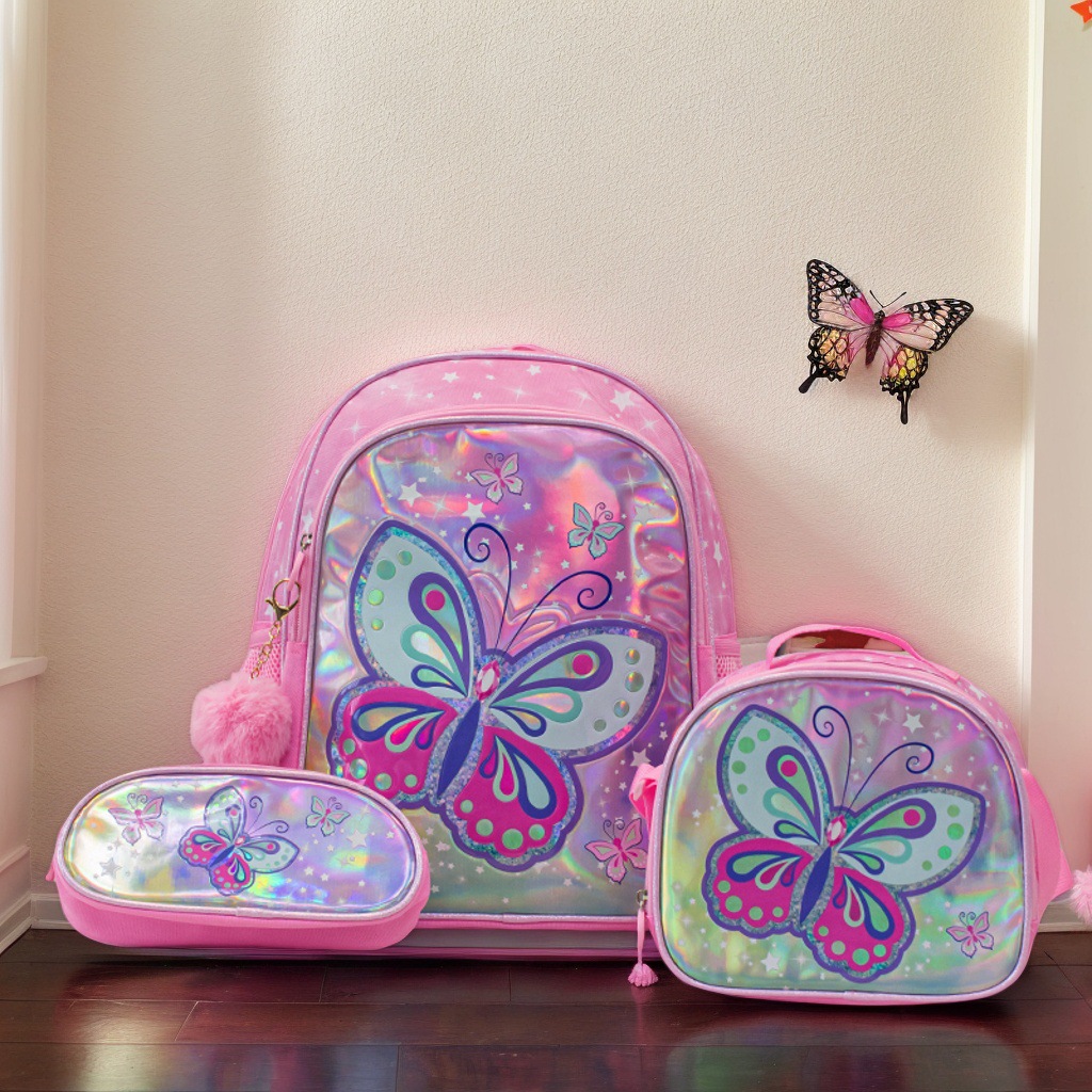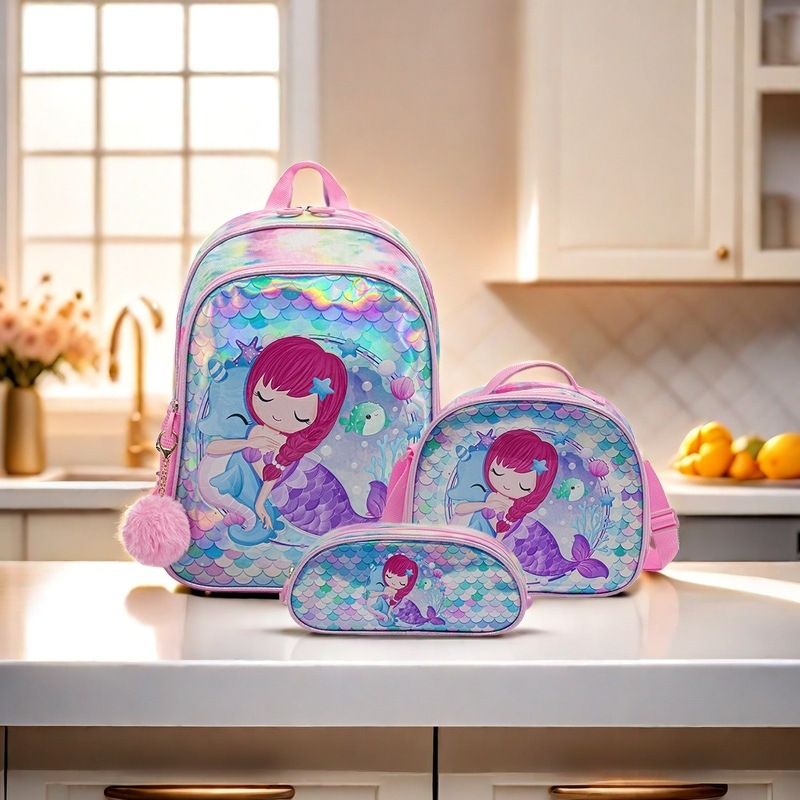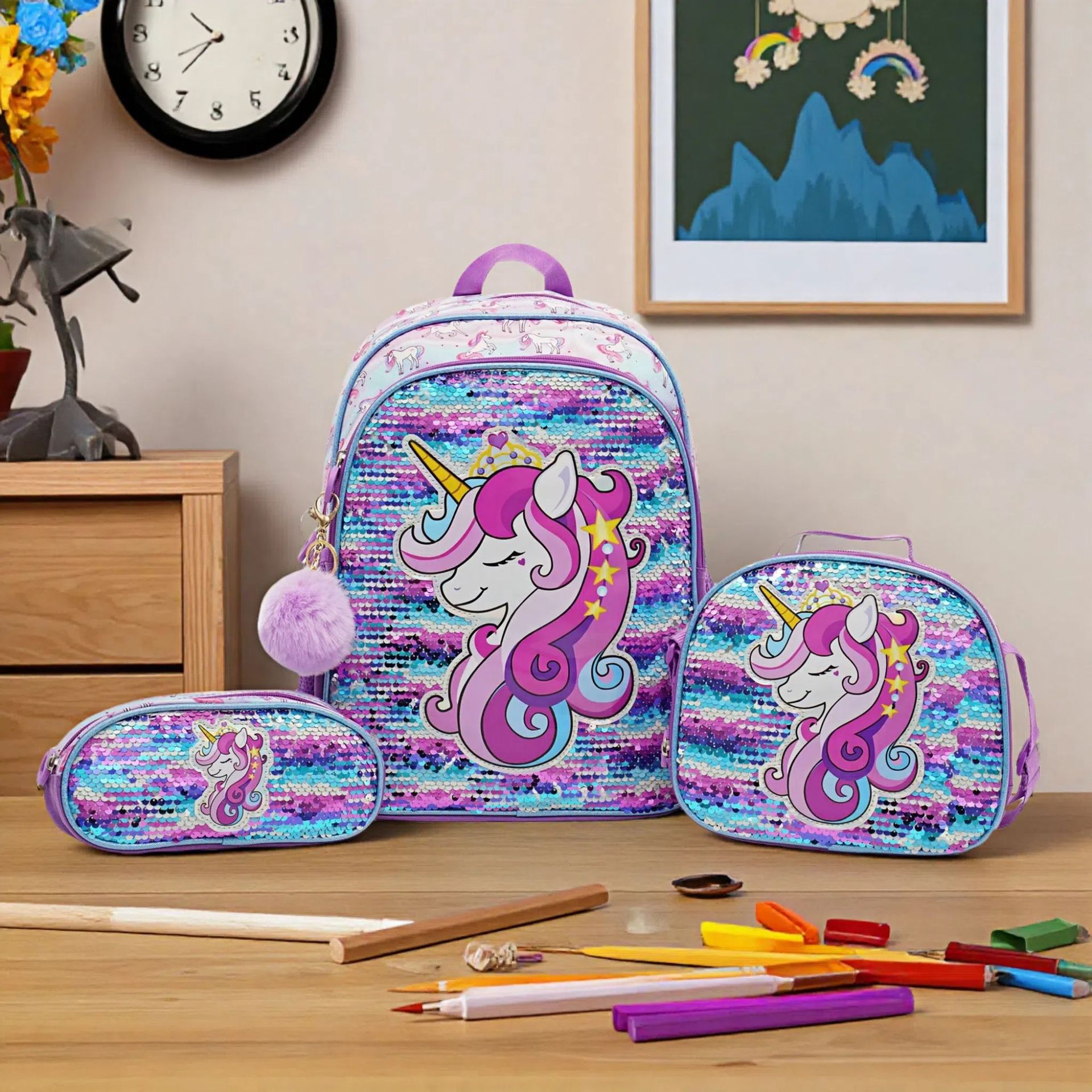 새로운 유니콘 스팽글 초등학생 범용 학교 가방 3 피스 세트 대용량 부담 감소 척추 보호 어린이 배낭