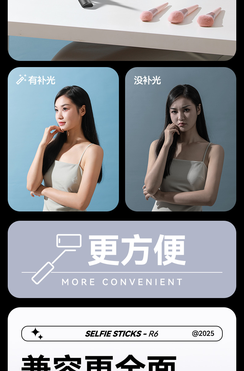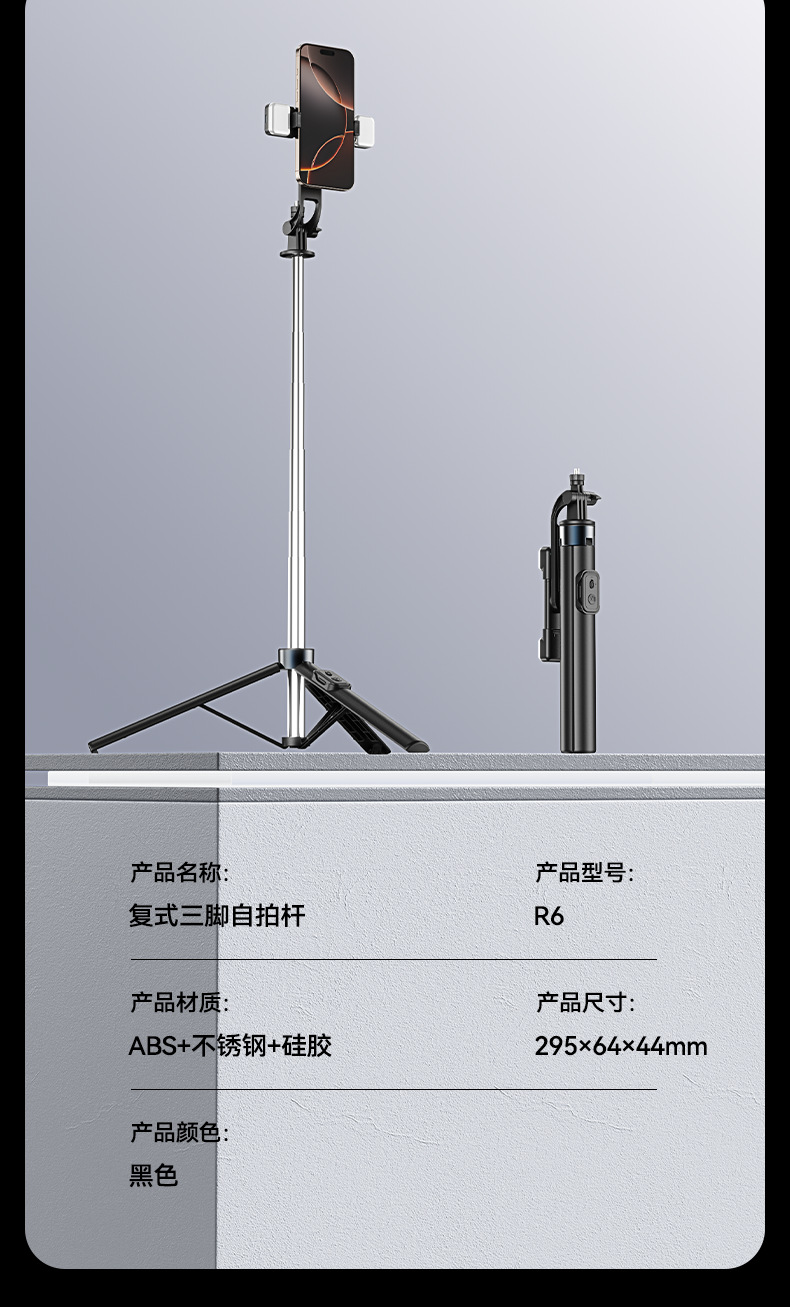 새로운 R6 휴대 전화 블루투스 셀카 스틱 채우기 조명 길이 1.85 m 데스크탑 휴대 전화 라이브 삼각대 브래킷