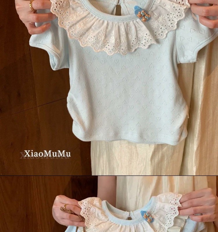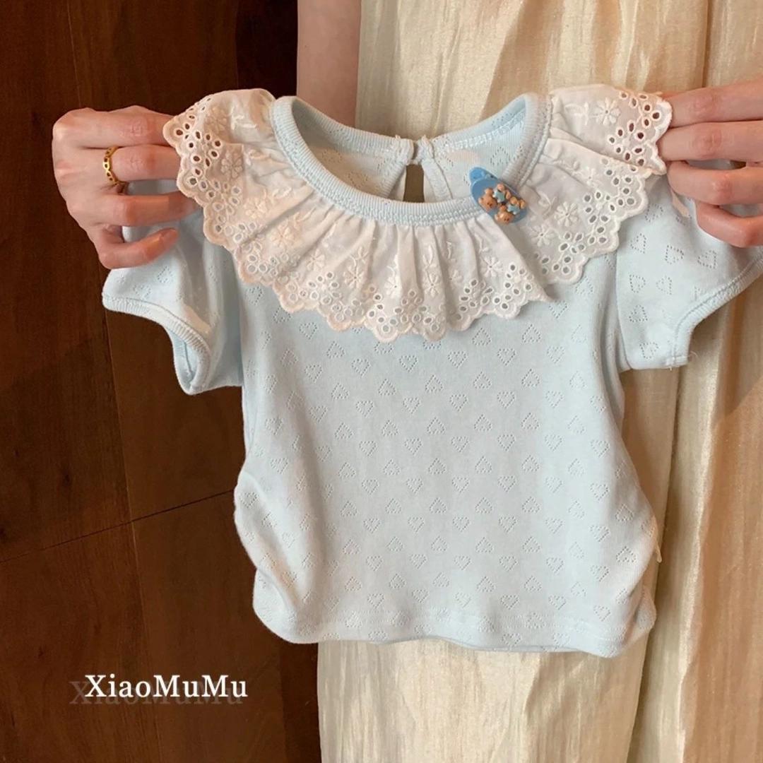 여자 반팔 레이스 티셔츠 2025 여름 새 소녀 아기 유행 캐주얼 올 매치 옷깃 탑스토어 가기