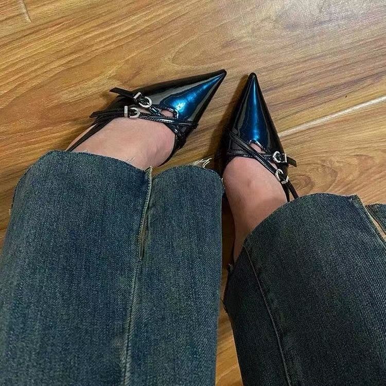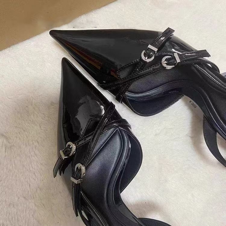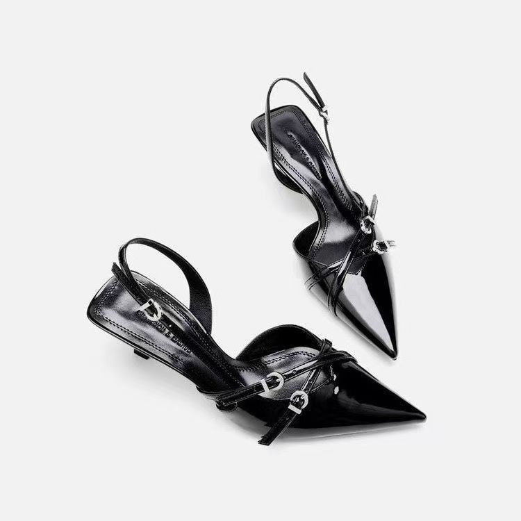 리벳 패셔너블한 포인티드 토 백 스틸레토 여성 여름 포인티드 토 하이힐 페이턴트 가죽 토 원 스트랩 샌들 2025