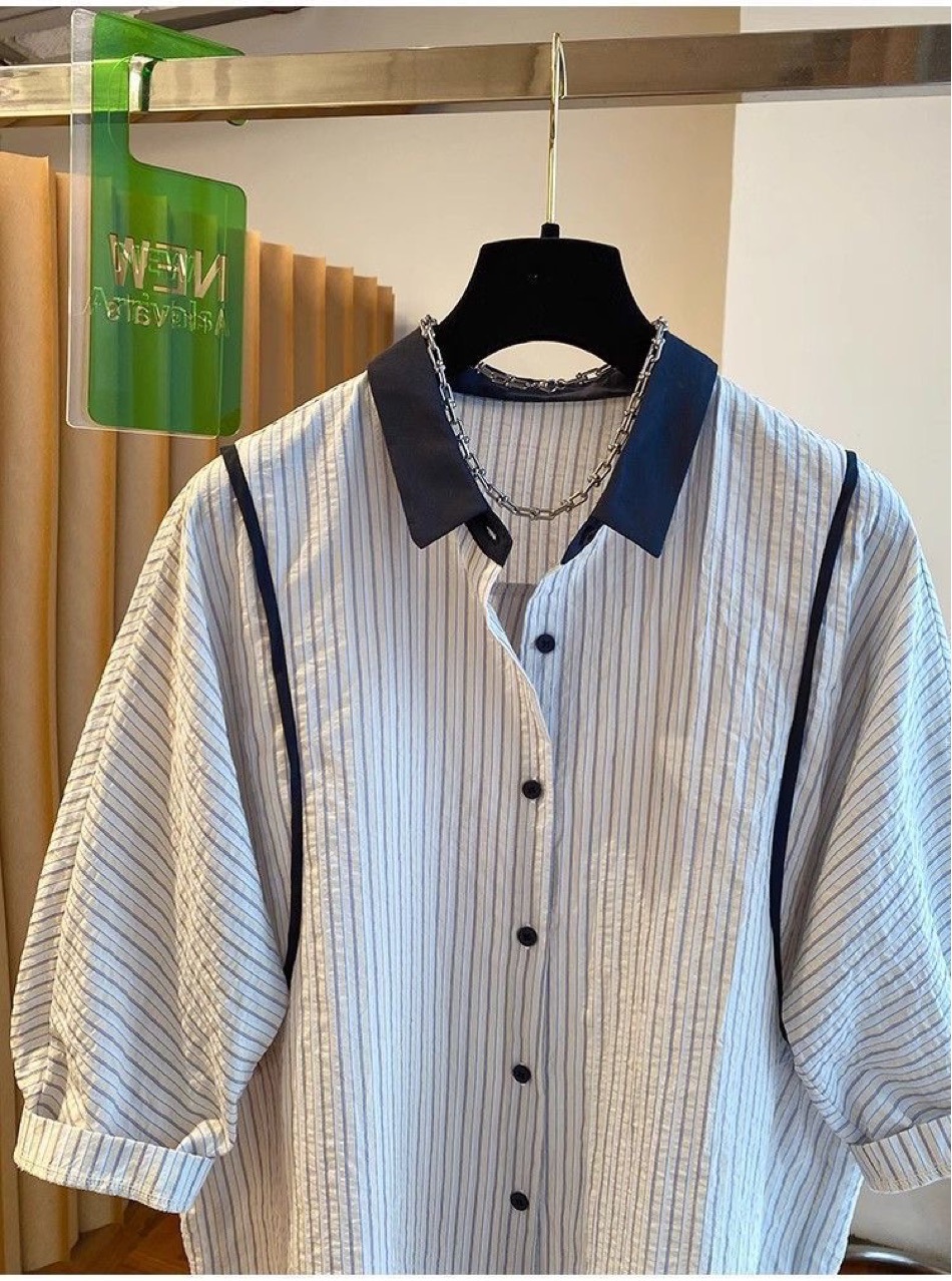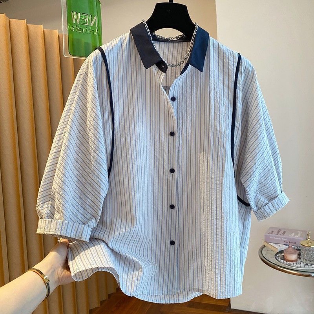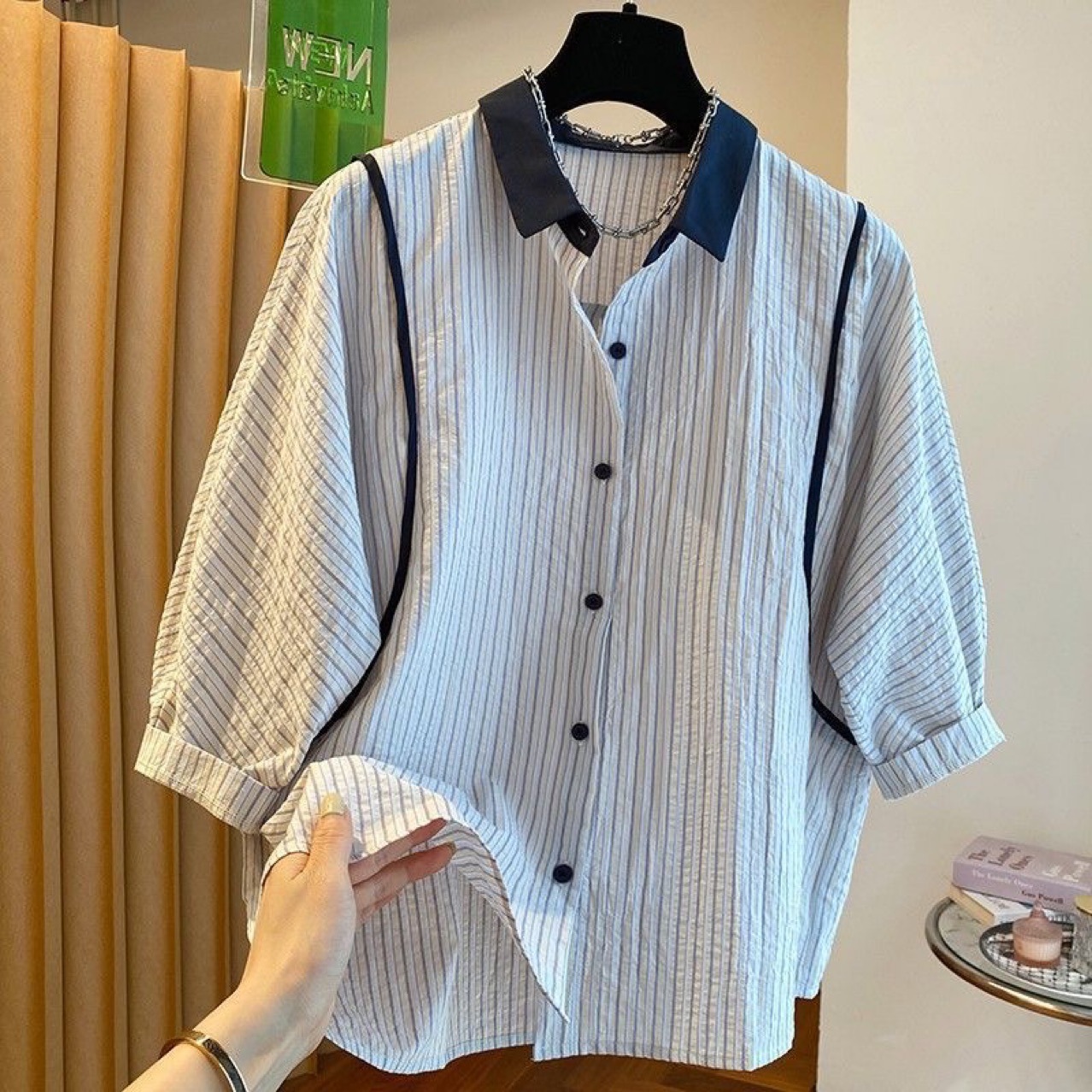 줄무늬 반팔 셔츠 여성 여름 2025 새로운 느슨한 캐주얼 서양식 얇은 작은 셔츠 5 점 퍼프 슬리브 탑스토어 가기