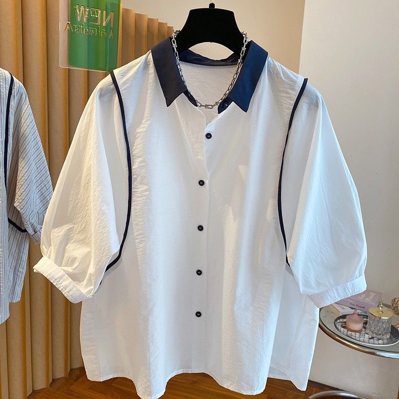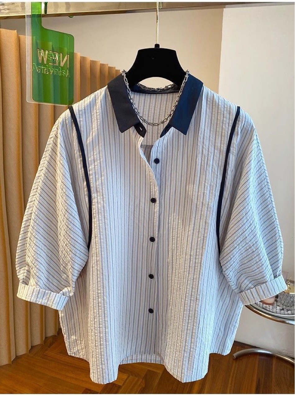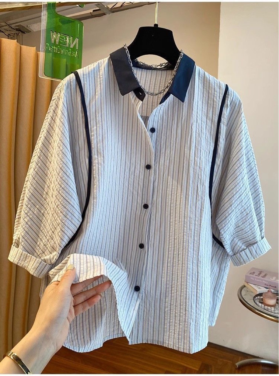 줄무늬 반팔 셔츠 여성 여름 2025 새로운 느슨한 캐주얼 서양식 얇은 작은 셔츠 5 점 퍼프 슬리브 탑스토어 가기