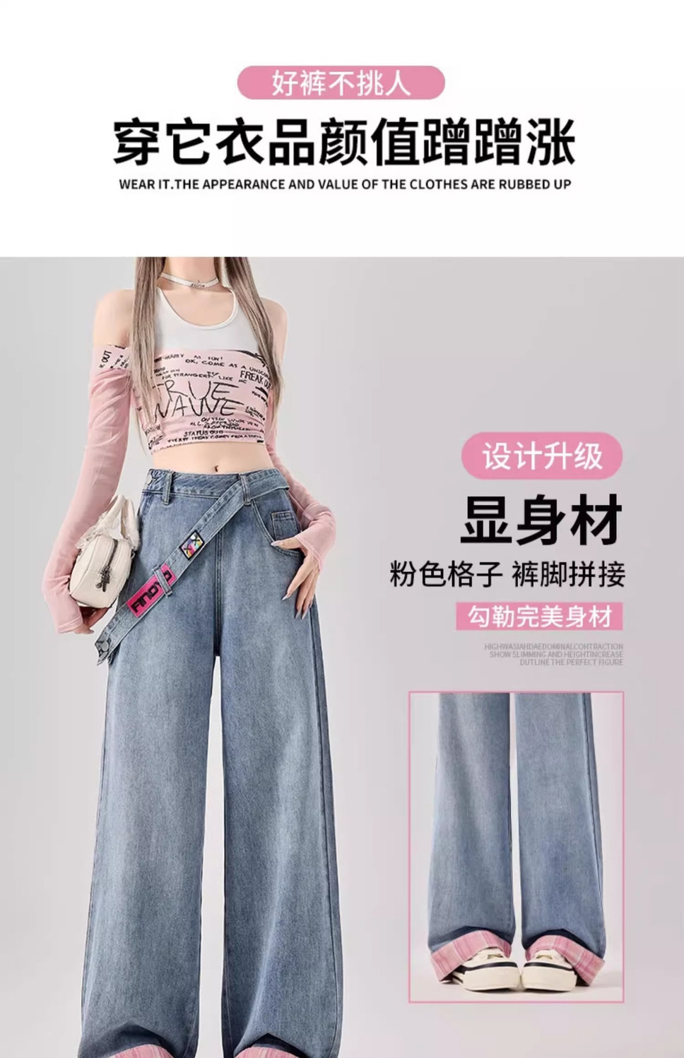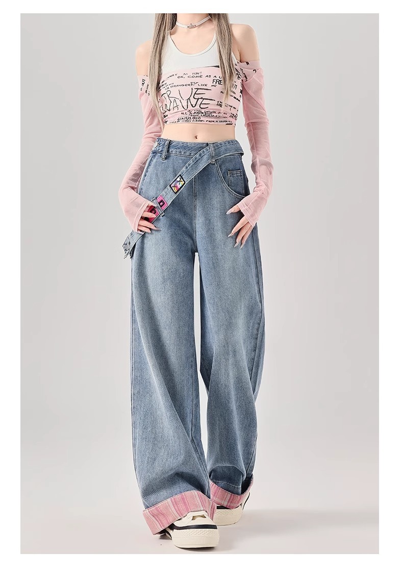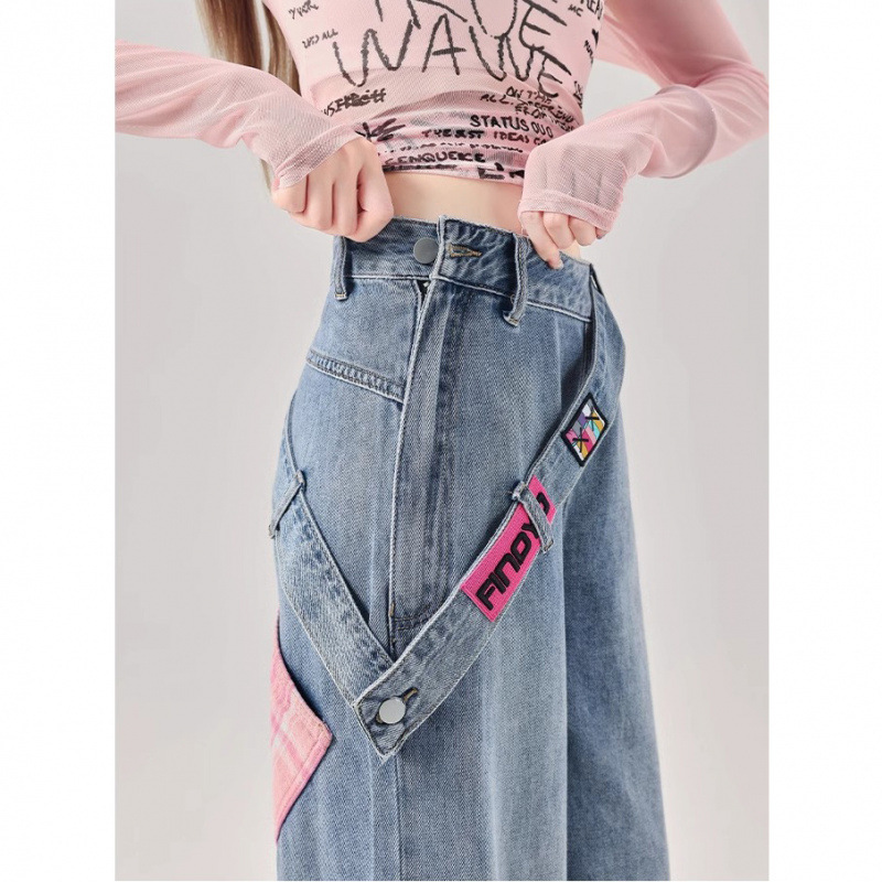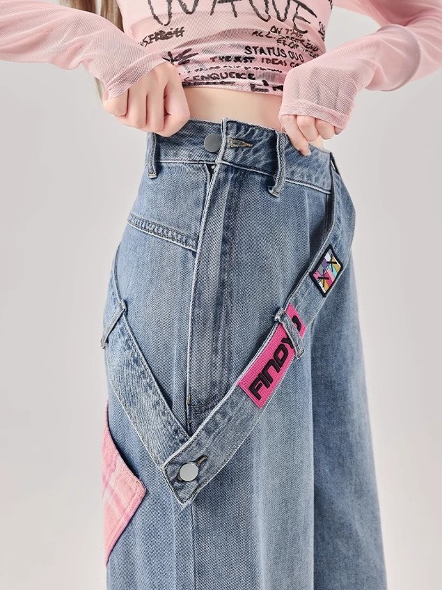 여성을위한 미국 복고풍 사이드 지퍼 청바지 봄 새로운 스티치 대비 색상 미국 하이 웨이스트 스트레이트스토어 가기