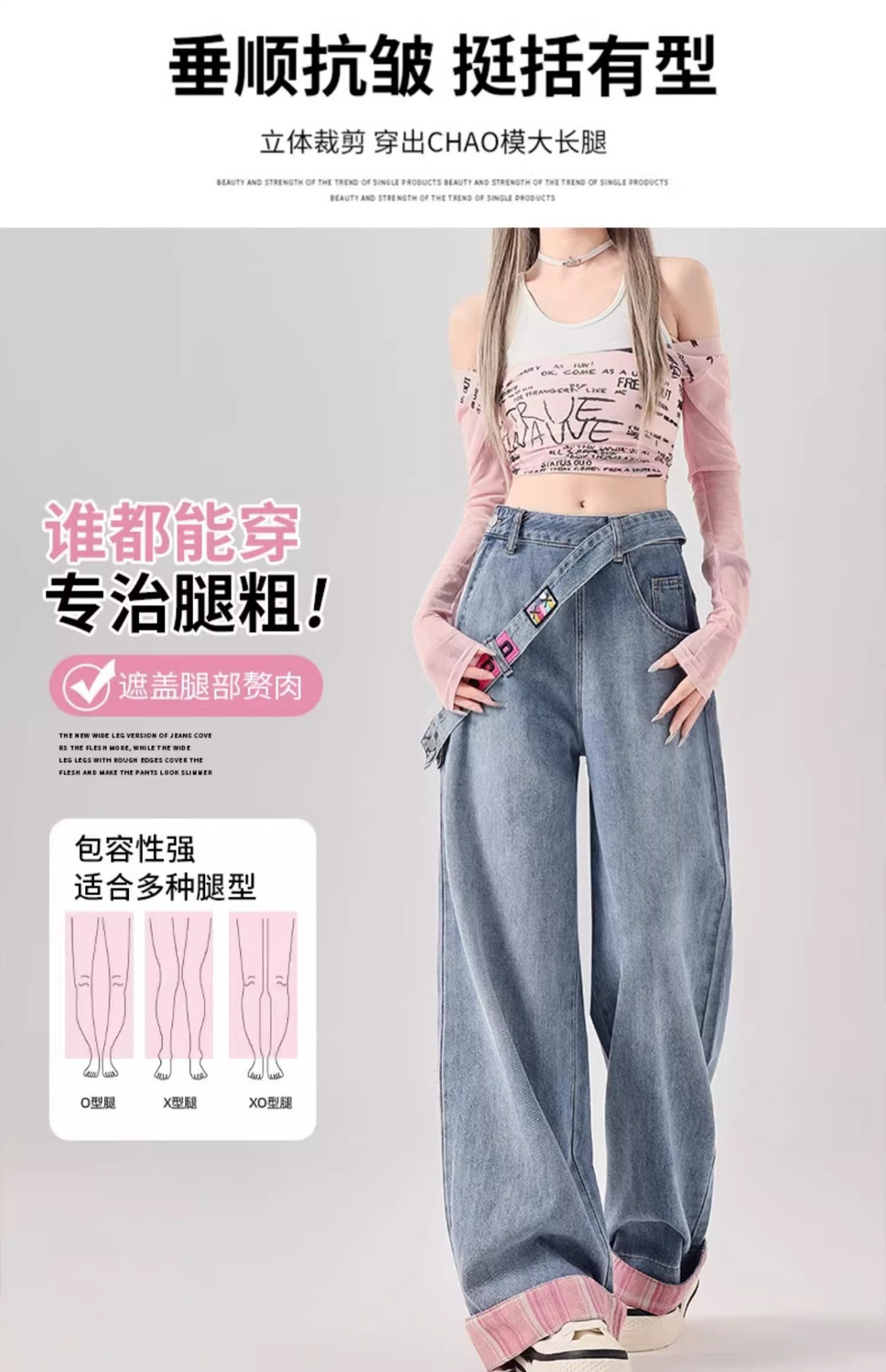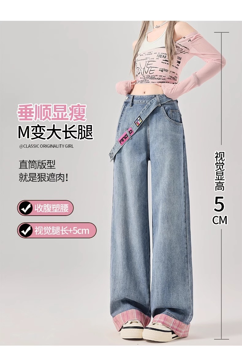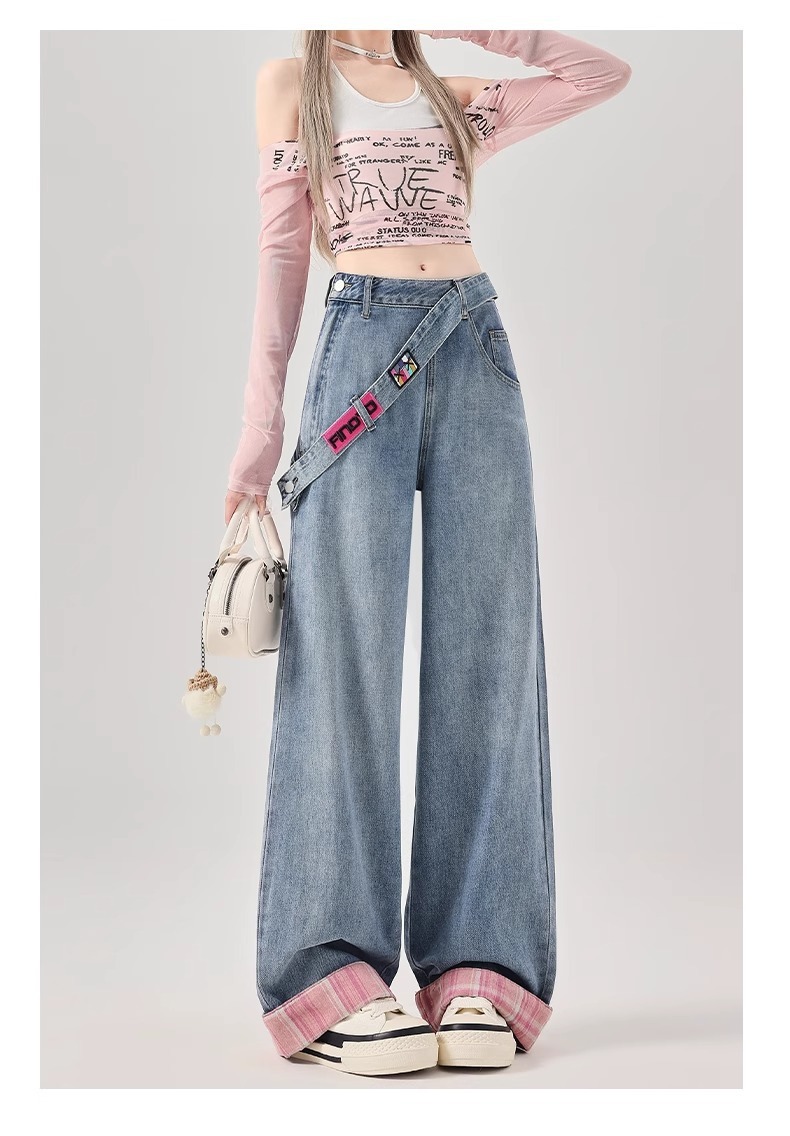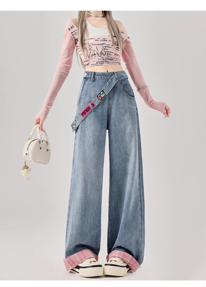 여성을위한 미국 복고풍 사이드 지퍼 청바지 봄 새로운 스티치 대비 색상 미국 하이 웨이스트 스트레이트스토어 가기