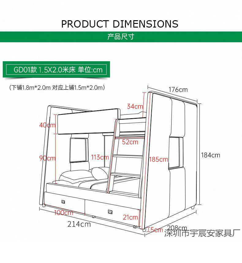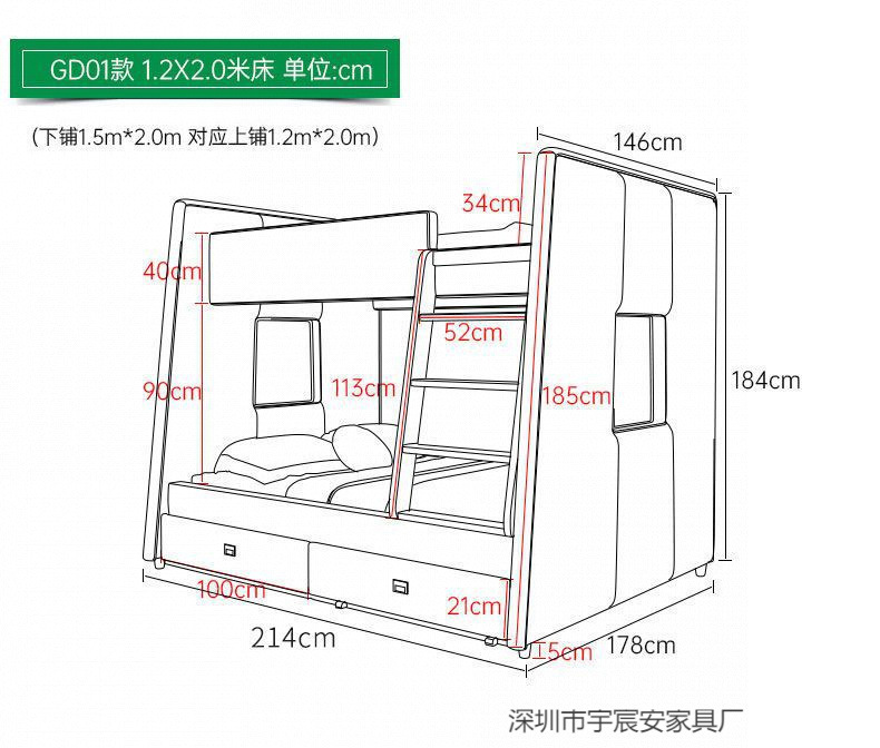 • 상부 침대 폭 150cm, 하부 침대 폭 180cm