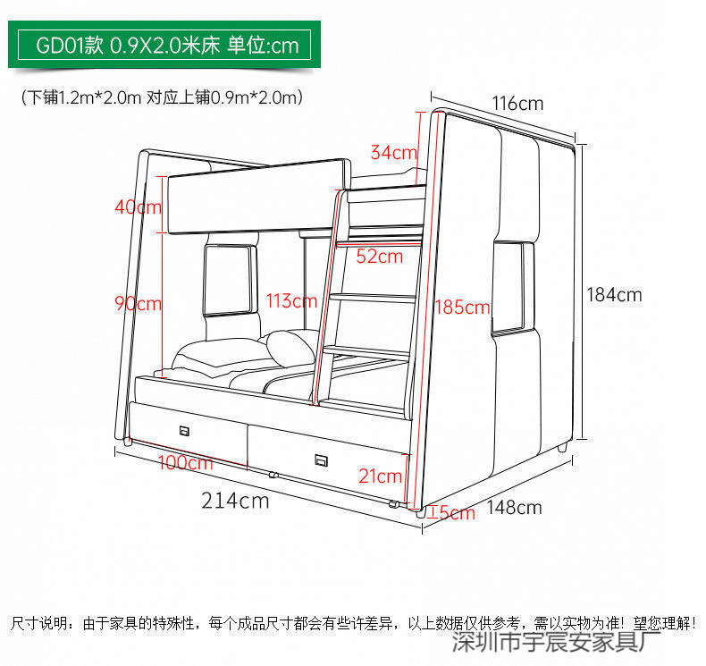 • 상부 침대 폭 90cm, 하부 침대 폭 120cm