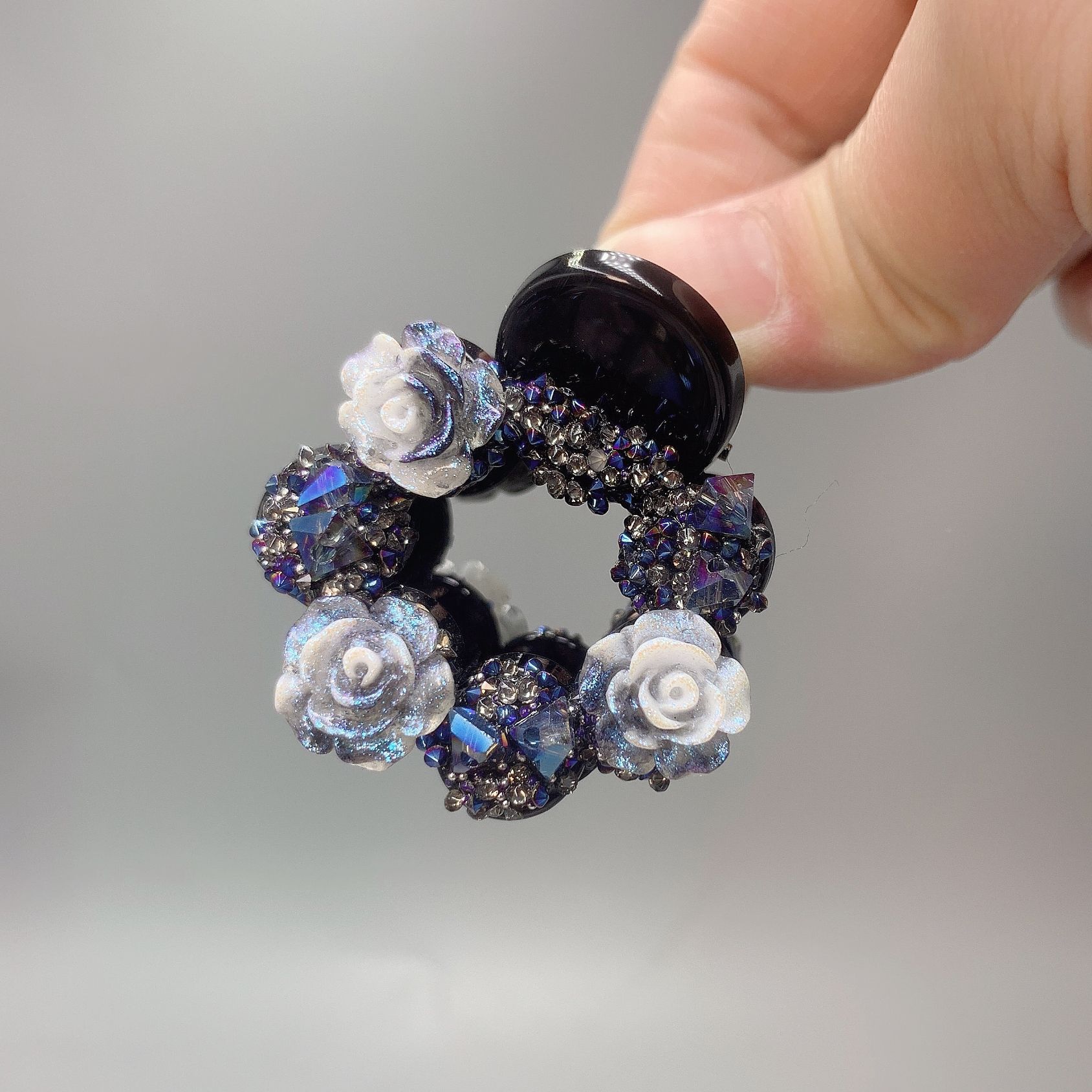 • 그레이 다이아몬드 화이트 플라워 라운드 클립 [4cm]