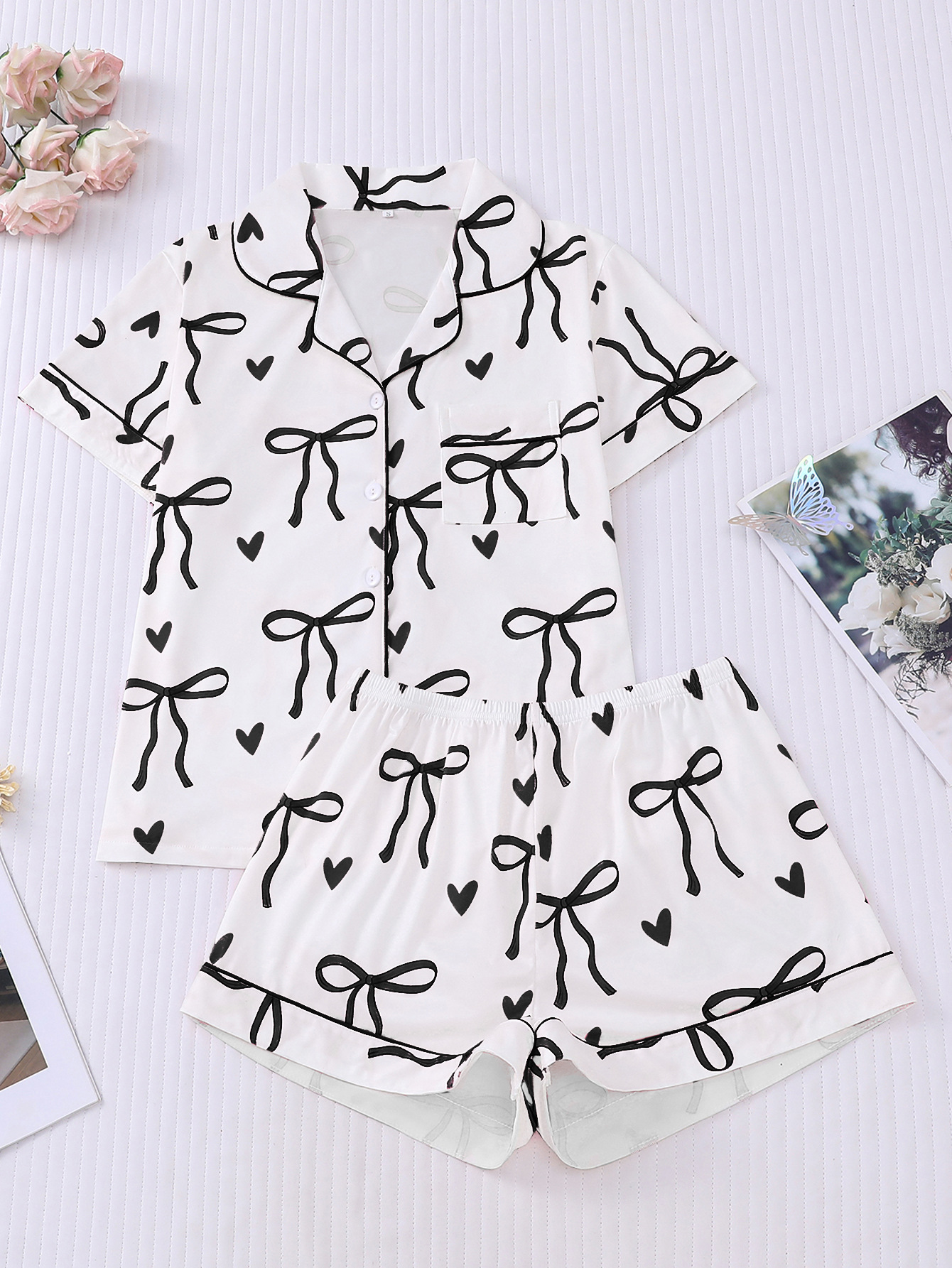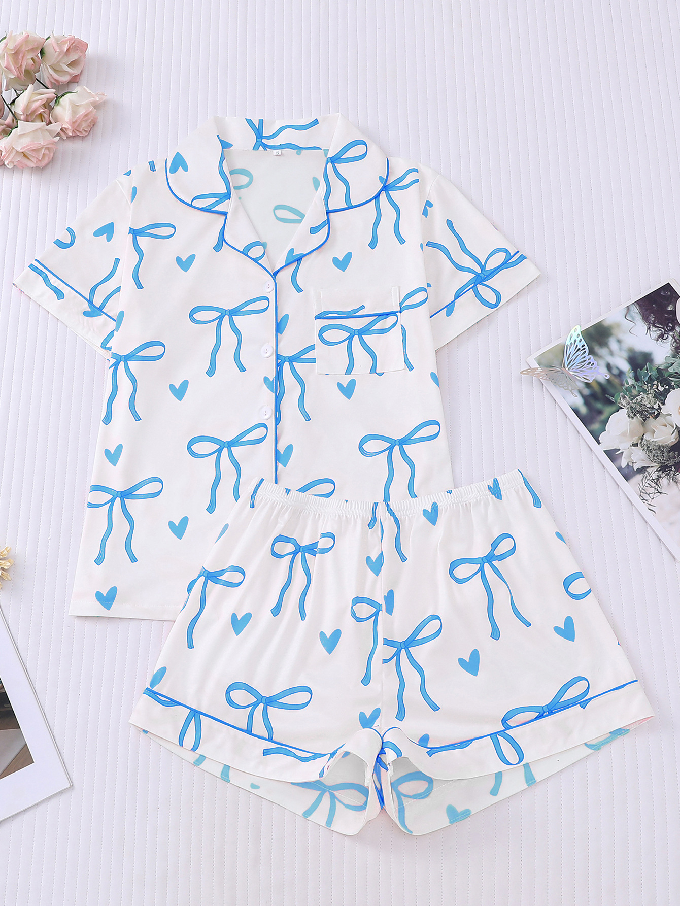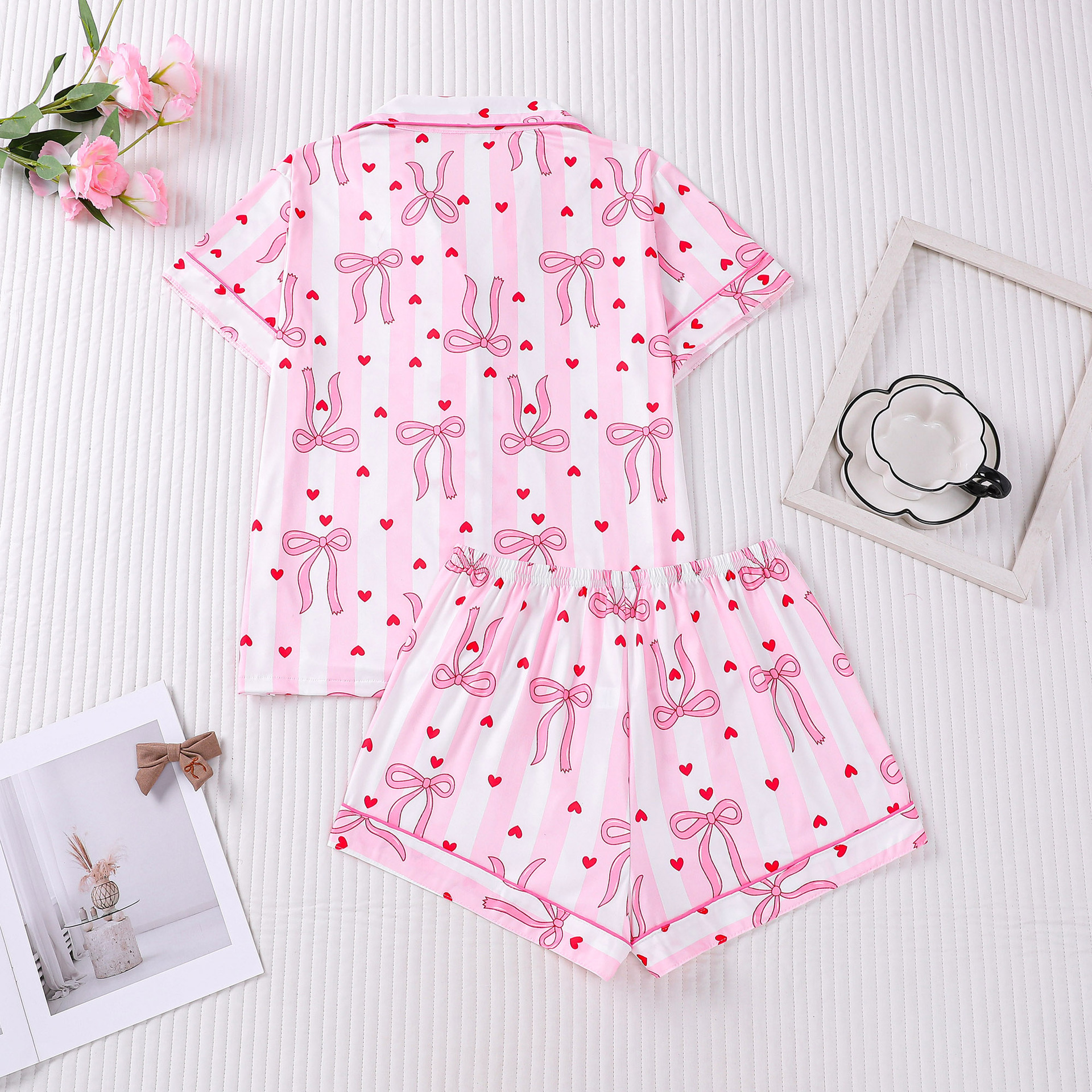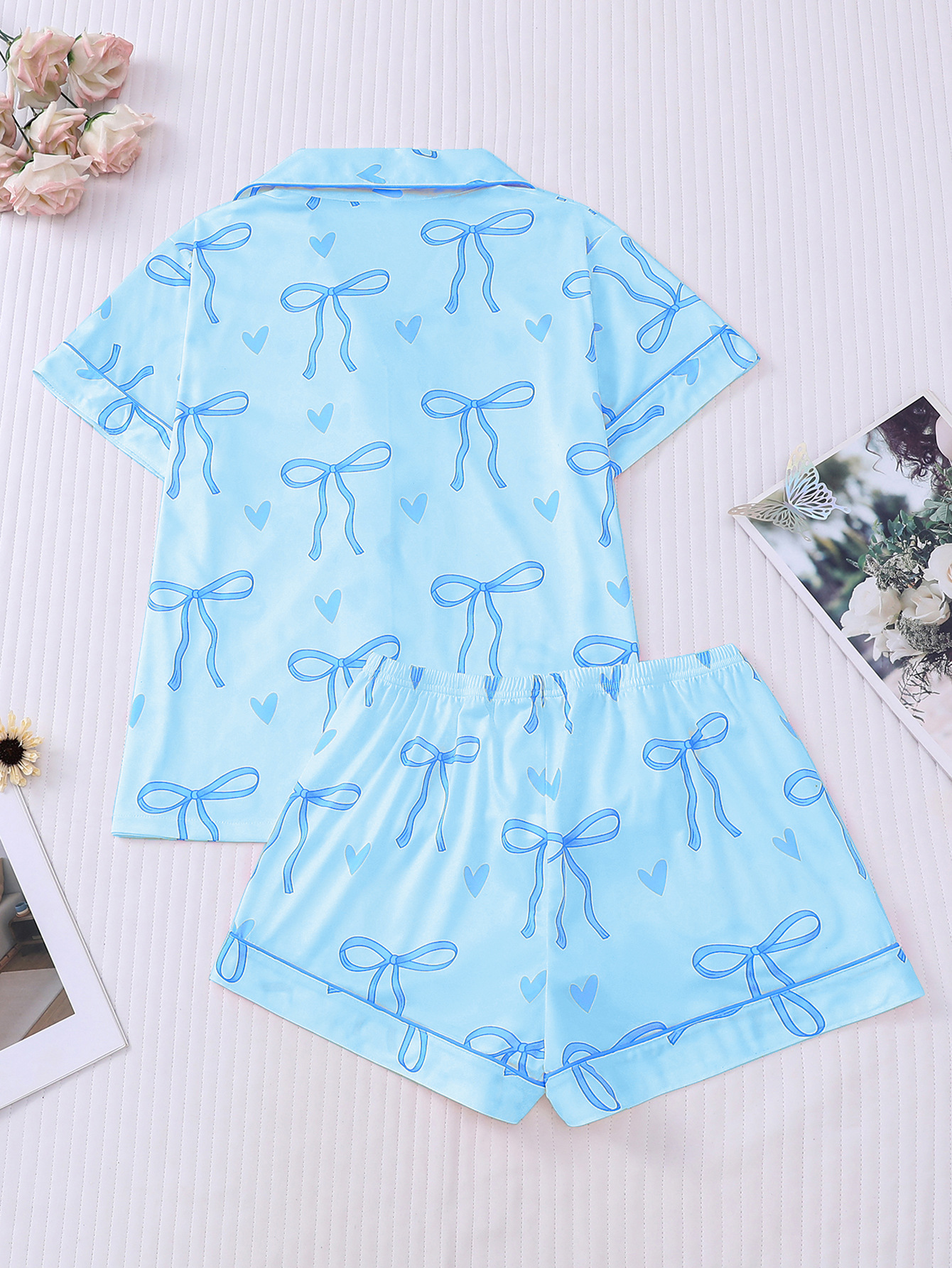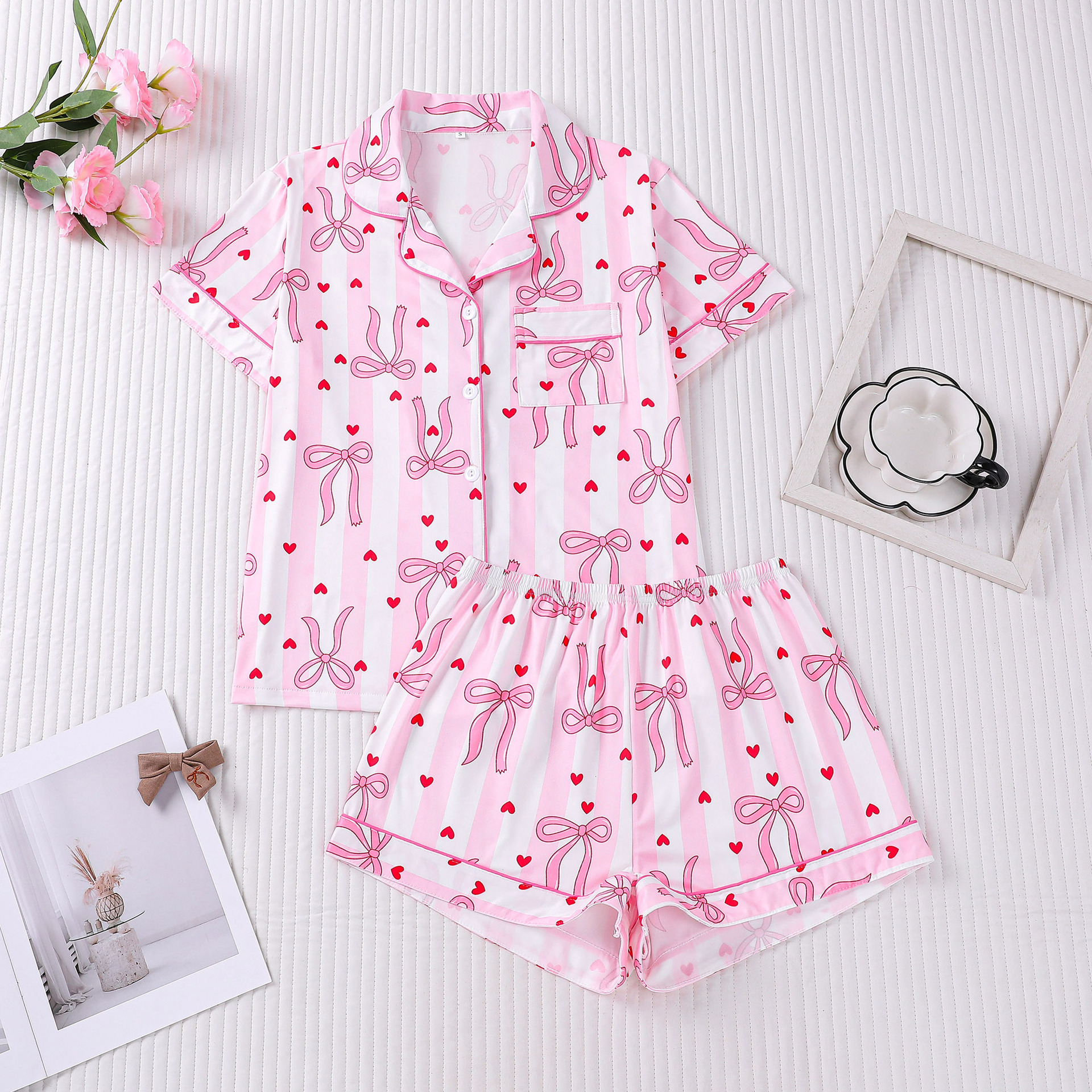국경 간 대외 무역 새로운 스타일의 잠옷 사계절 활 프린트 라펠 느슨한 반팔 반바지 여성 홈웨어 세트