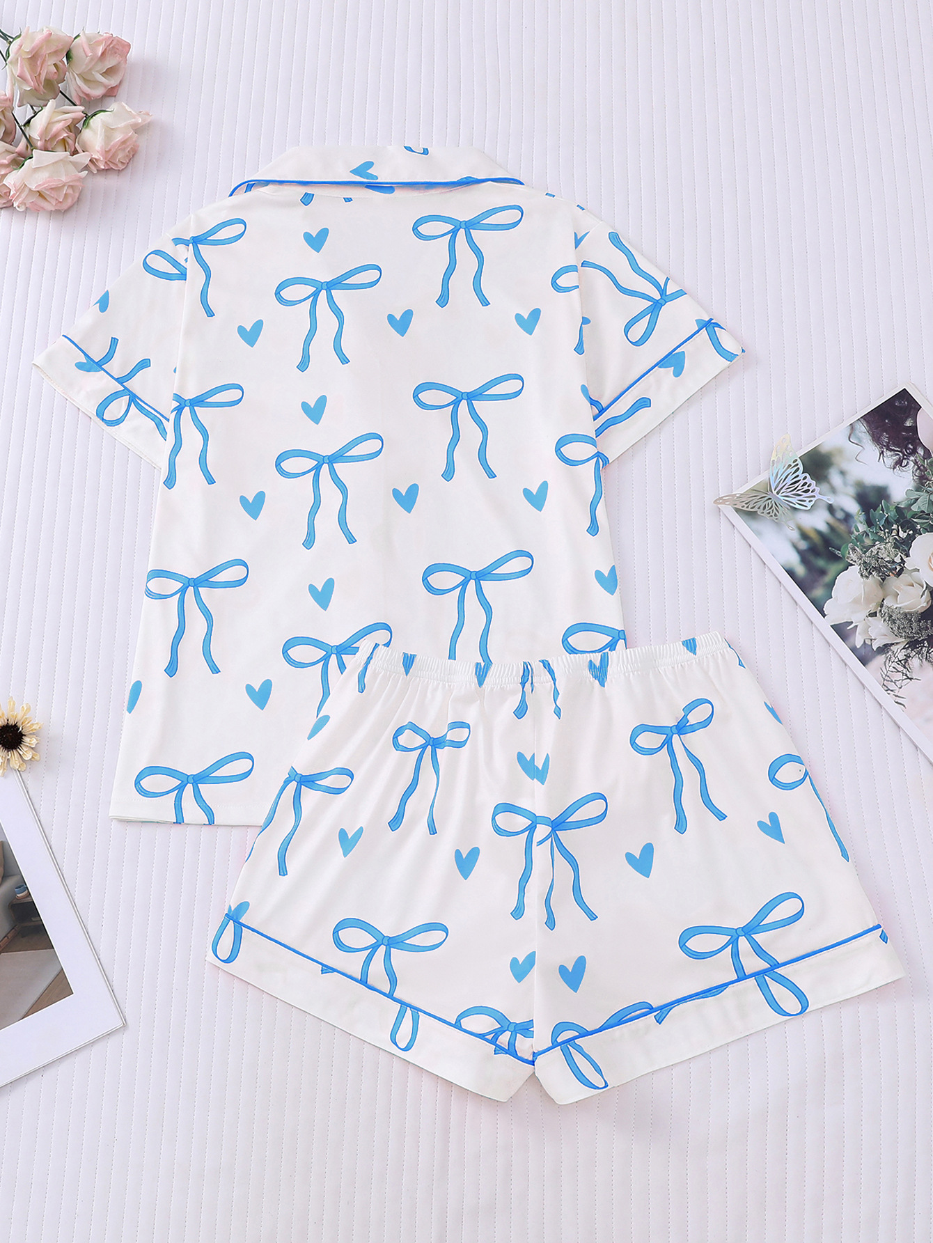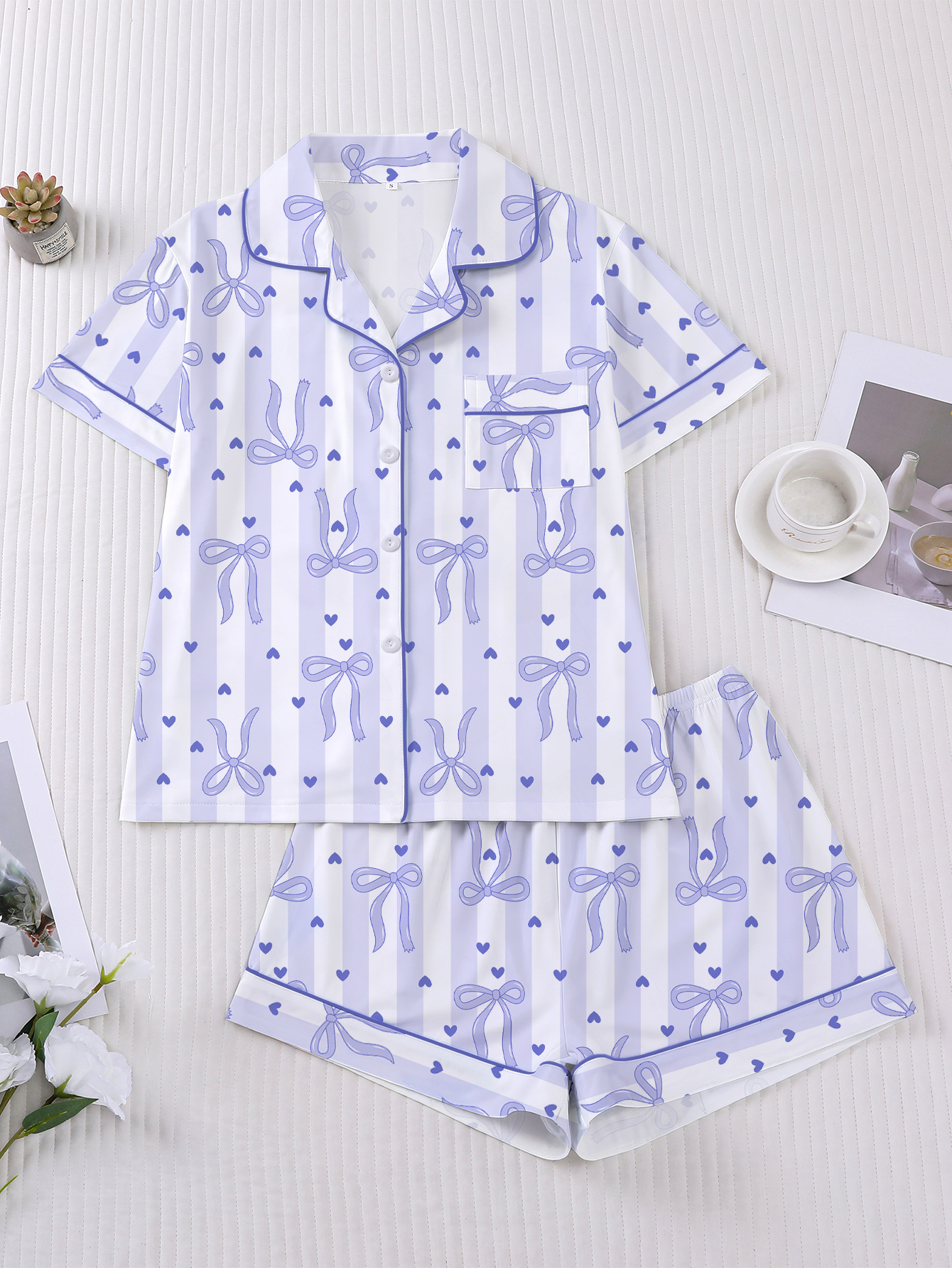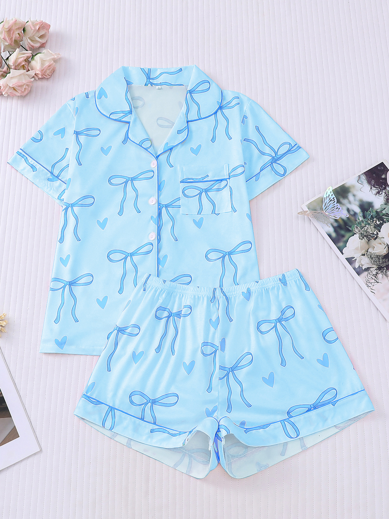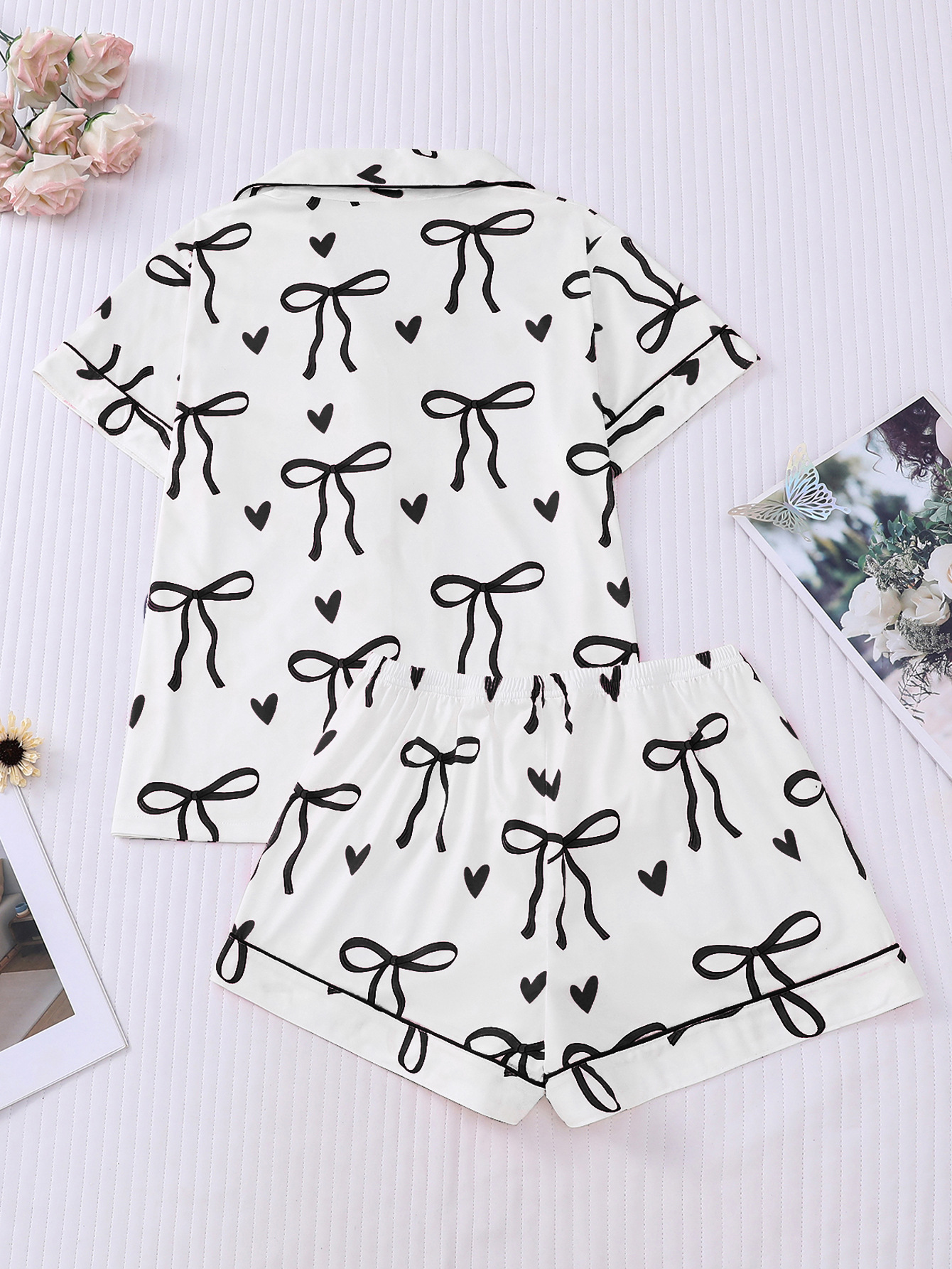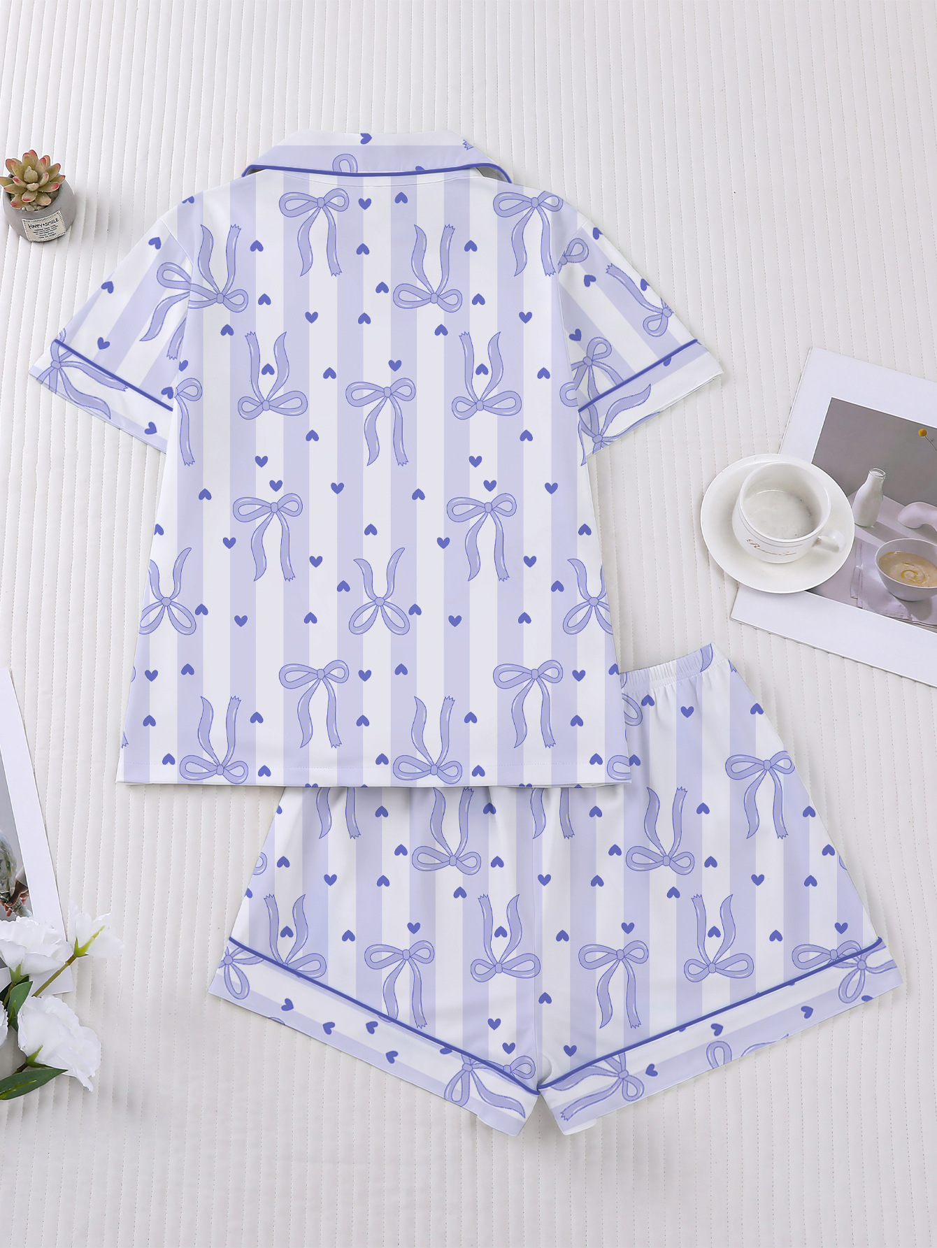 국경 간 대외 무역 새로운 스타일의 잠옷 사계절 활 프린트 라펠 느슨한 반팔 반바지 여성 홈웨어 세트