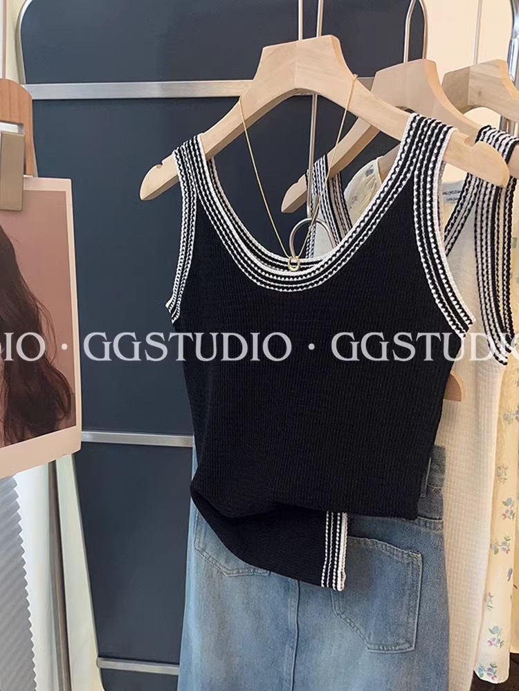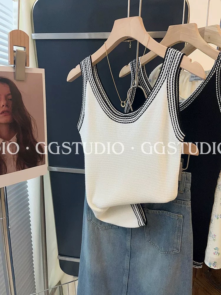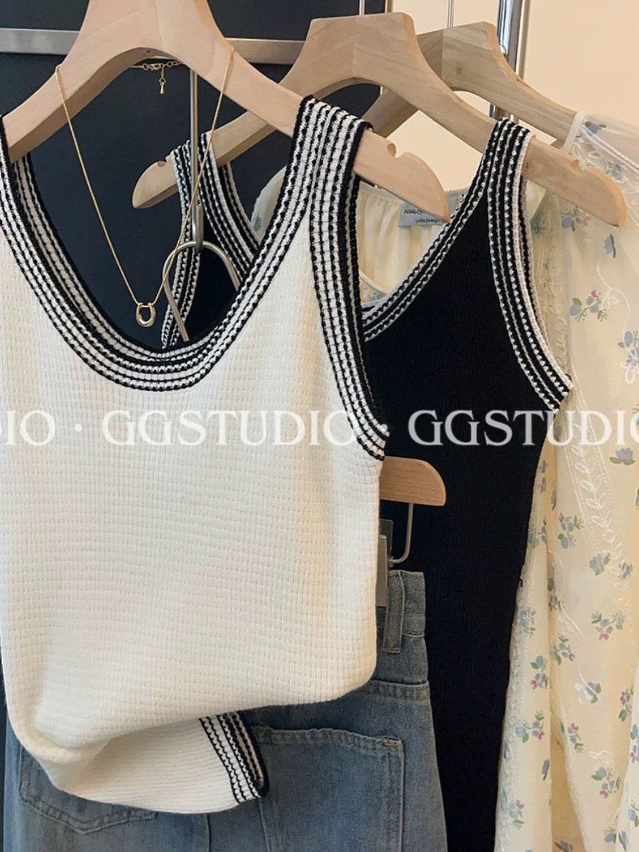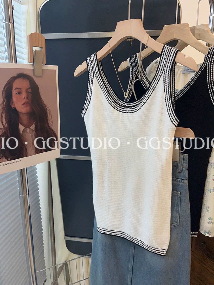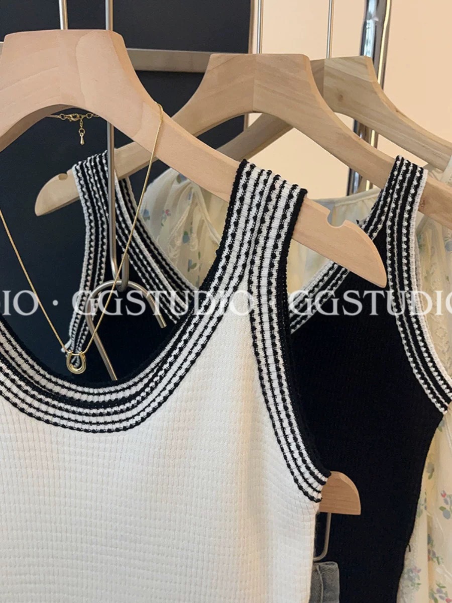 샤넬 스타일 대조 Acetic Acid Camisole 여성용 내복 여름 외부 착용 프랑스 아이스 실크 니트 민소매 탑