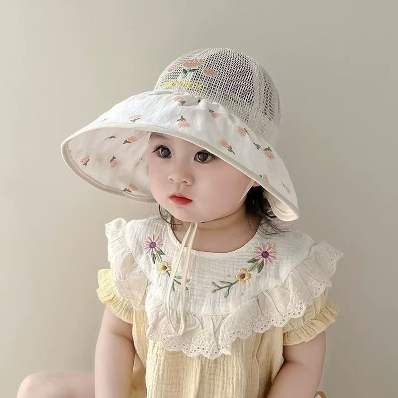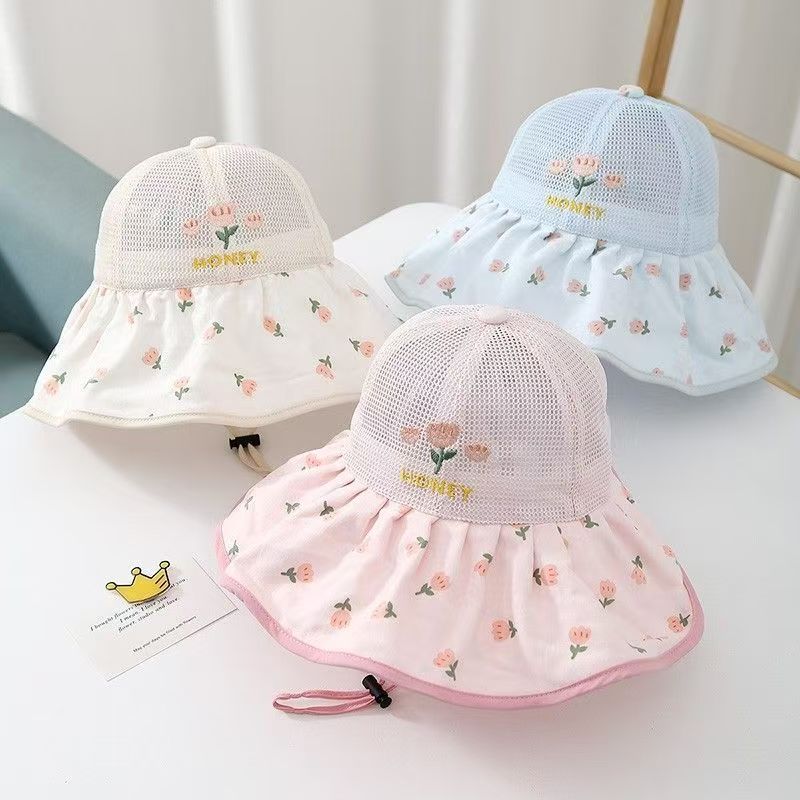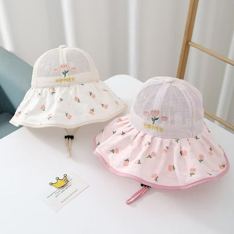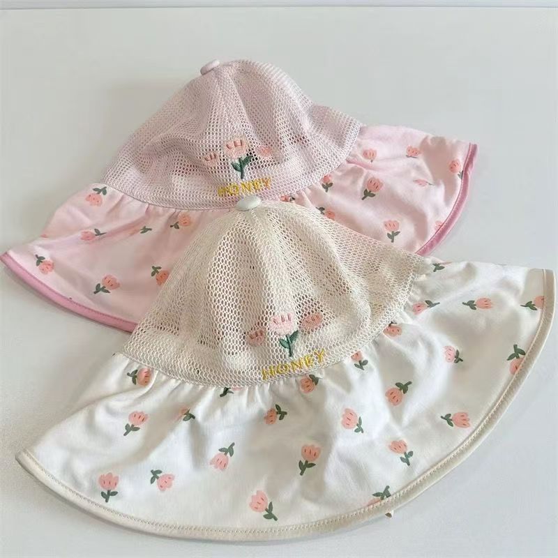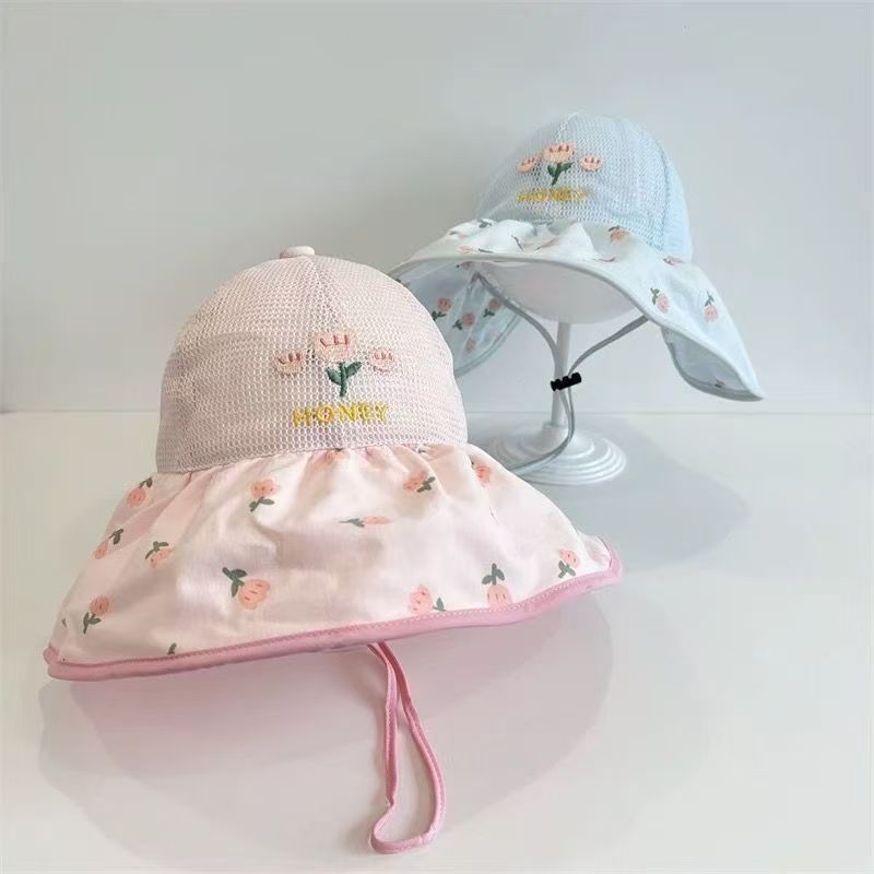 어린이 모자 여름 얇은 통기성 메쉬 큰 챙 태양 보호 모자 아기 소녀 달콤한 꽃 어부 모자