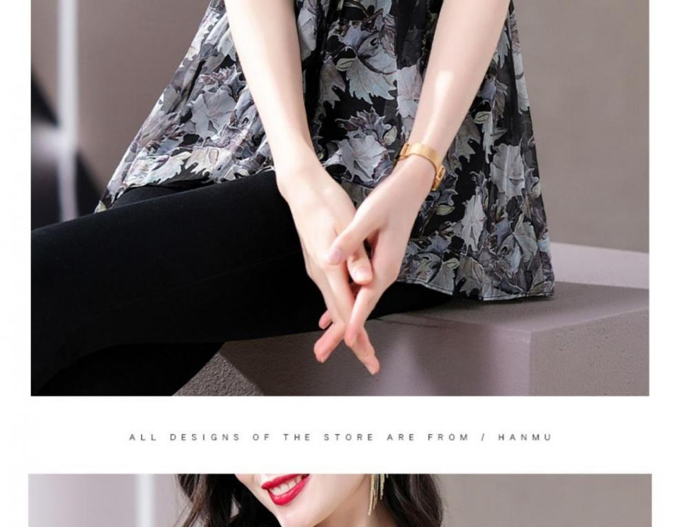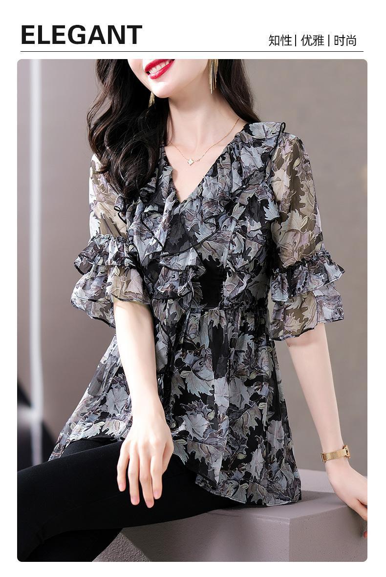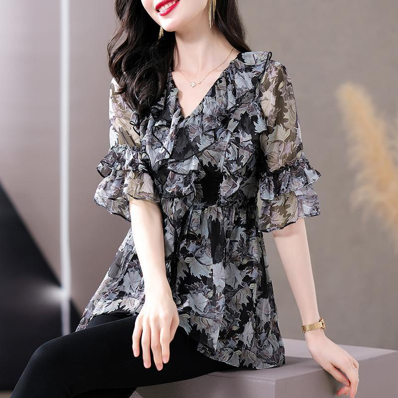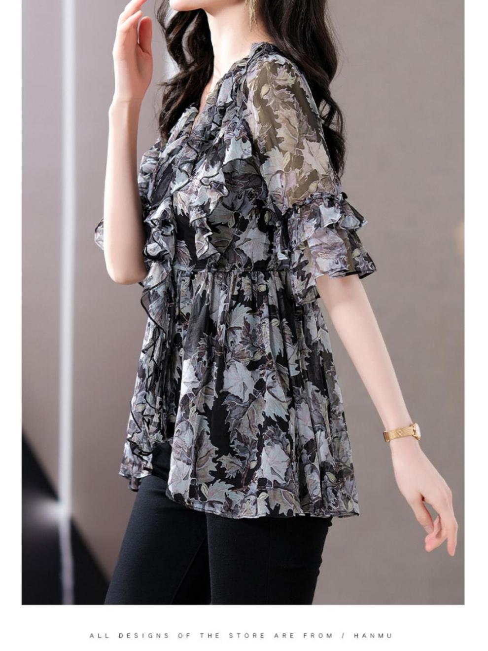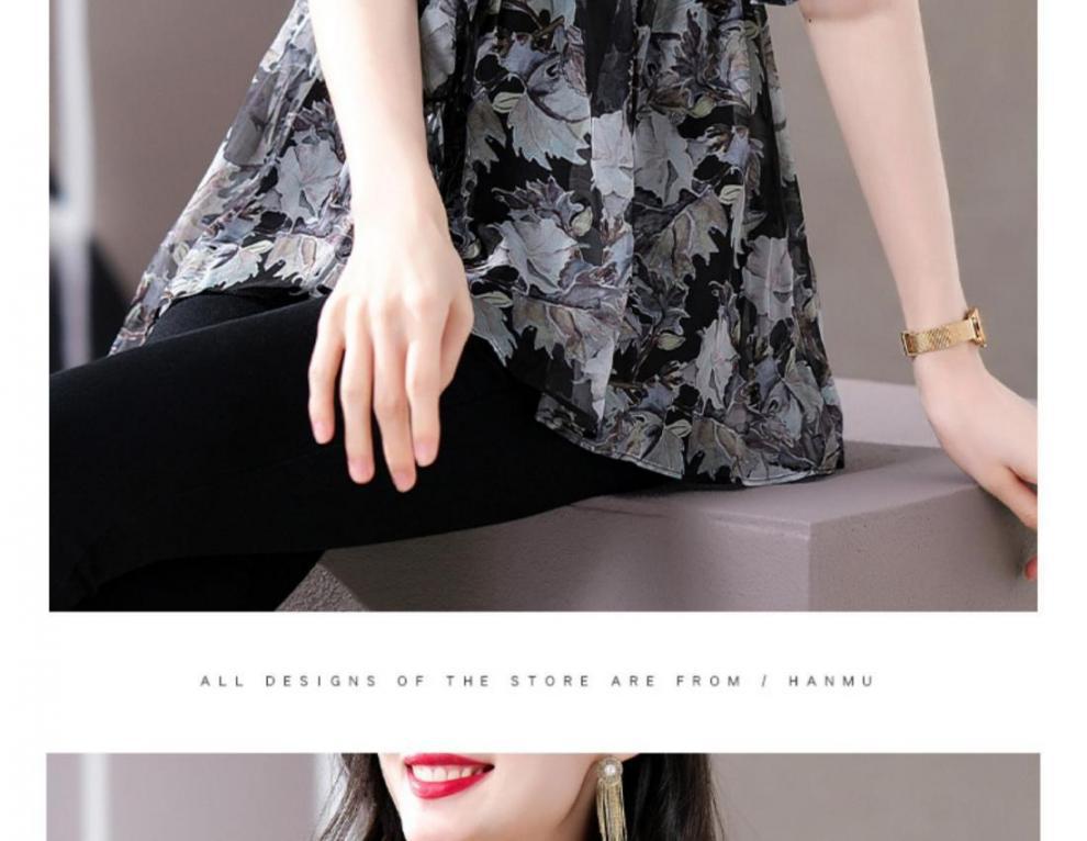 Q7N [스토어 핫셀링] 2025 여름 신작 엄마 반팔 셔츠 루즈한 배 커버 패셔너블 쉬폰 셔츠스토어 가기