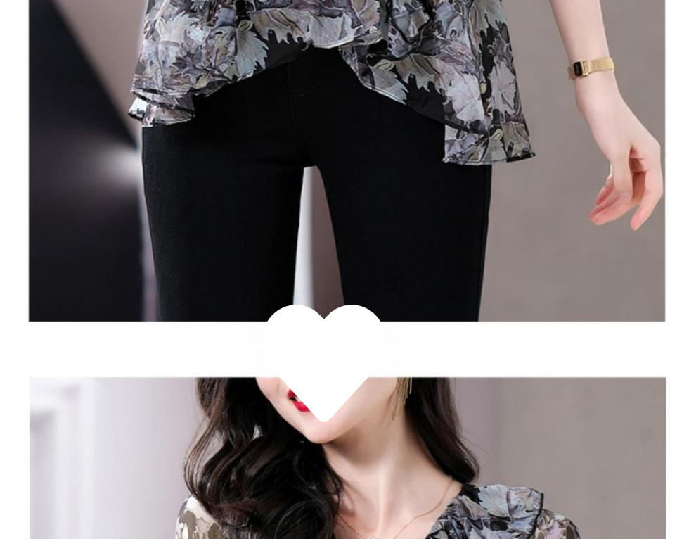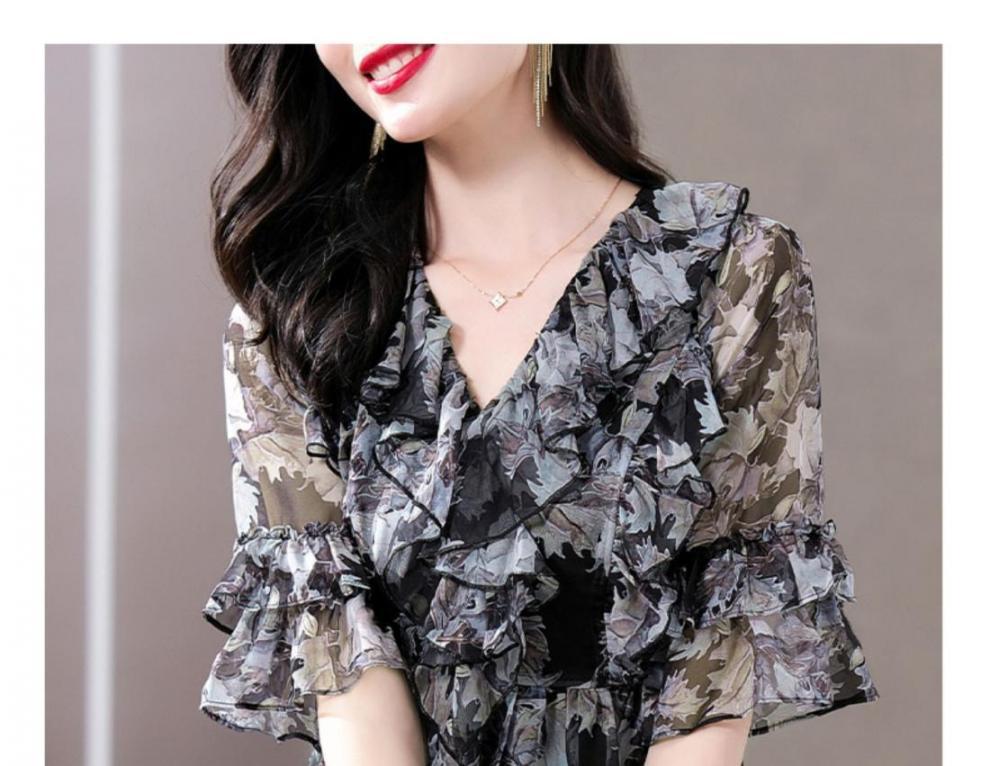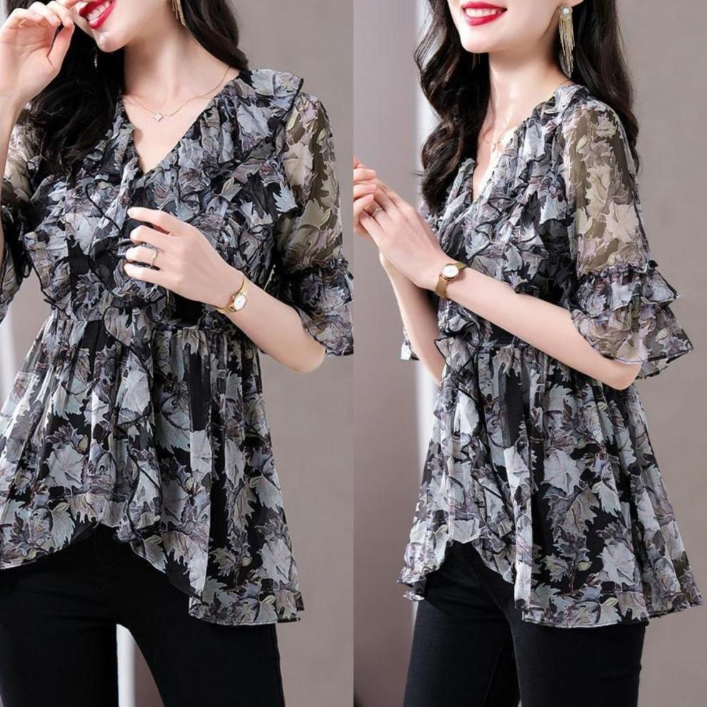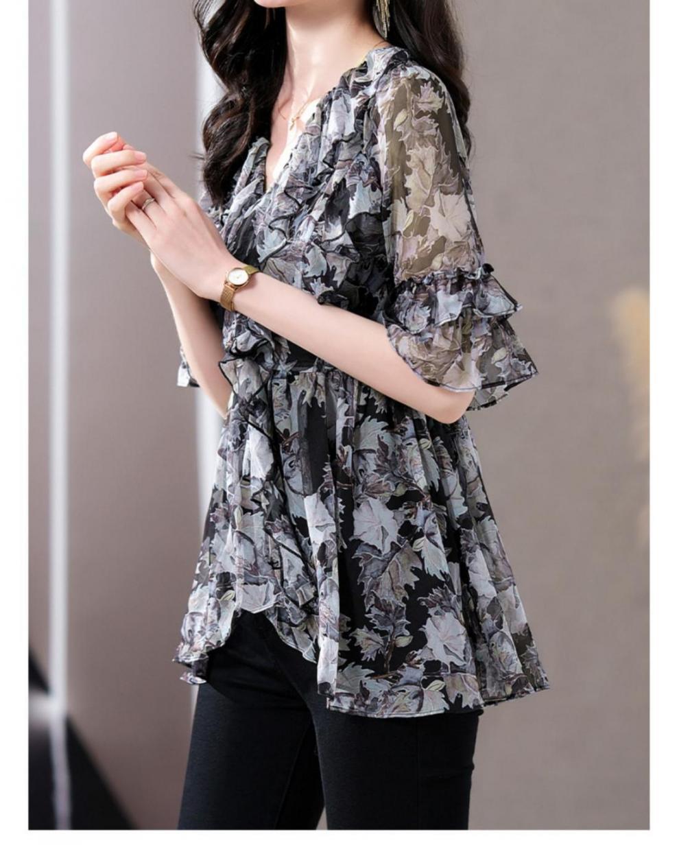 Q7N [스토어 핫셀링] 2025 여름 신작 엄마 반팔 셔츠 루즈한 배 커버 패셔너블 쉬폰 셔츠스토어 가기
