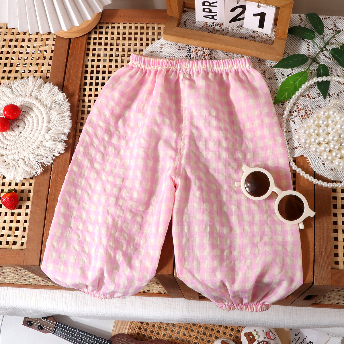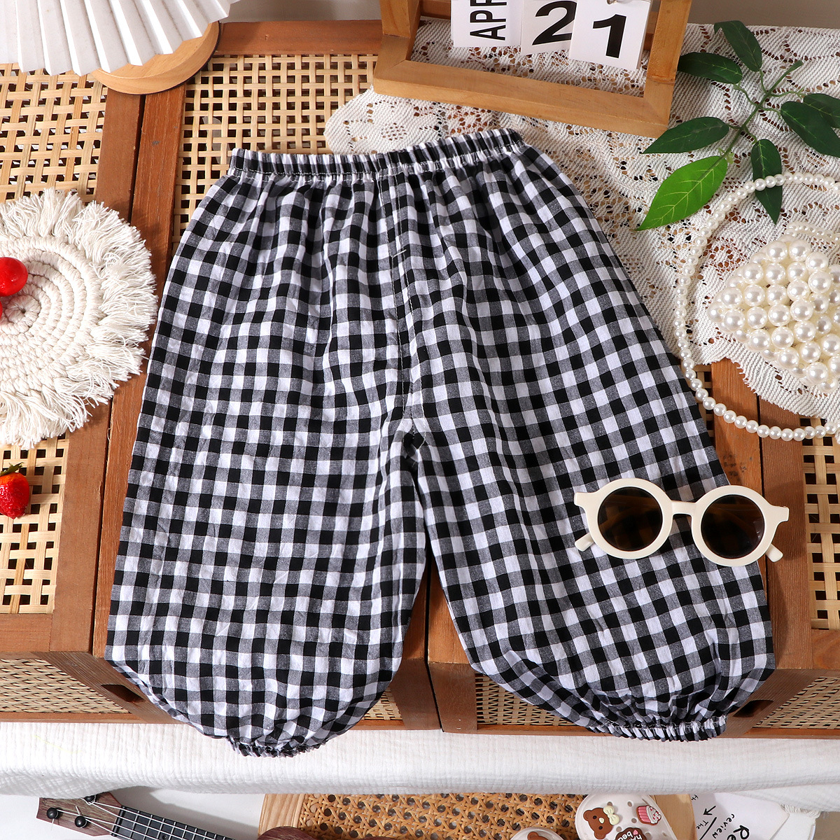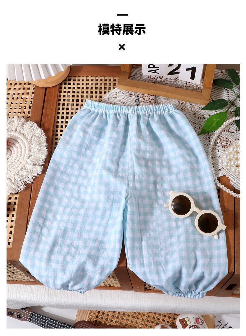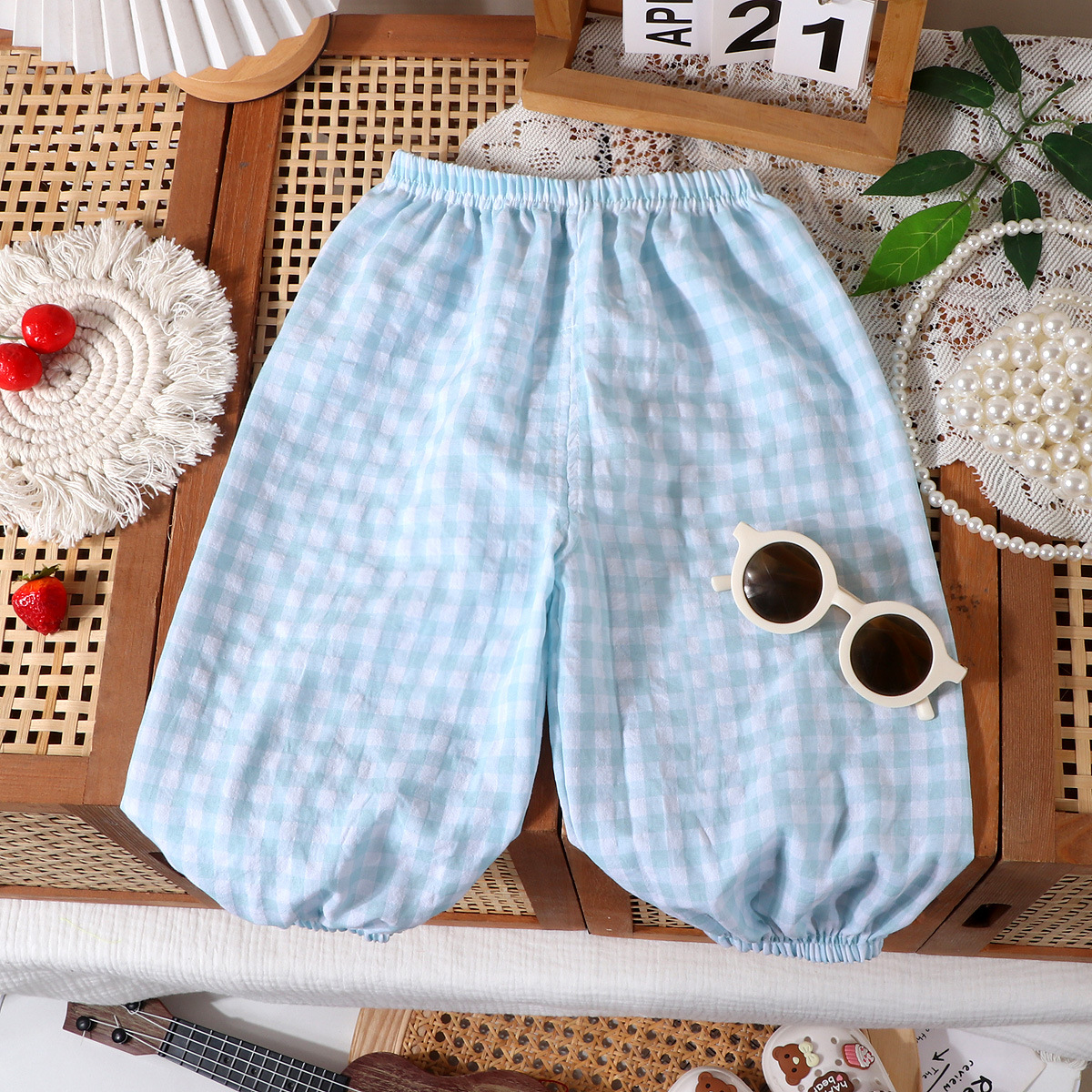 아동용 신상 여름 모기 방지 바지, 남아 및 여아용 베이비 캐주얼 체크 무늬 블루머, 한국식 루즈한 발목 묶음 9부 바지스토어 가기