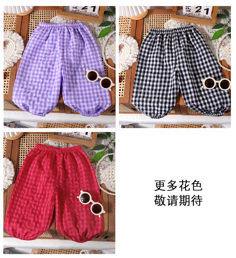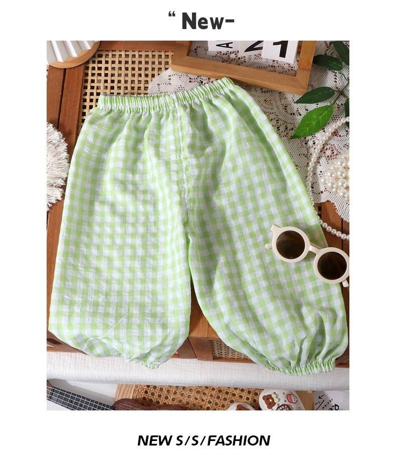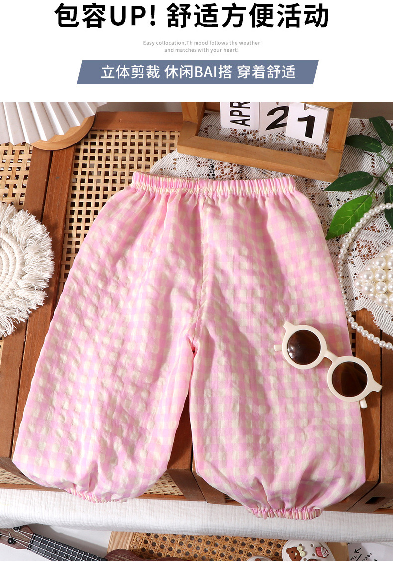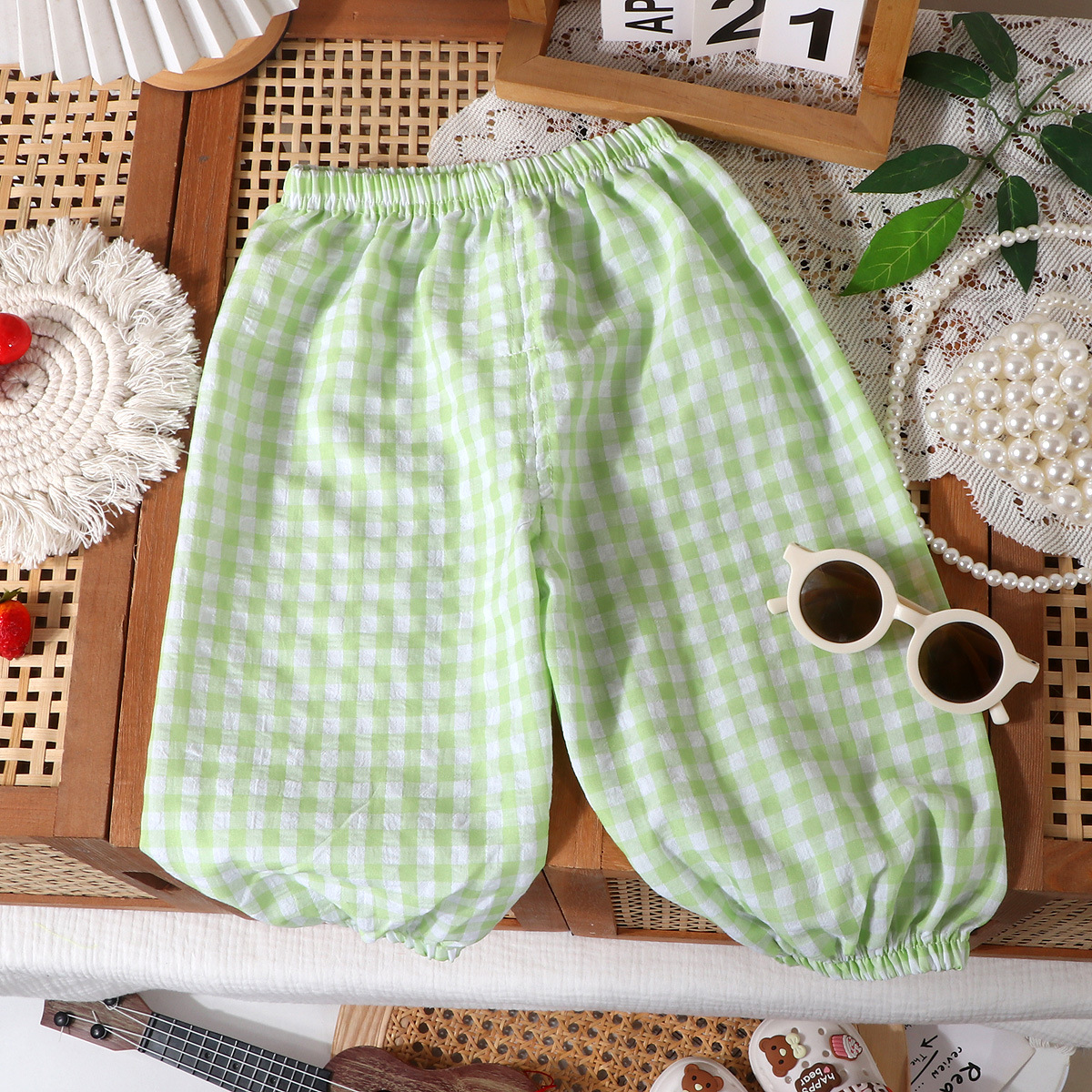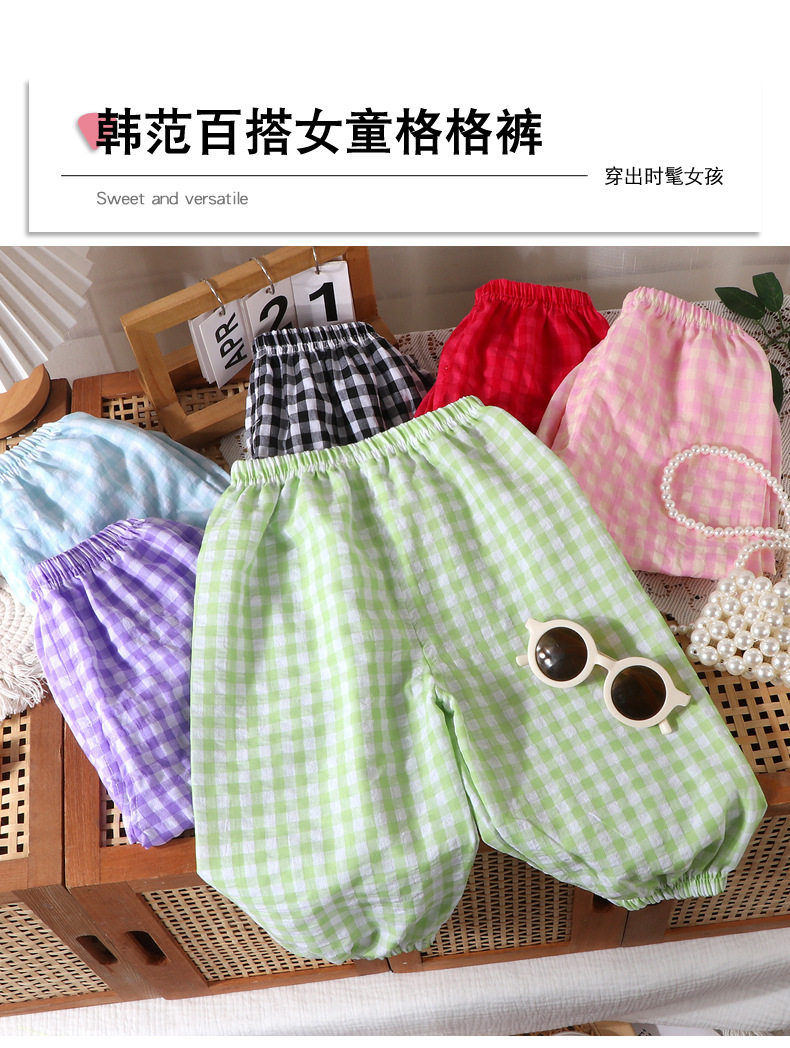 아동용 신상 여름 모기 방지 바지, 남아 및 여아용 베이비 캐주얼 체크 무늬 블루머, 한국식 루즈한 발목 묶음 9부 바지스토어 가기