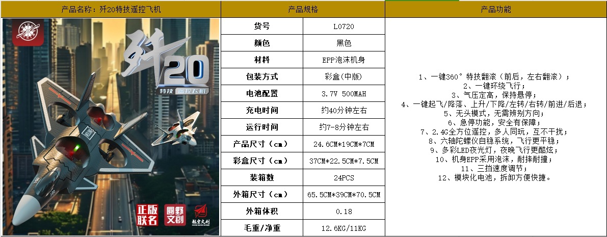 • L0720 정품 인증(단일 제어) J-20 전투기