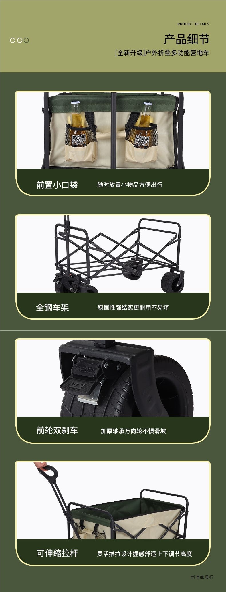 • 캠퍼밴 + 접이식 테이블 - 브레이크가 장착된 대형 오프로드 휠(카키색)
