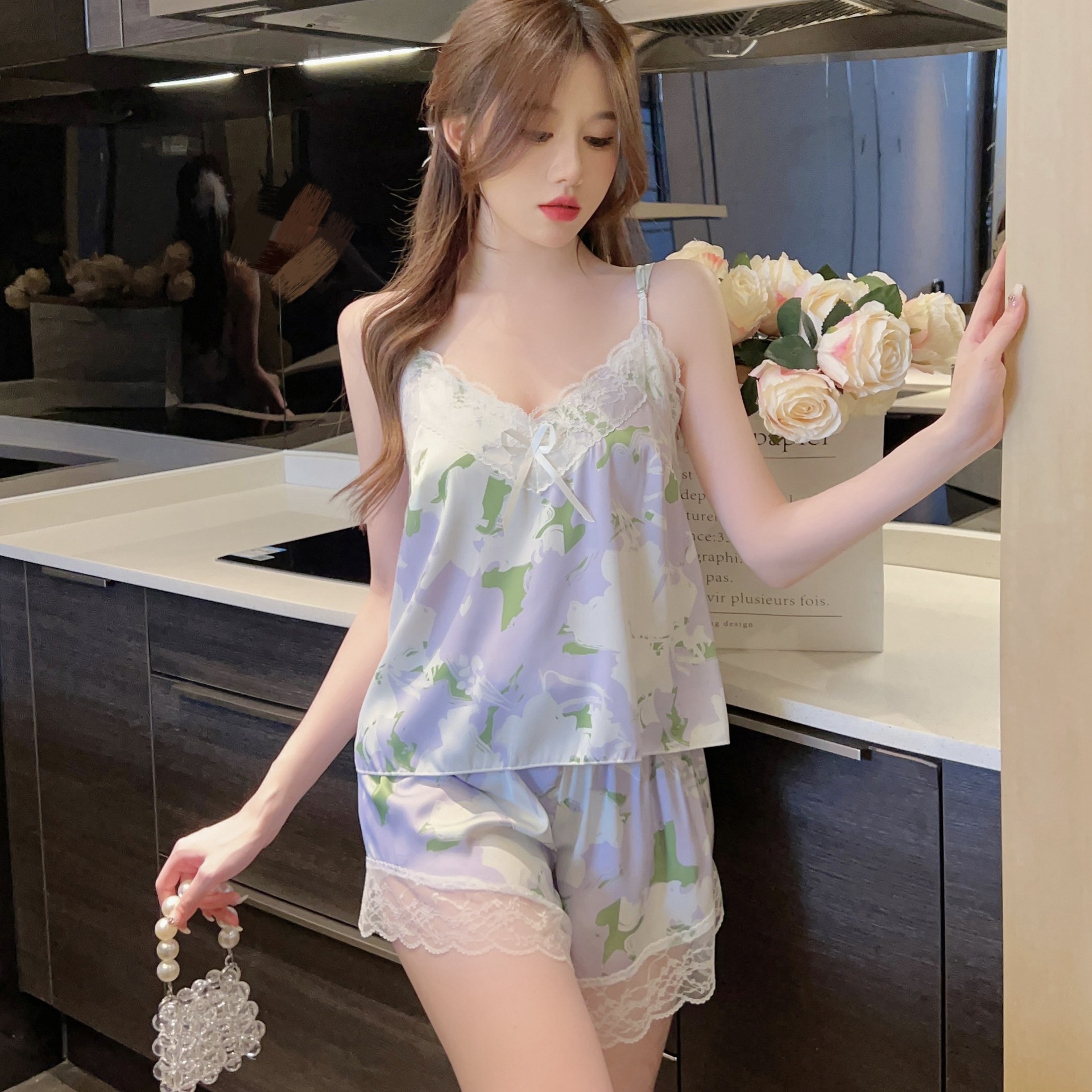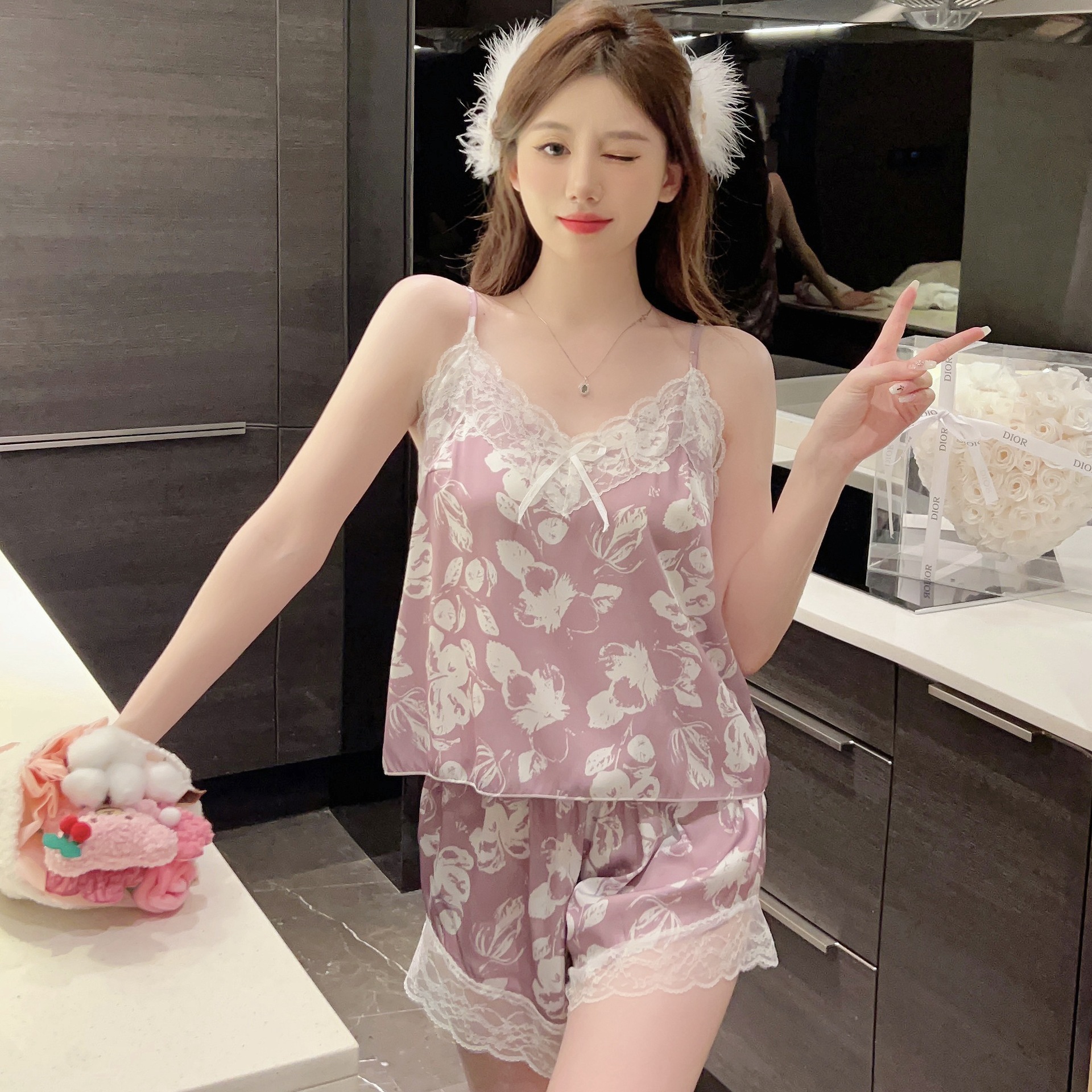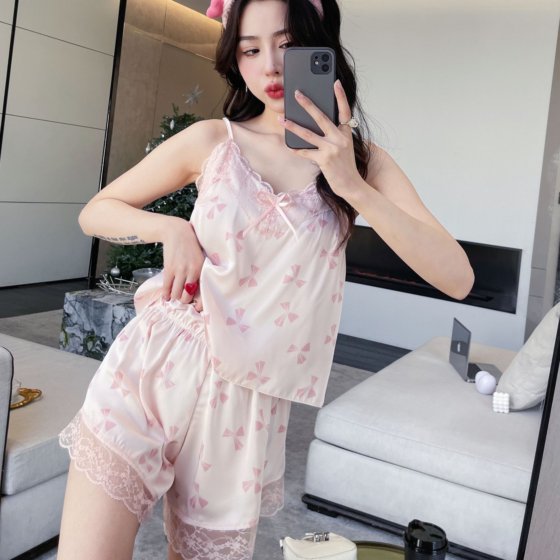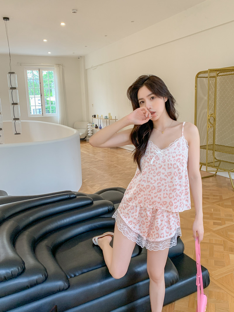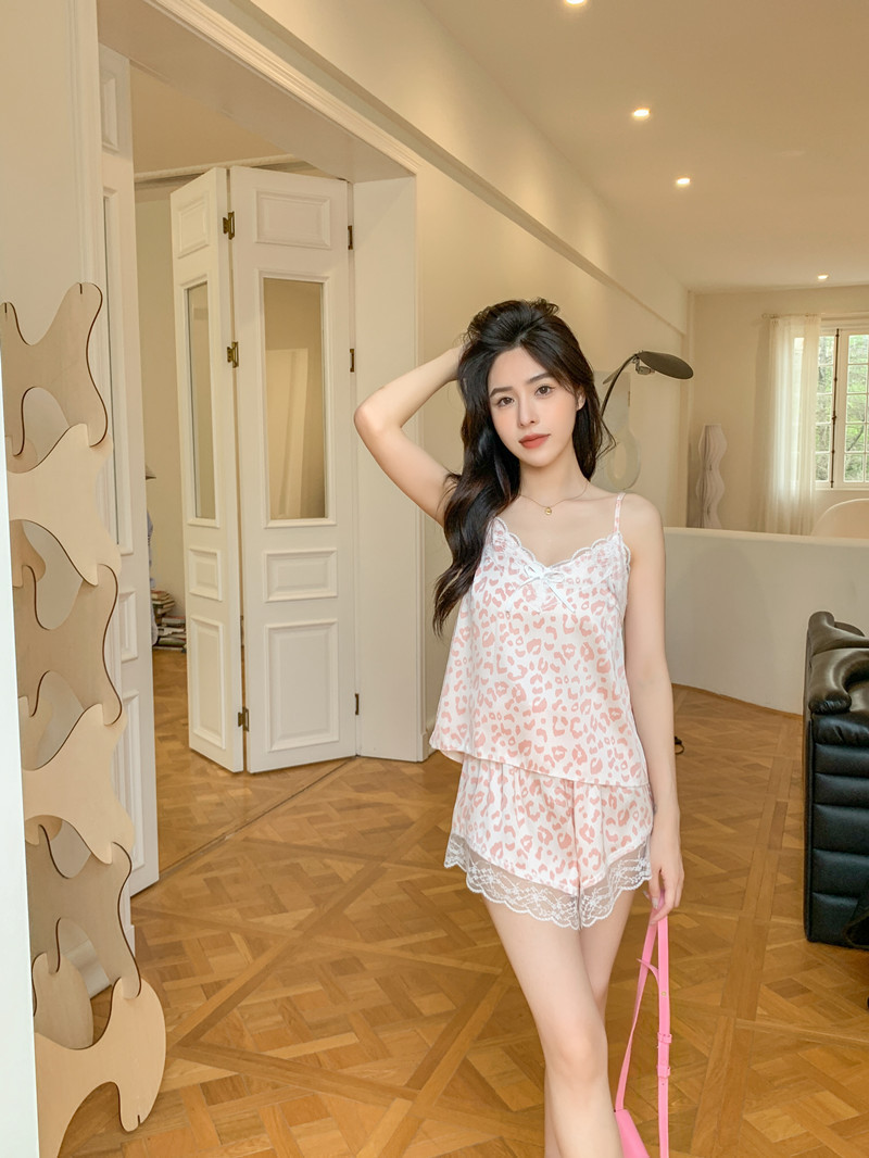 반바지 아이스 실크 파자마 여성 여름 슬링 순수 핑크 소녀 레오파드 무늬 잠옷 여성 홈 옷 세트 섹시스토어 가기