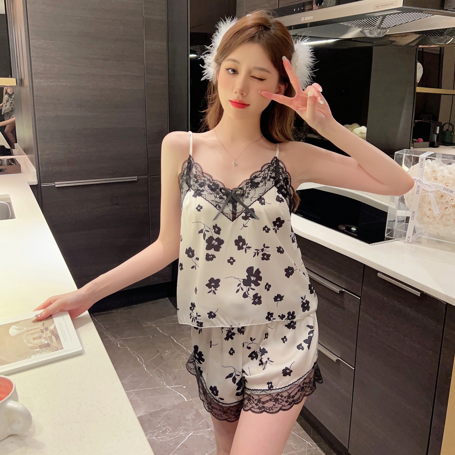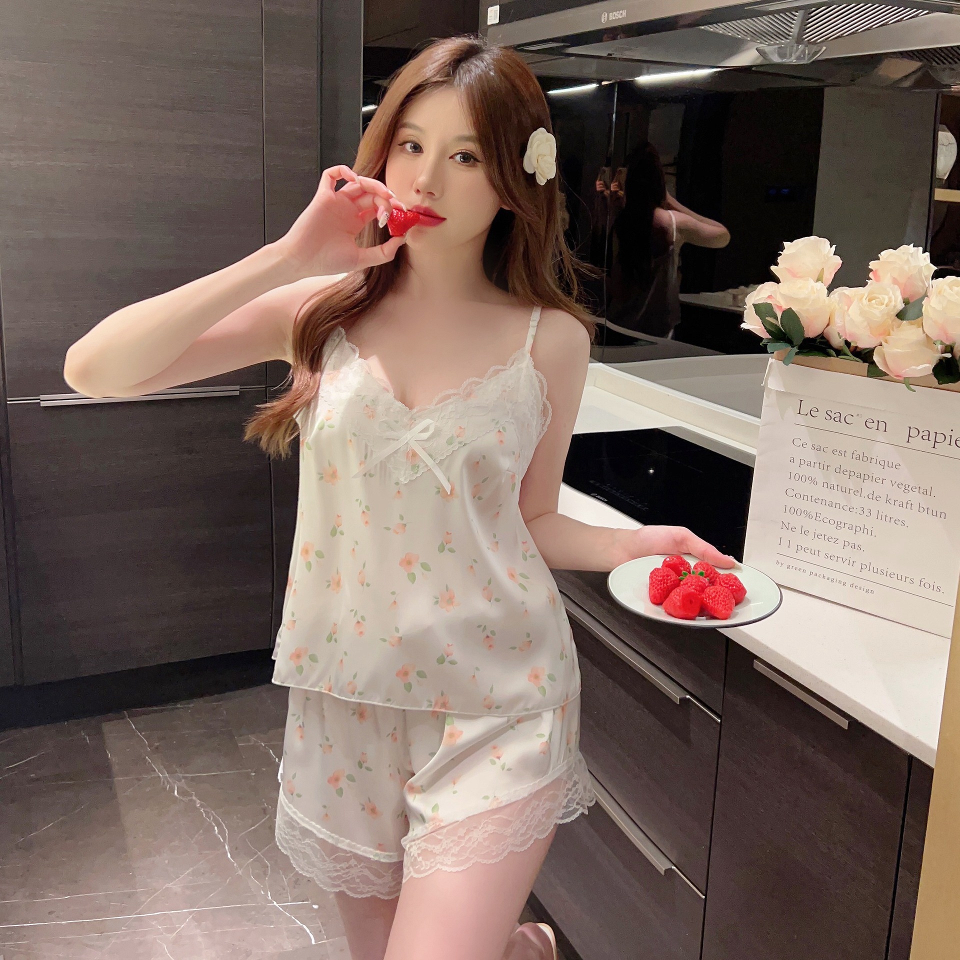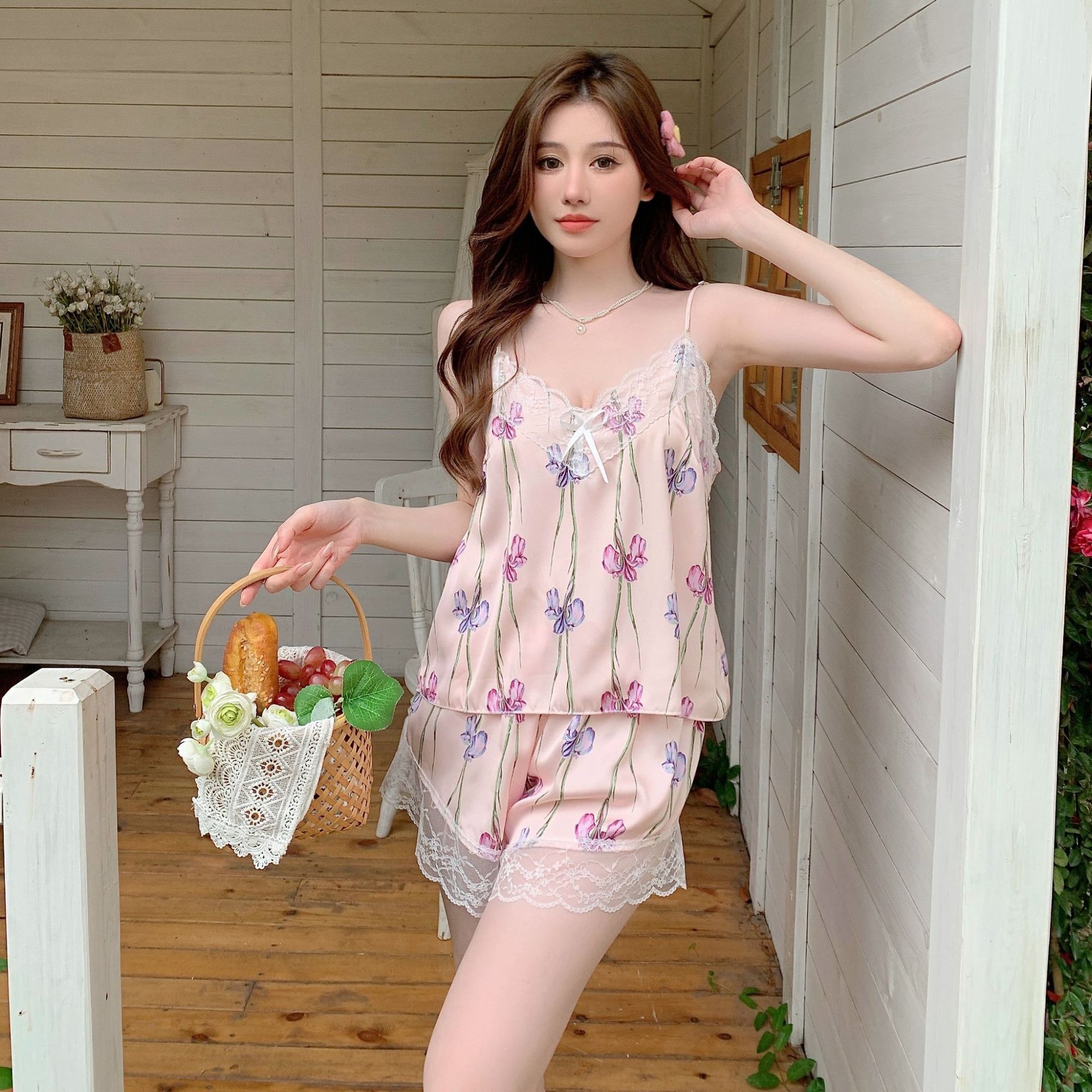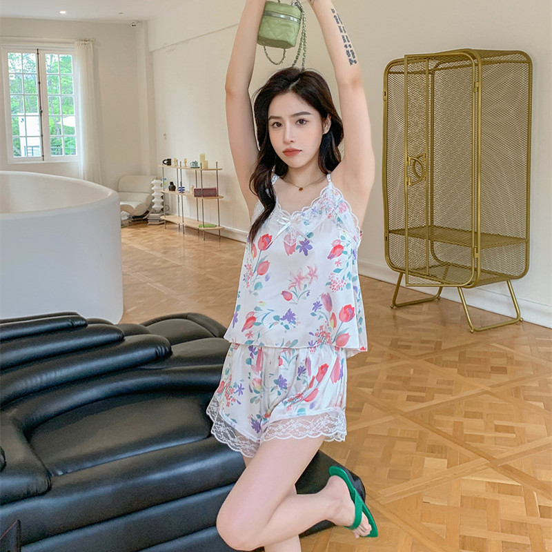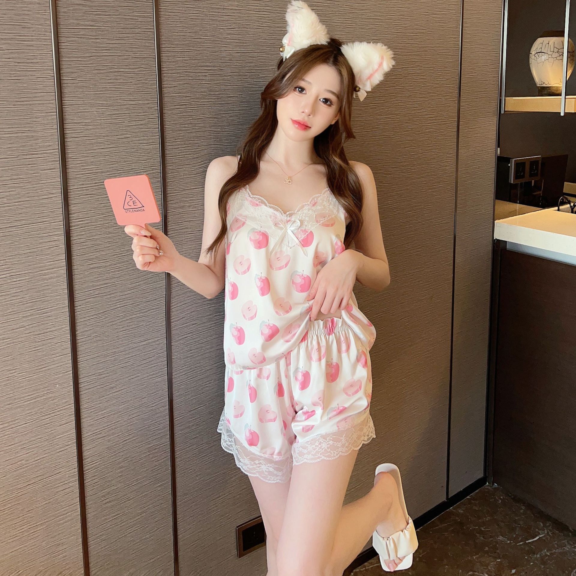 반바지 아이스 실크 파자마 여성 여름 슬링 순수 핑크 소녀 레오파드 무늬 잠옷 여성 홈 옷 세트 섹시스토어 가기