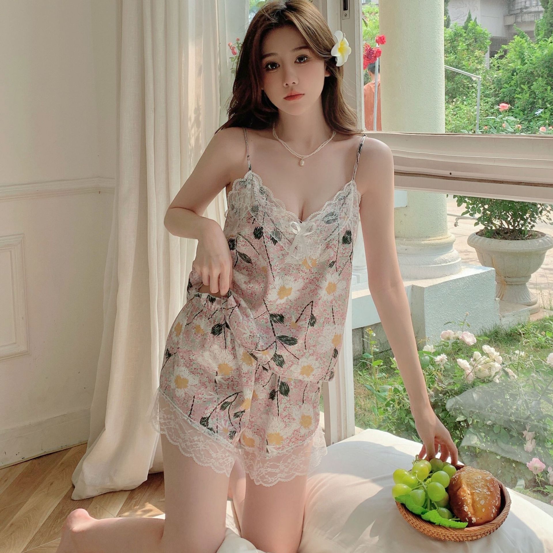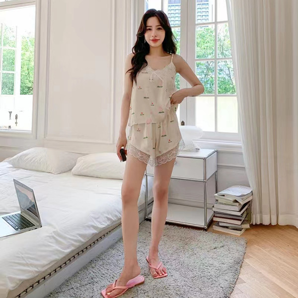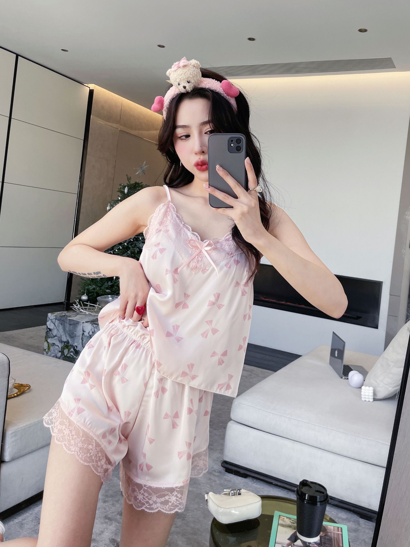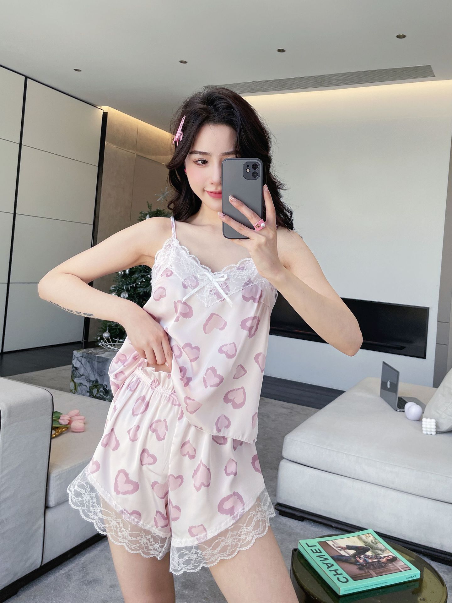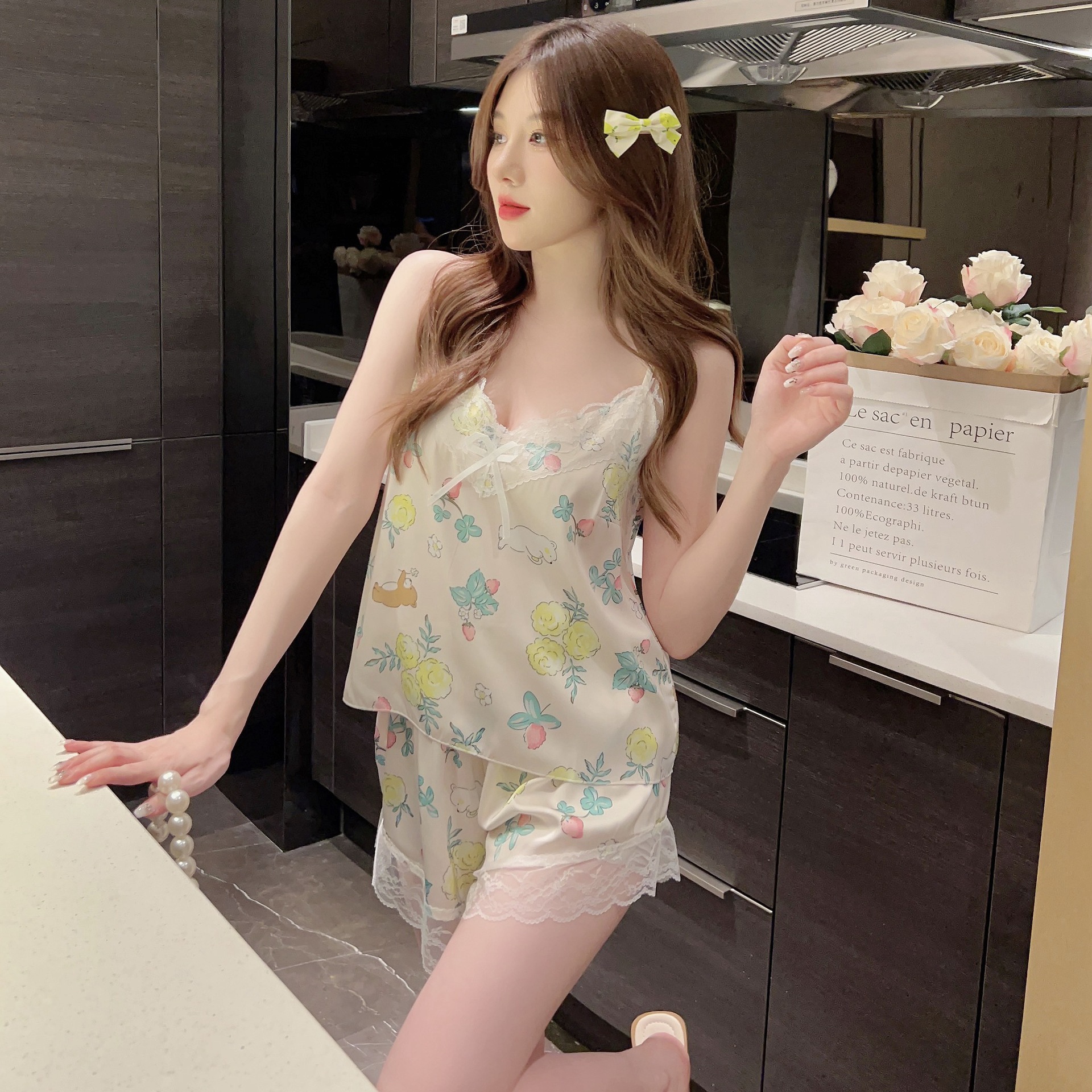 반바지 아이스 실크 파자마 여성 여름 슬링 순수 핑크 소녀 레오파드 무늬 잠옷 여성 홈 옷 세트 섹시스토어 가기