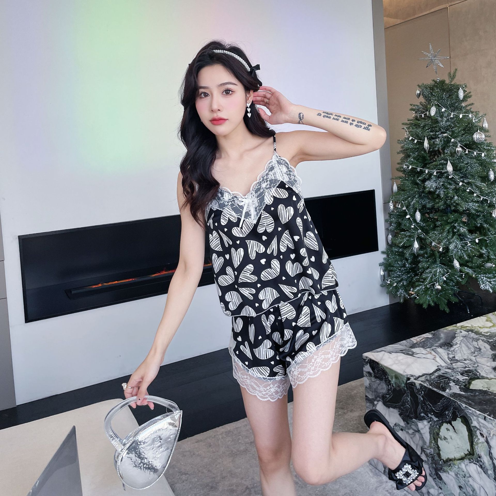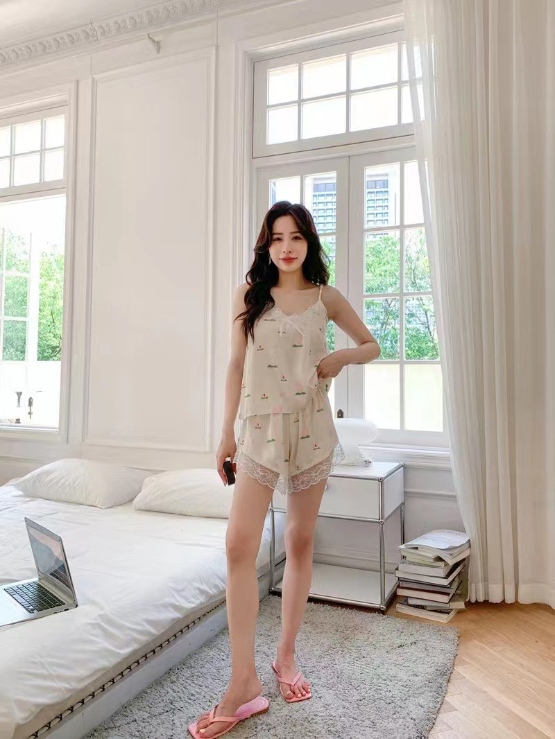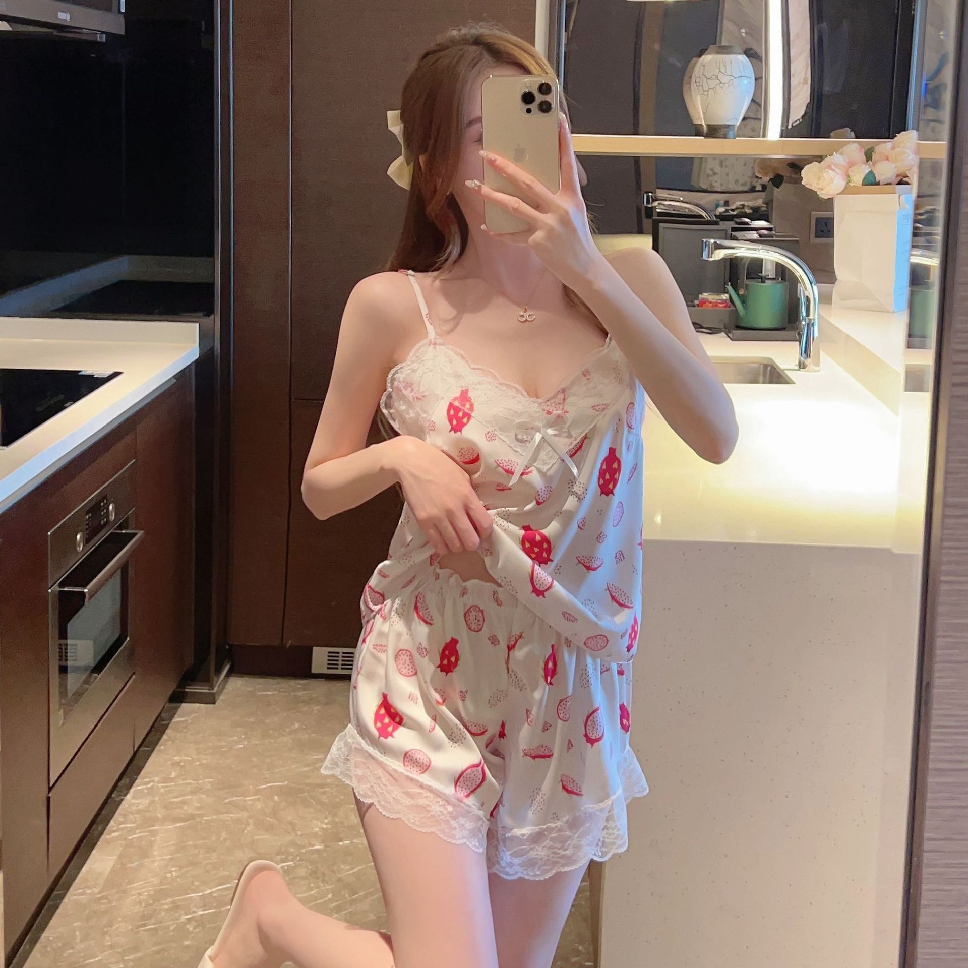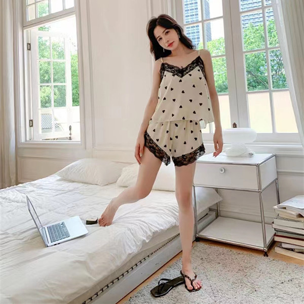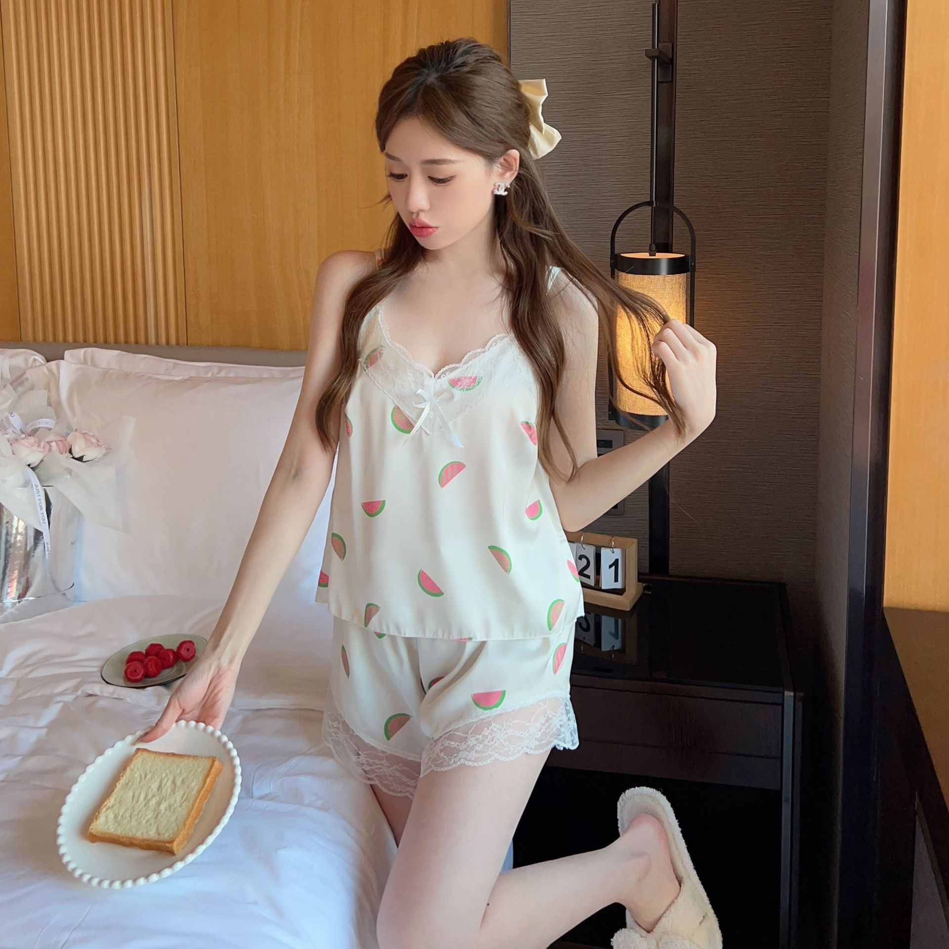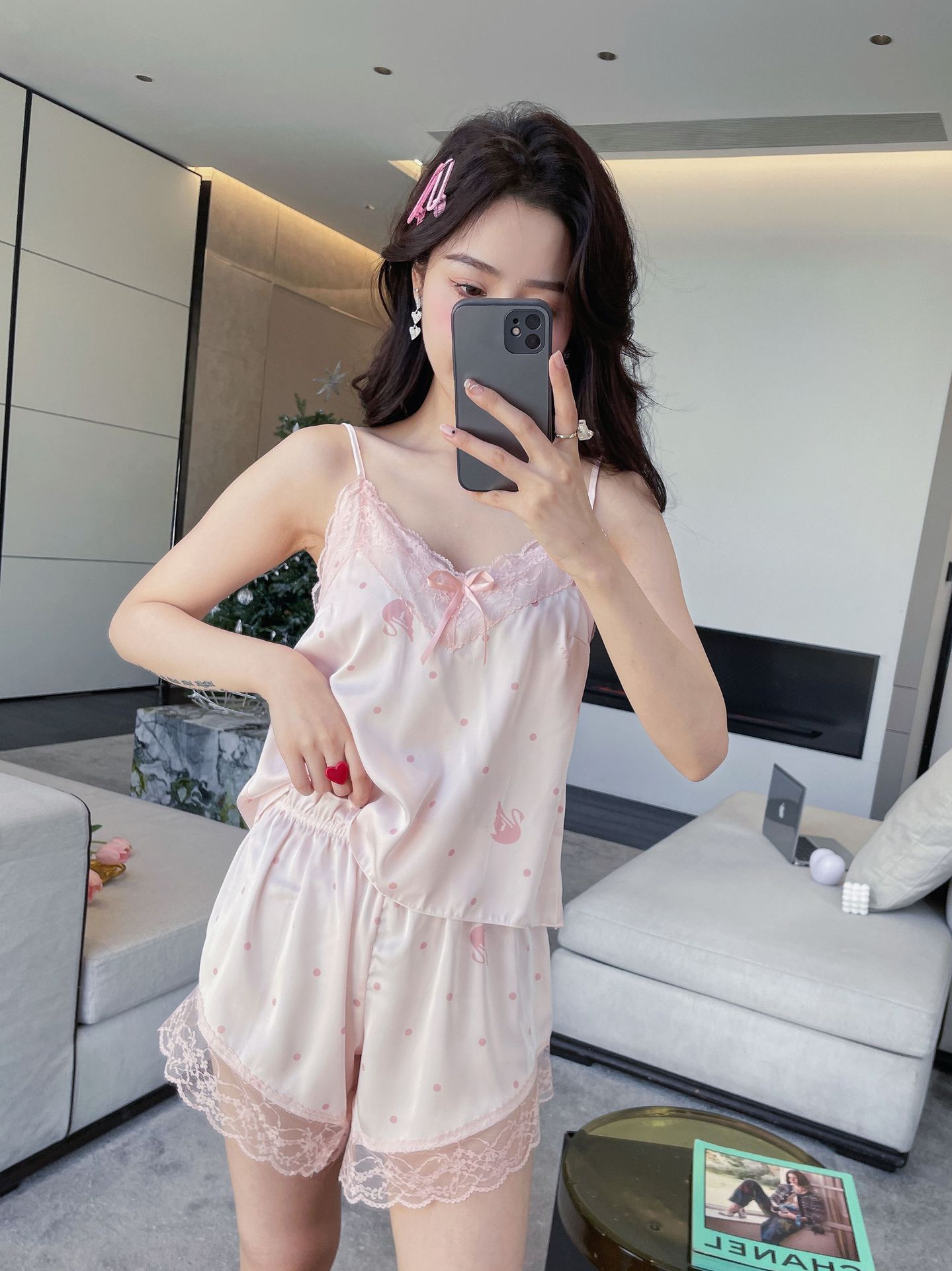 반바지 아이스 실크 파자마 여성 여름 슬링 순수 핑크 소녀 레오파드 무늬 잠옷 여성 홈 옷 세트 섹시스토어 가기