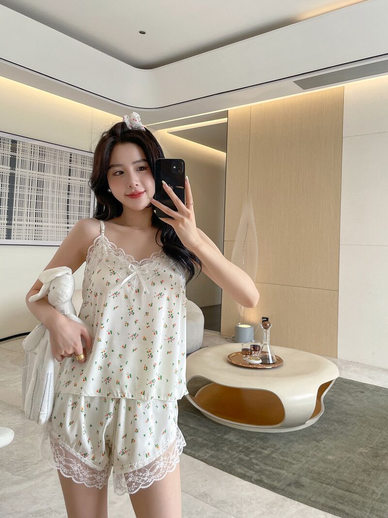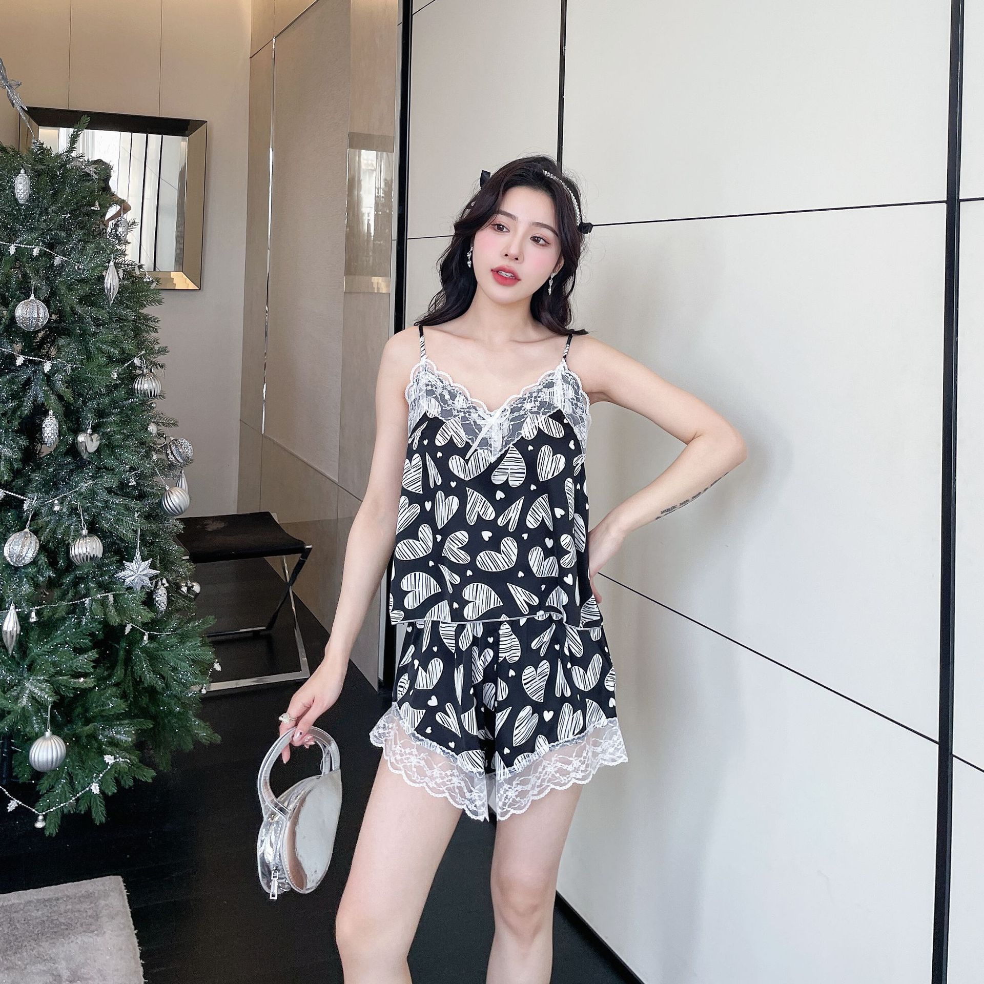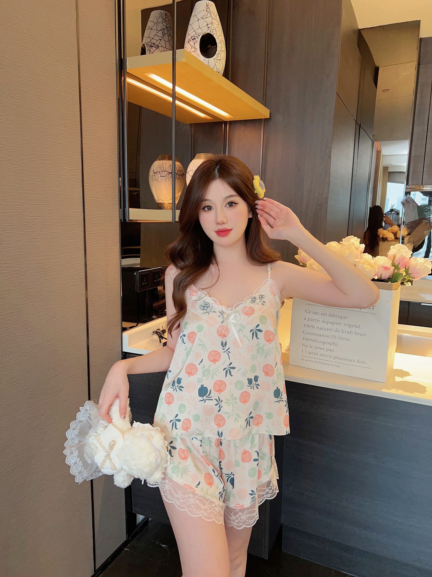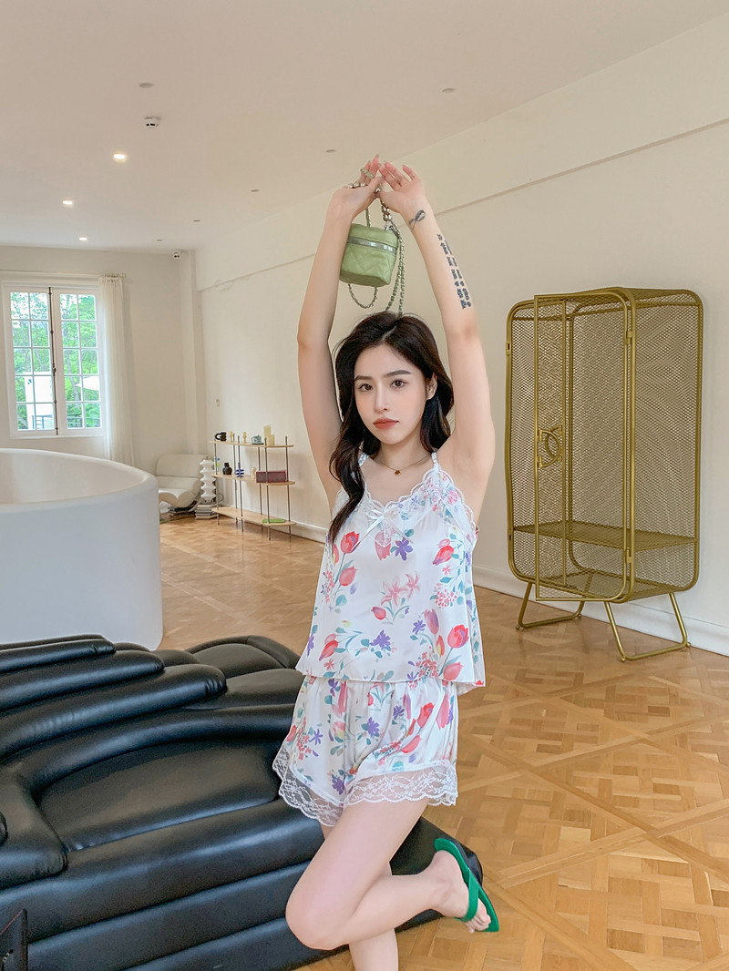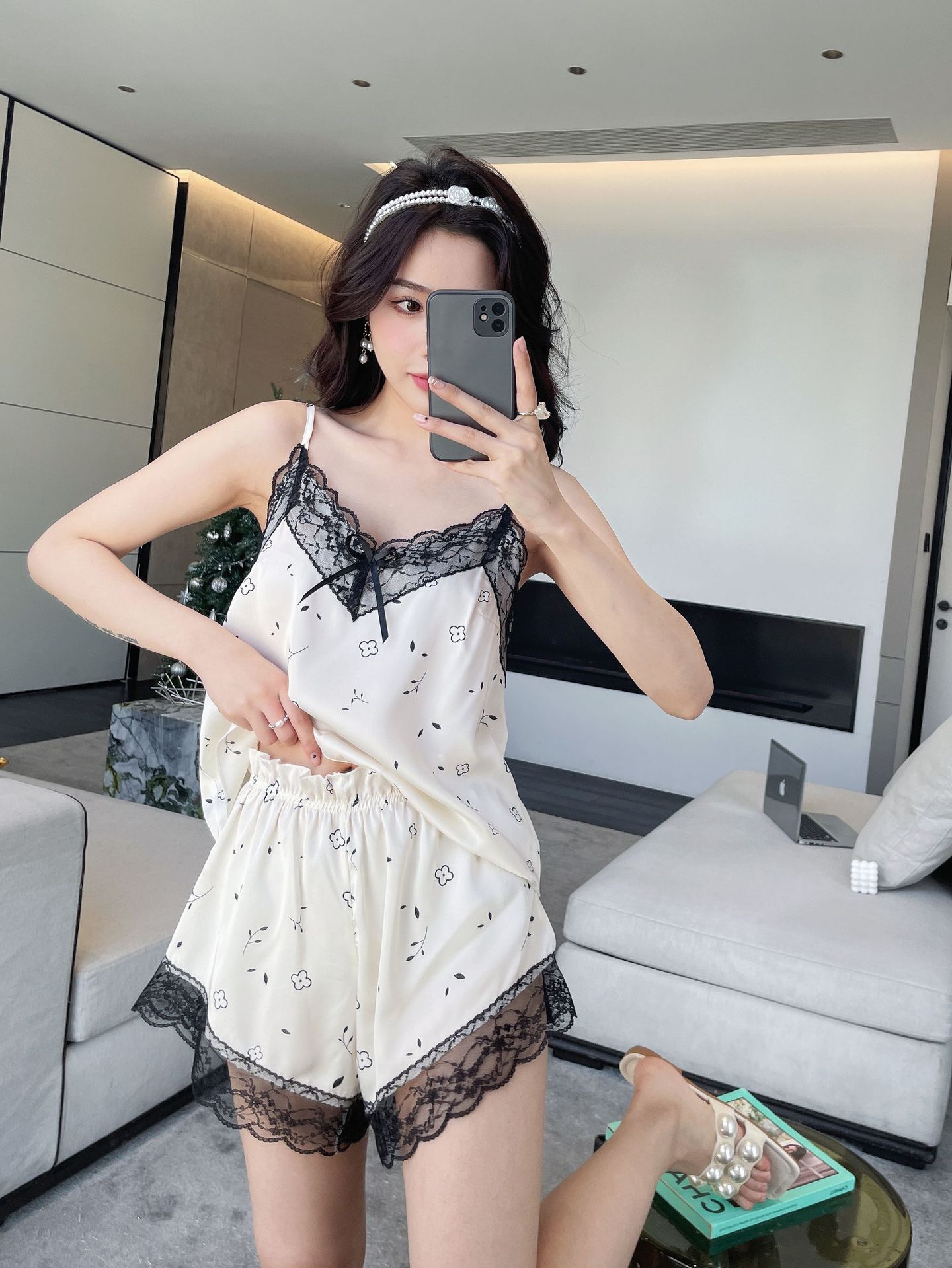 반바지 아이스 실크 파자마 여성 여름 슬링 순수 핑크 소녀 레오파드 무늬 잠옷 여성 홈 옷 세트 섹시스토어 가기